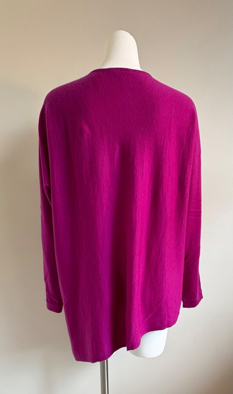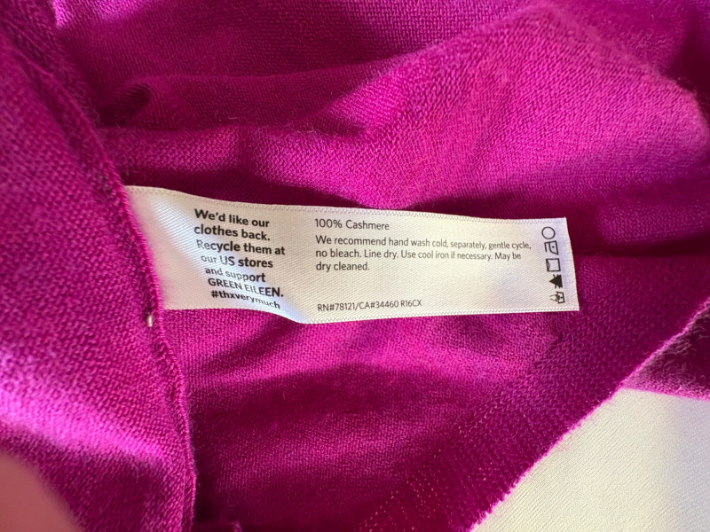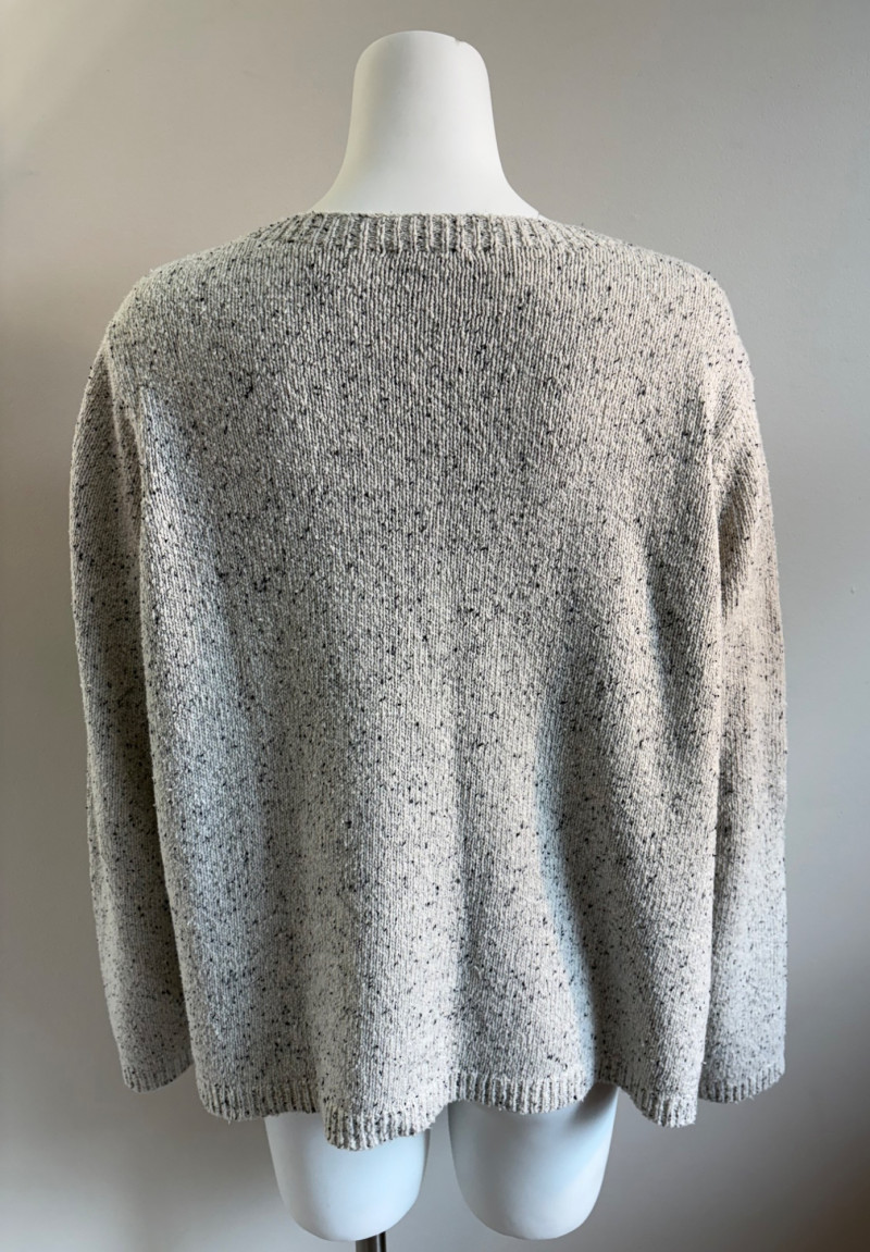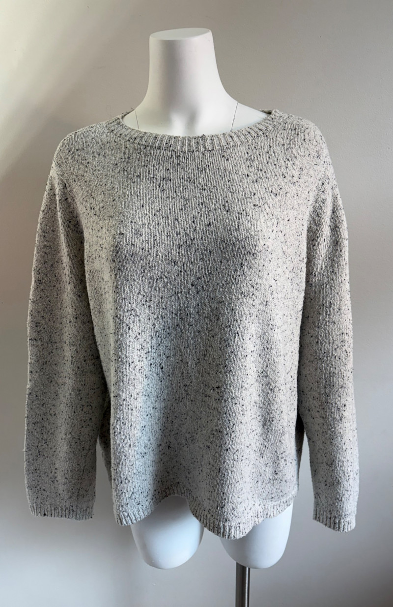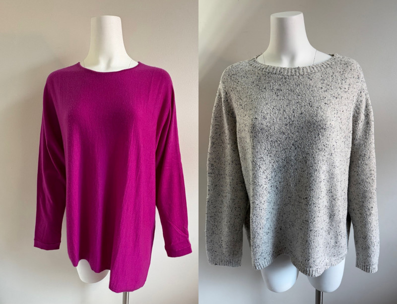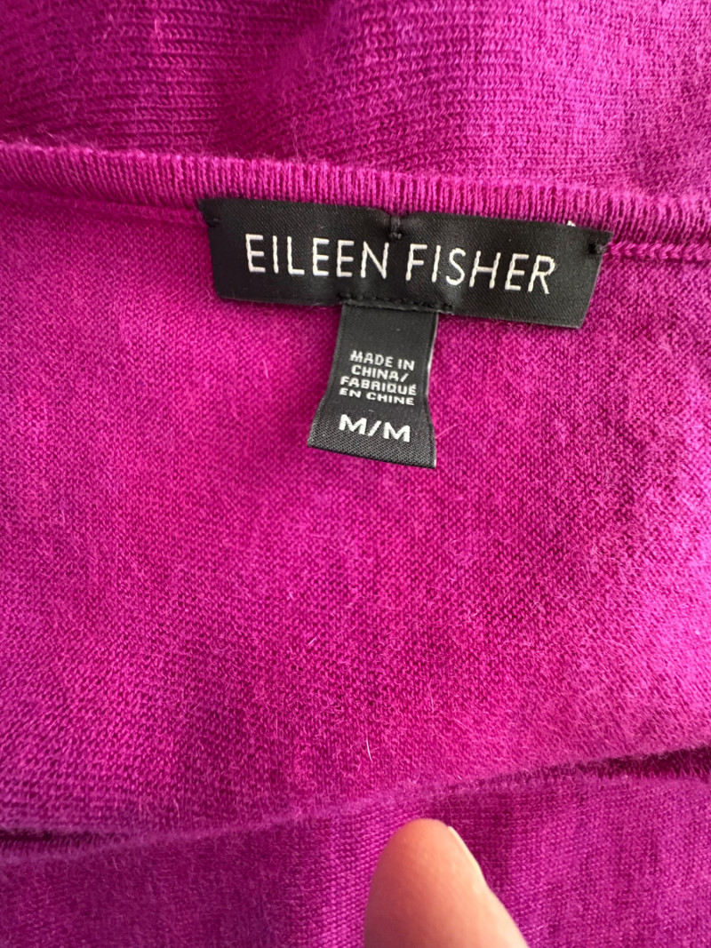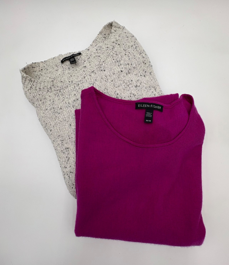Two lovely sweaters from Eileen Fisher. Rich magenta-colored sweater with a super soft hand, scoop neck, fine knit cuffs, narrow ribbed collar, no arm scythe seams, and asymmetrical slanted hem. In excellent condition. 100% cashmere. Measures 24" pit to pit and 27" from center back neck seam to back hemline. Size tag says M. Mid-weight crewneck speckled sweater has narrow ribbed collar, hem, and cuffs. In excellent condition. 70% recycled cotton with 27% recycled nylon and 3% other fibers. Measures 24" pit to pit and 22.5" from center back neck seam to back hemline. Size tag says XL.