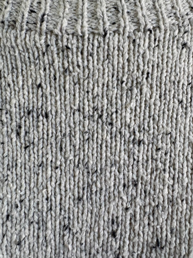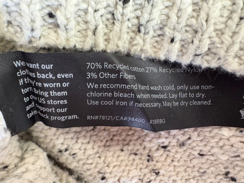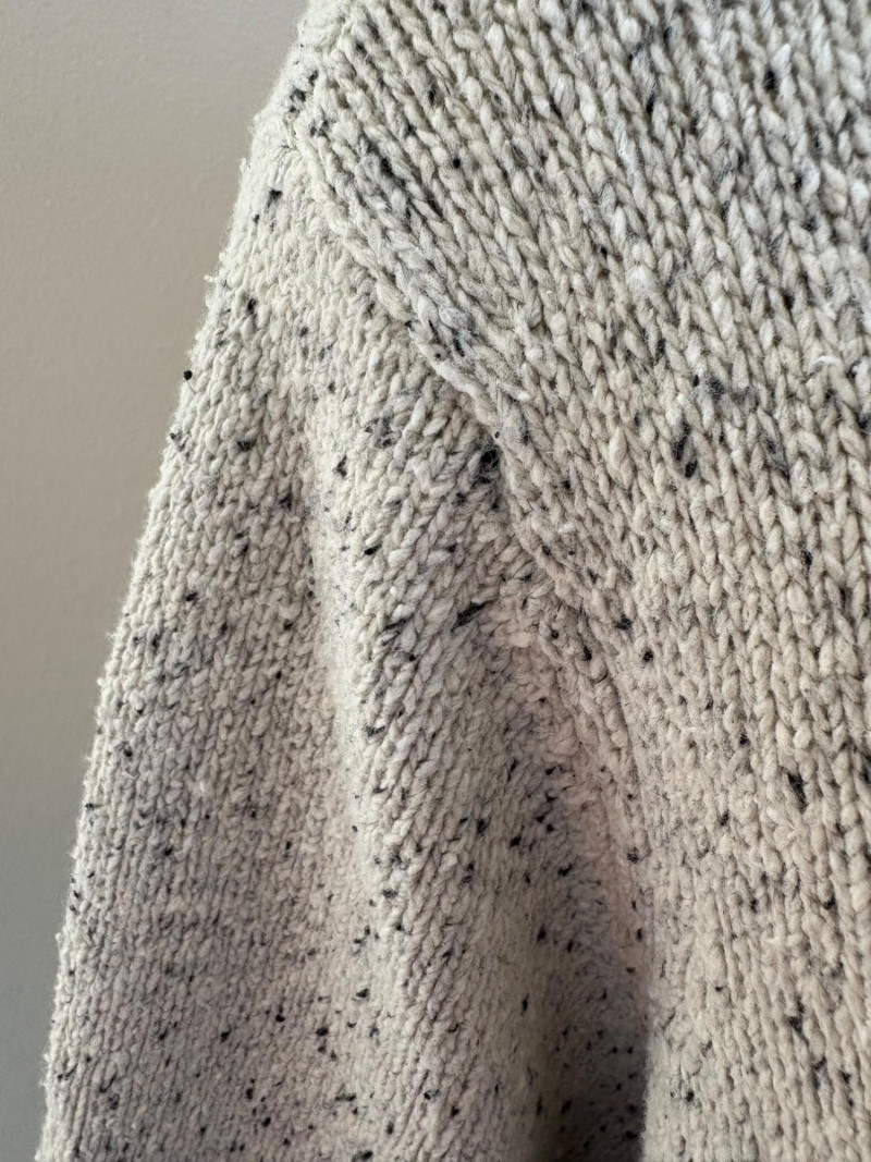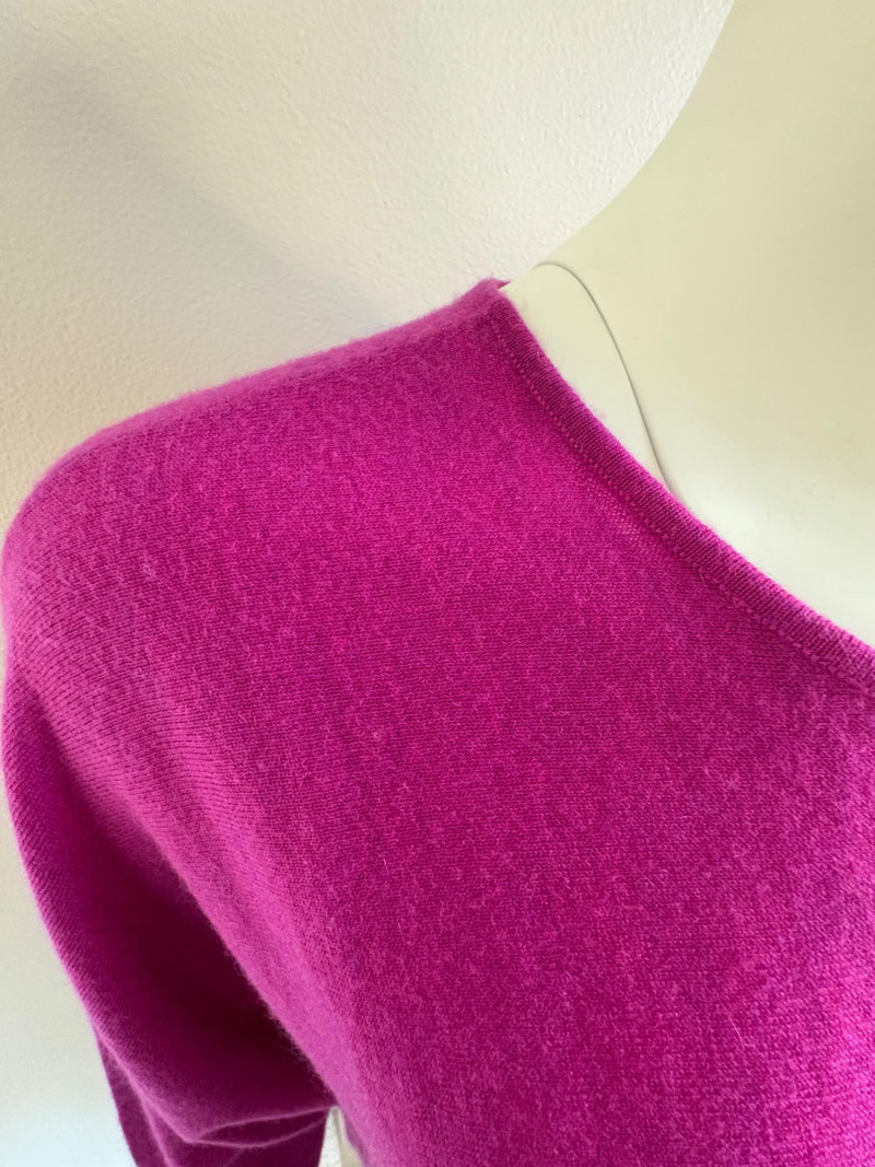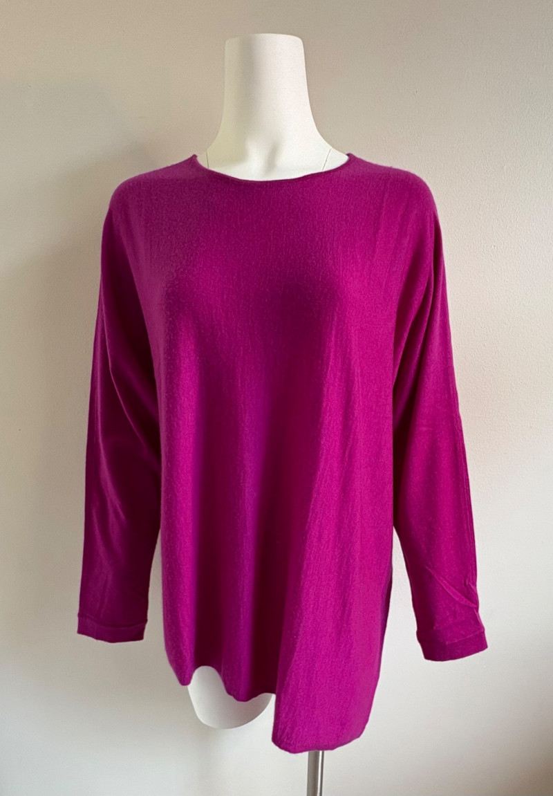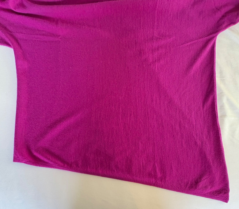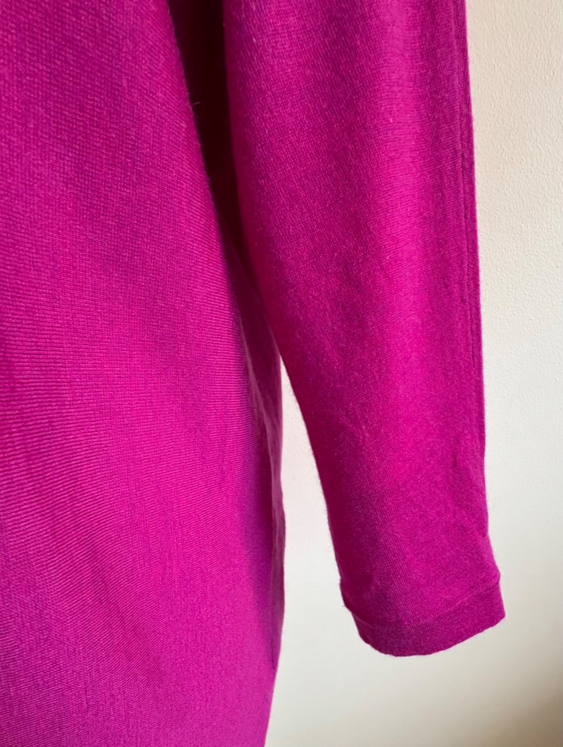 Two lovely sweaters from Eileen Fisher. Rich magenta-colored sweater with a super soft hand, scoop neck, fine knit cuffs, narrow ribbed collar, no arm scythe seams, and asymmetrical slanted hem. In excellent condition. 100% cashmere. Measures 24" pit to pit and 27" from center back neck seam to back hemline. Size tag says M. Mid-weight crewneck speckled sweater has narrow ribbed collar, hem, and cuffs. In excellent condition. 70% recycled cotton with 27% recycled nylon and 3% other fibers. Measures 24" pit to pit and 22.5" from center back neck seam to back hemline. Size tag says XL.