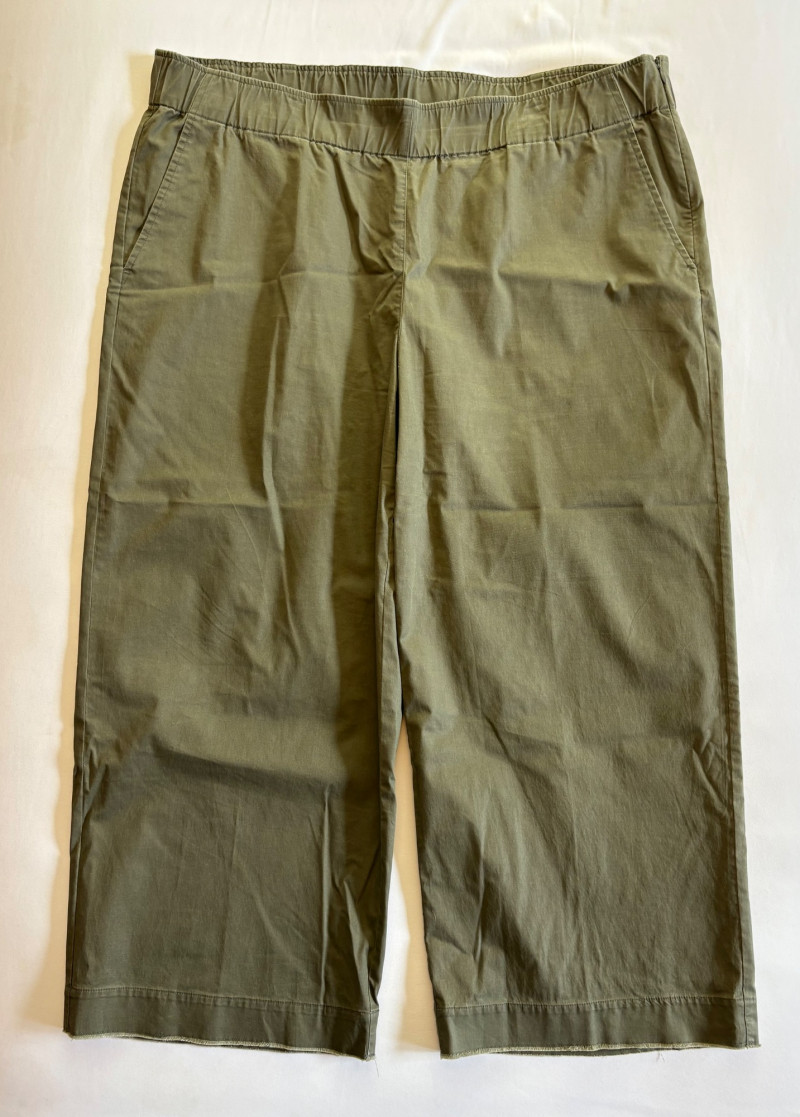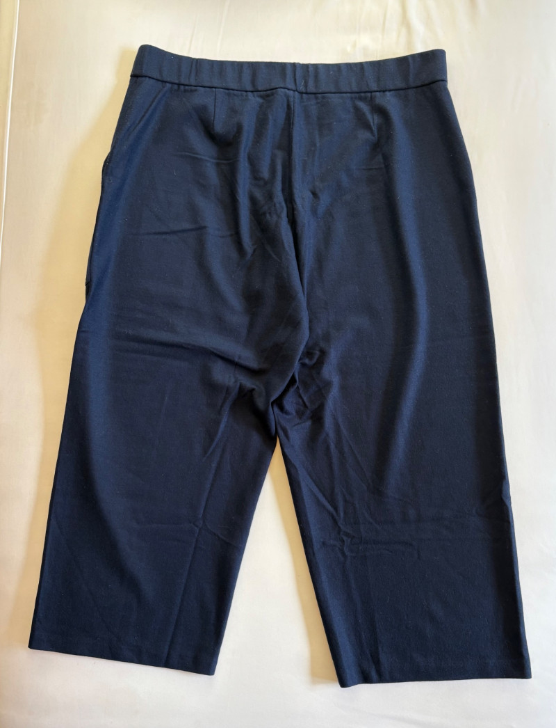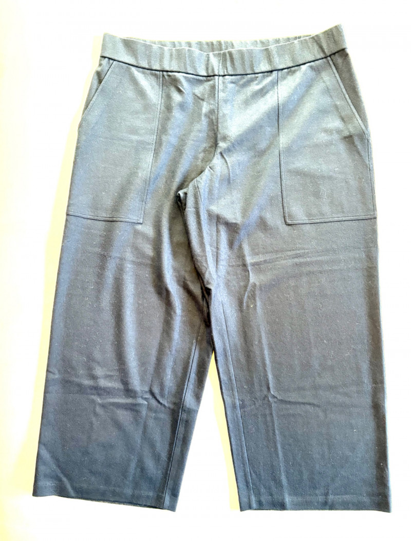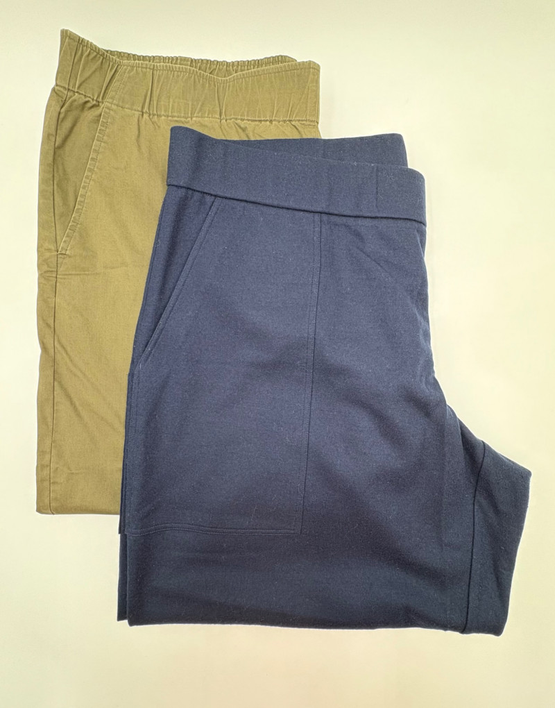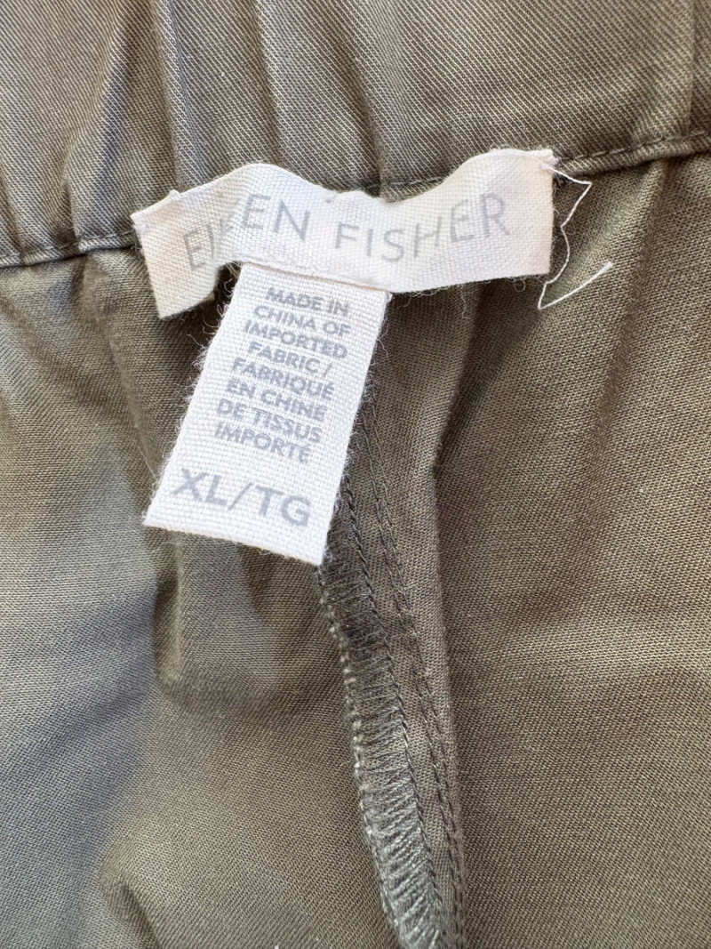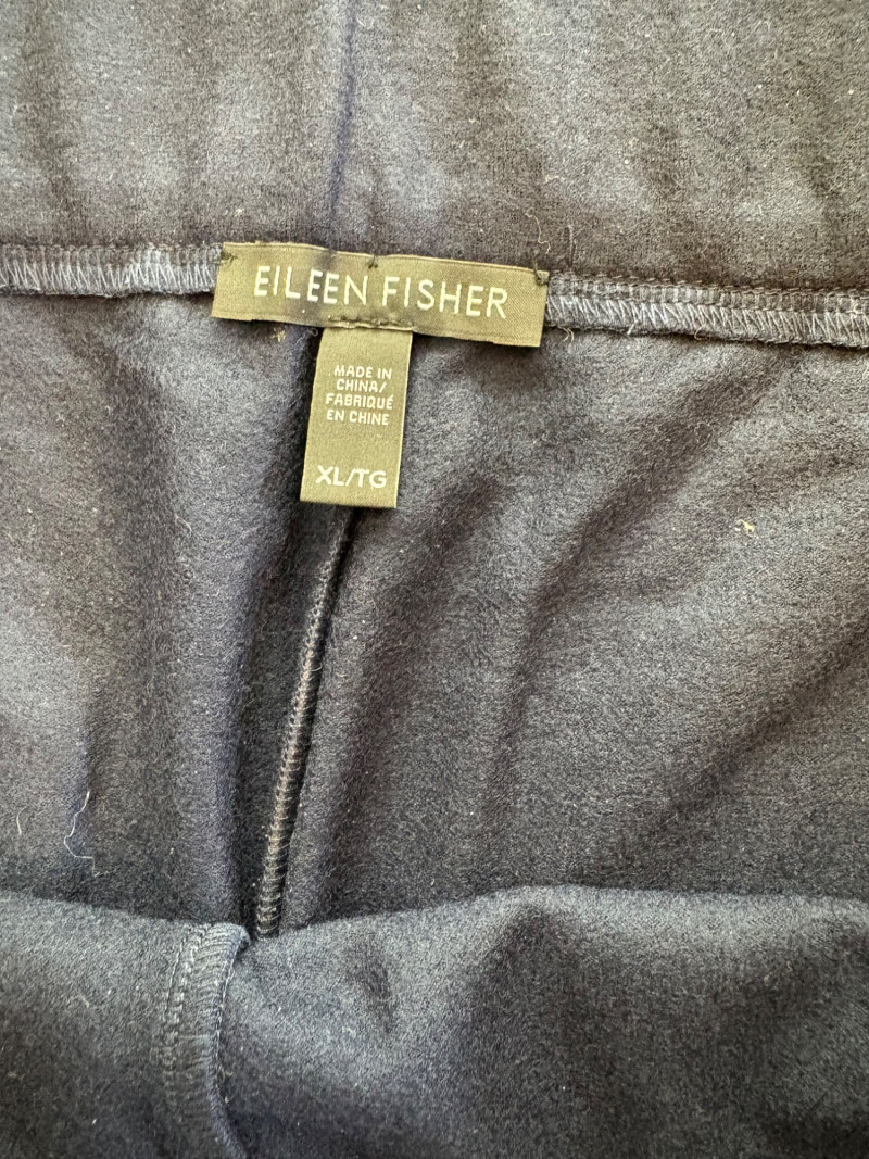Two pairs of pants from Eileen Fisher. Green wide-leg pants with set-in front pockets, gently elasticated waistband, and purposely frayed hems. Side button and zip closure. In good condition. 57% organic cotton, 40% Tencel, and 3% spandex. Waist side to side measures 20.5" while inseam measures 24.5". Size tag says XL. Navy blue wide-leg dress pants with deep front patch pockets and flat elasticated waistband. In good condition. 100% wool. Waist side to side measures 20.5" while inseam measures 27.5". Size tag says XL. Note - we had some issues with photo exposures - the darker photos are most accurate.in terms of color..