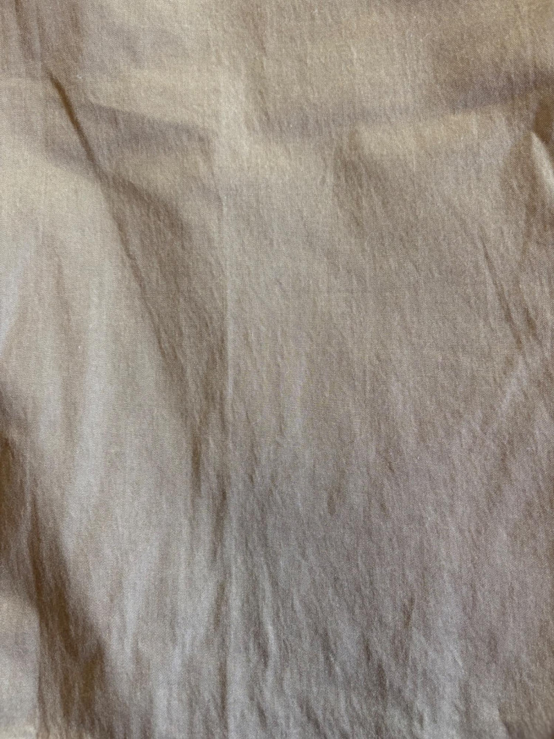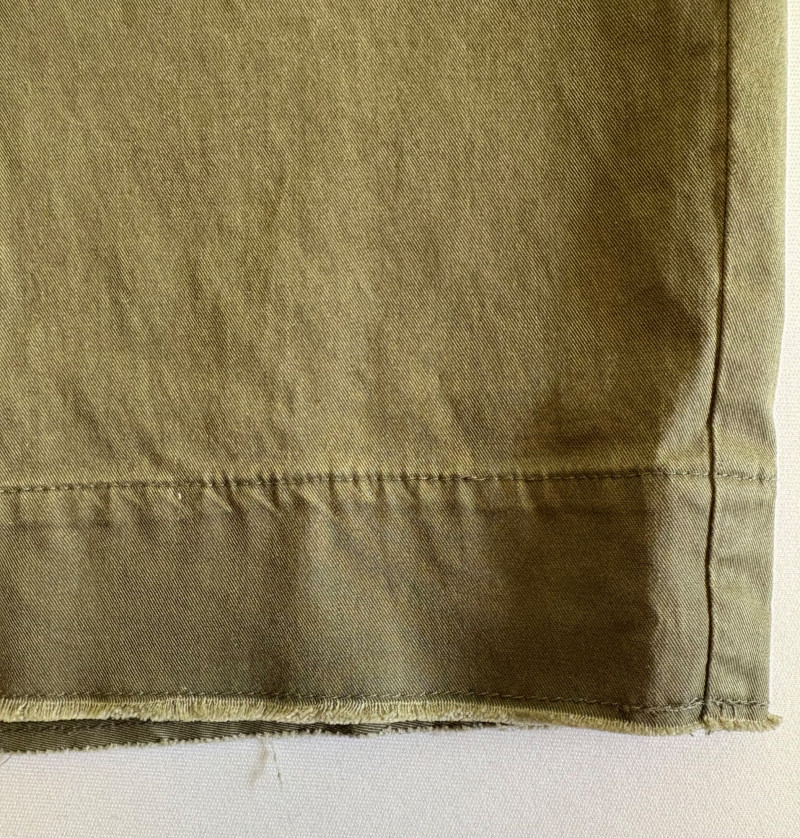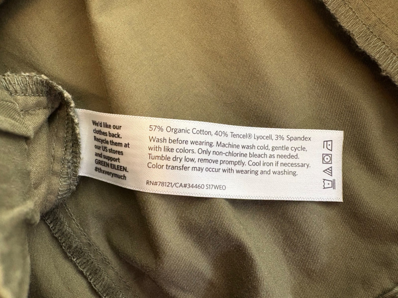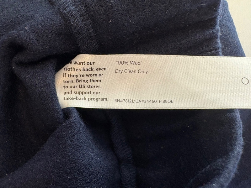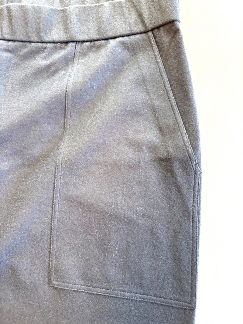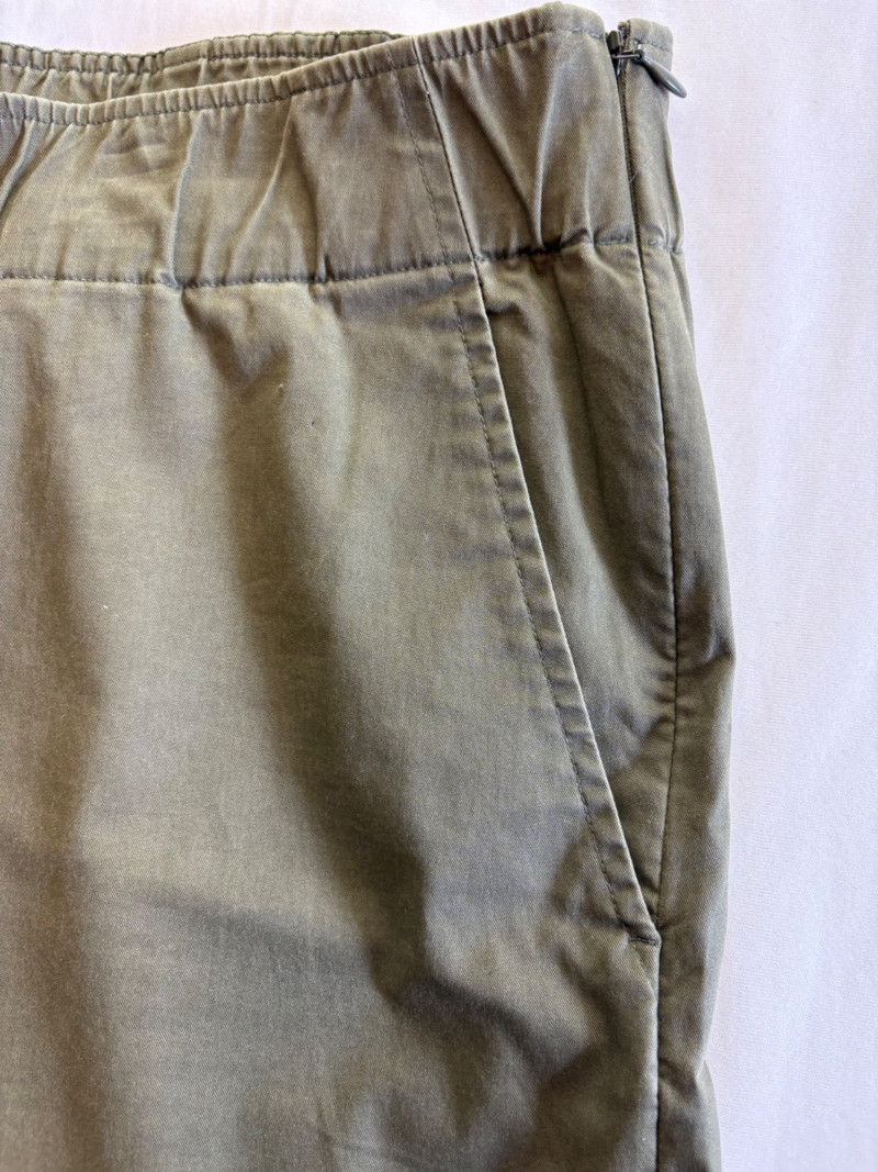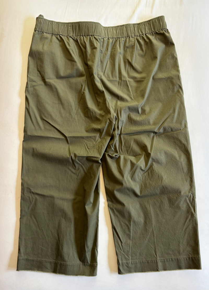 Two pairs of pants from Eileen Fisher. Green wide-leg pants with set-in front pockets, gently elasticated waistband, and purposely frayed hems. Side button and zip closure. In good condition. 57% organic cotton, 40% Tencel, and 3% spandex. Waist side to side measures 20.5" while inseam measures 24.5". Size tag says XL. Navy blue wide-leg dress pants with deep front patch pockets and flat elasticated waistband. In good condition. 100% wool. Waist side to side measures 20.5" while inseam measures 27.5". Size tag says XL. Note - we had some issues with photo exposures - the darker photos are most accurate.in terms of color..