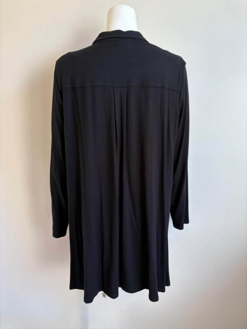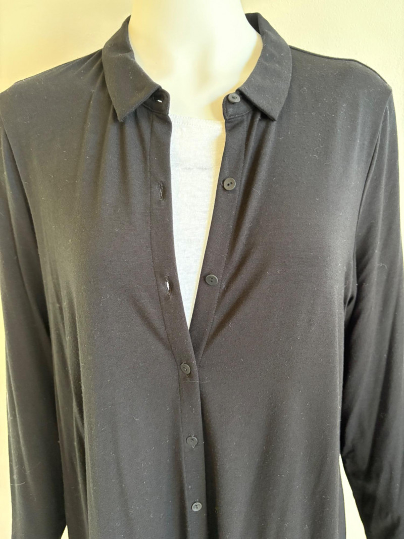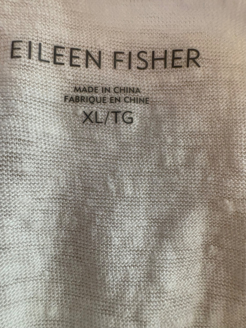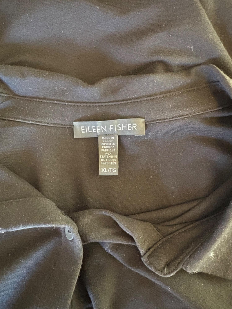 Knit tank & shirt from Eileen Fisher in basic black & white. Scoop neck white shirt has split hem and nubby soft texture. In excellent condition. 100% linen. Measures 22.5" pit to pit and 24" from back neckline to base of hemline. Size tag says XL. Black stretchy shirt/overshirt in smooth soft knit with small collar, button front closure, and back yoke with center pleat. In excellent condition. 95% Viscose with 5% spandex. Measures 22.5" pit to pit and 34" from neckline seam to bottom of back hem. Size tag says XL.