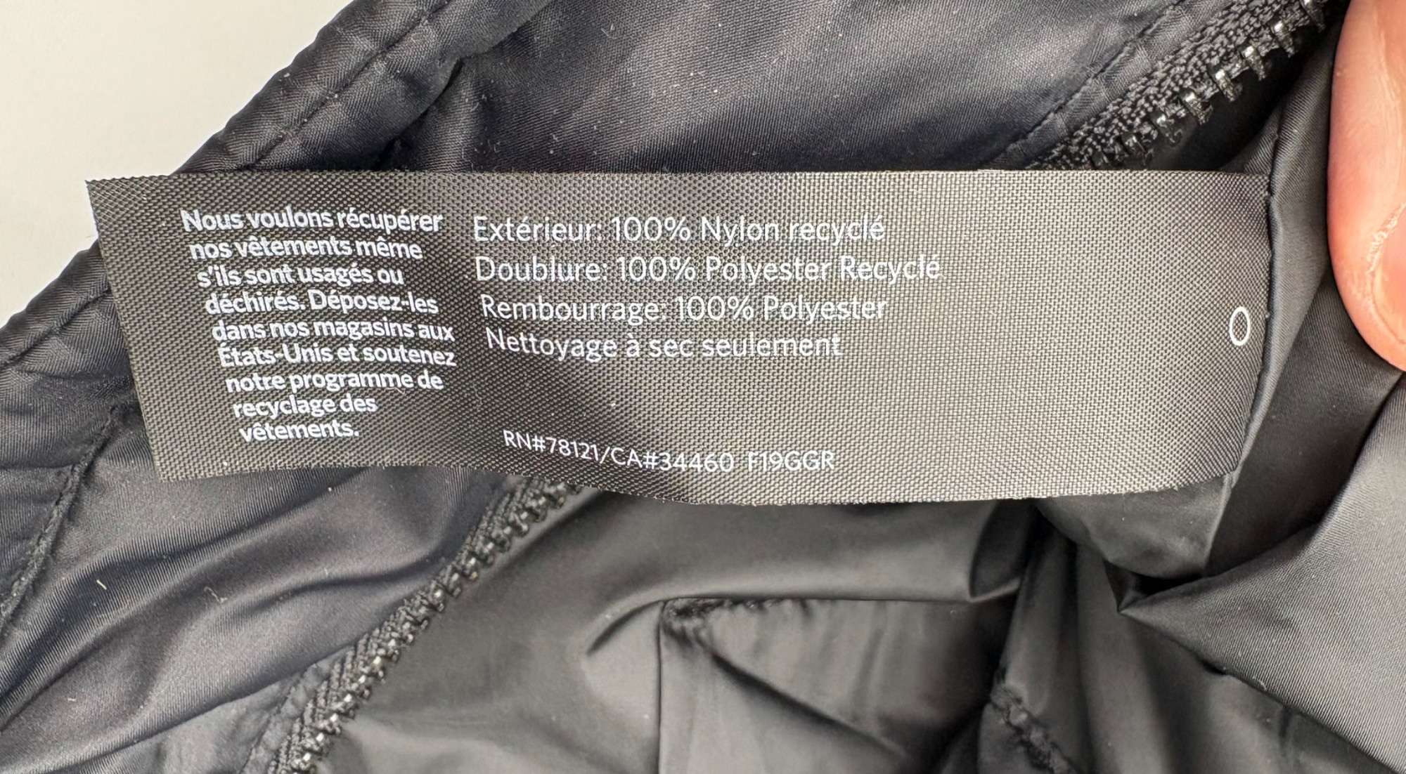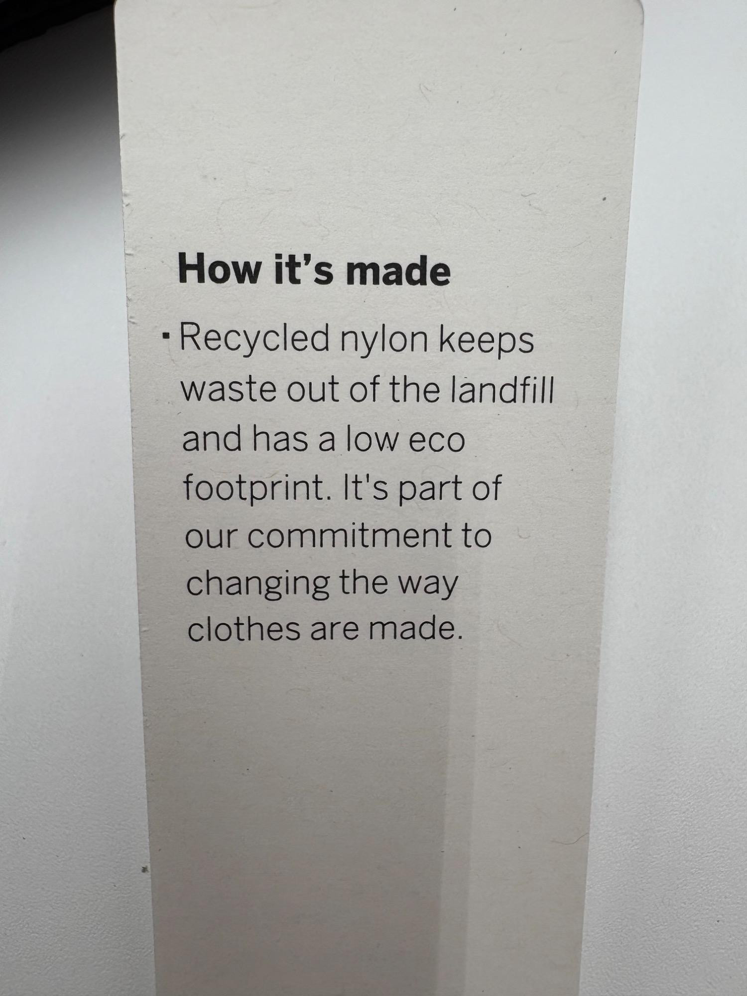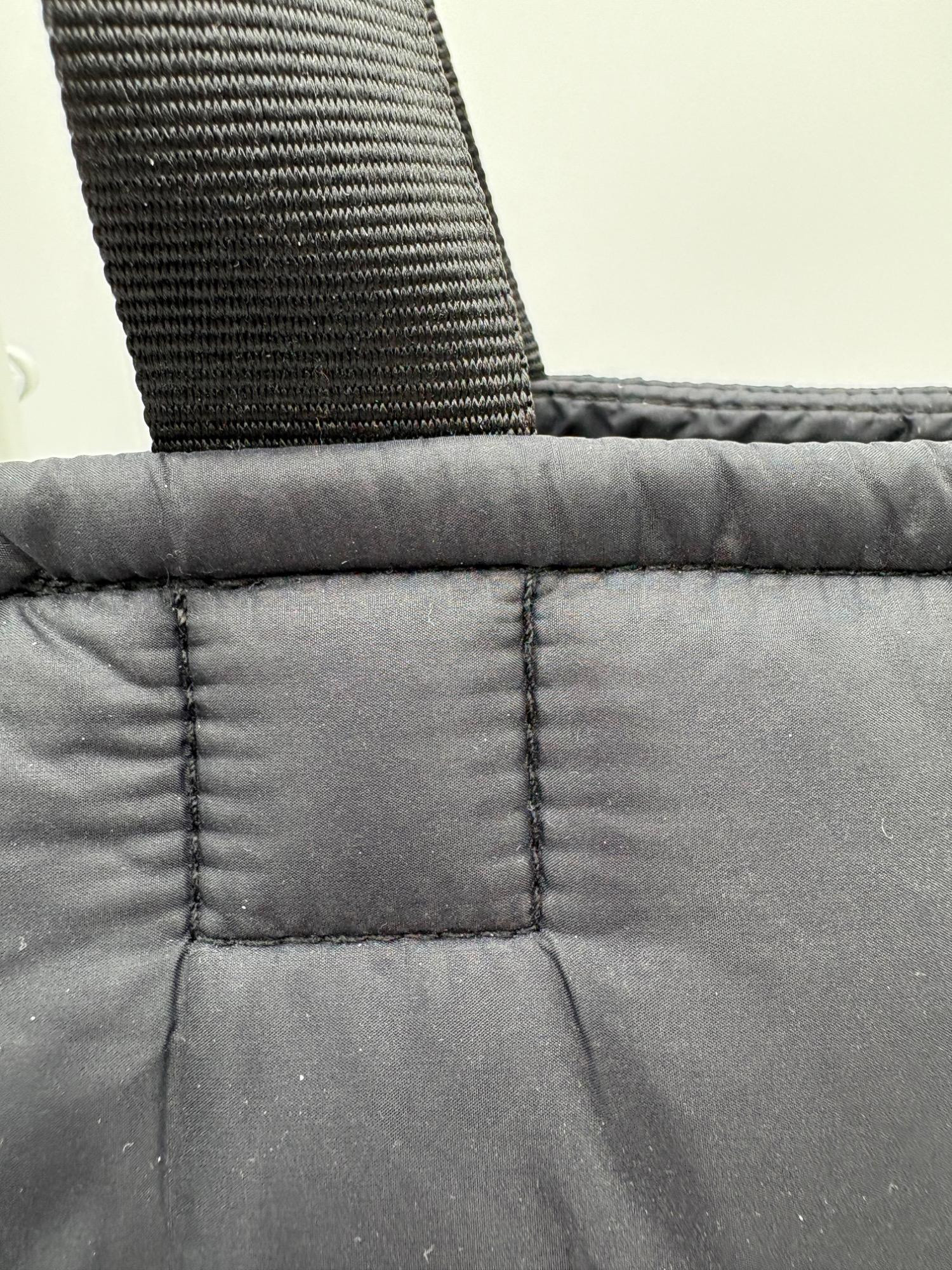 This black nylon puffer bag from Eileen Fisher is made from recycled materials with horizontal channel stitching, top zip closure, webbing straps, three internal pockets, and weighs virtually nothing. New with tag. Measures 12" H x 16" W with 11" drop from top of straps to top center of bag.