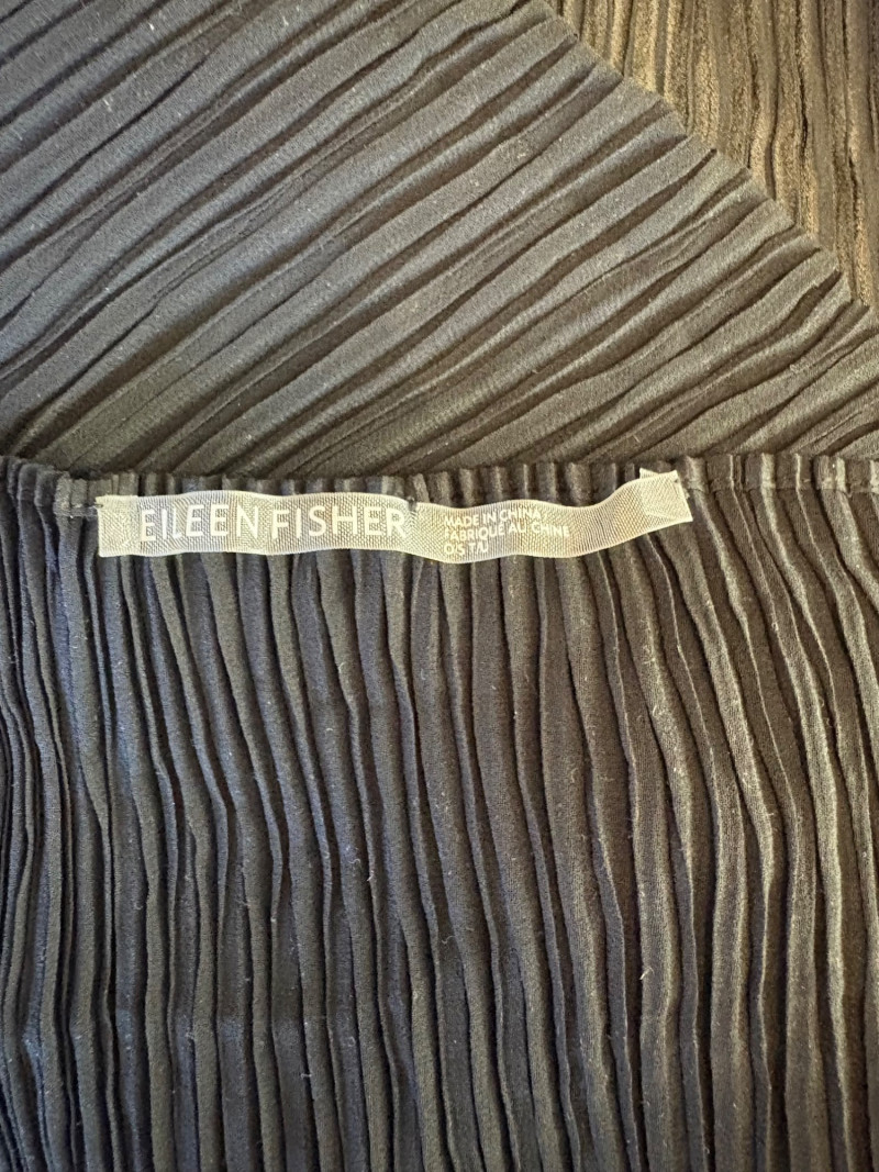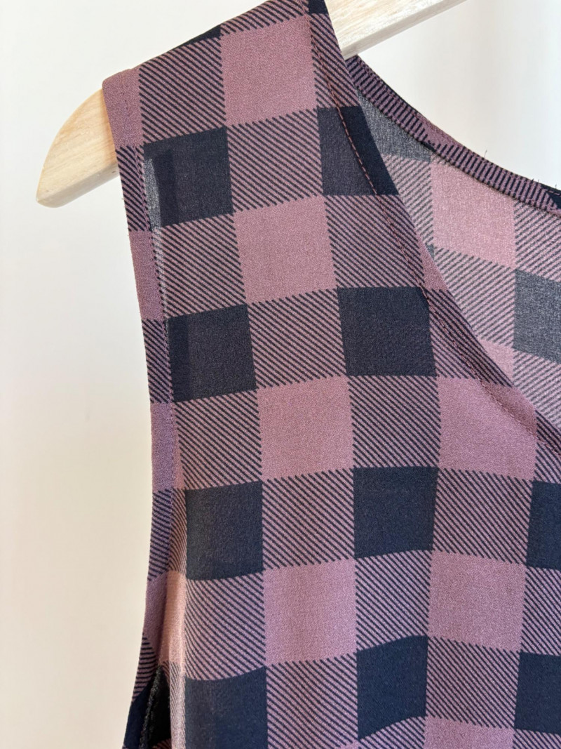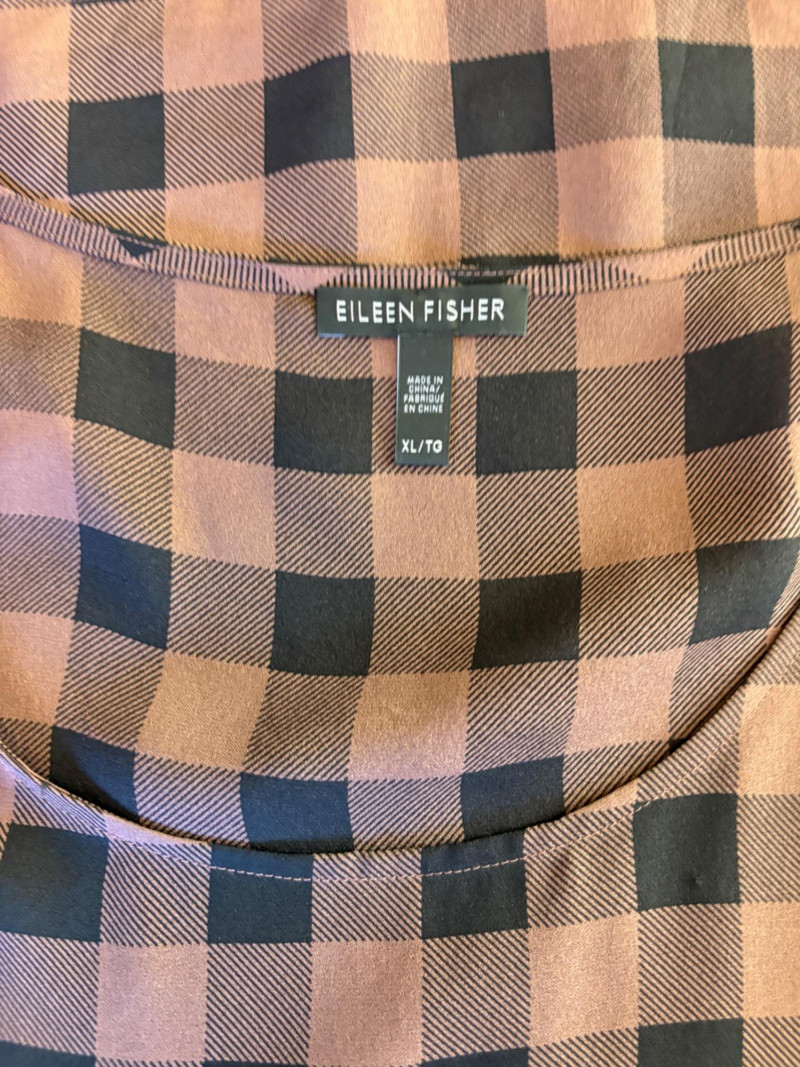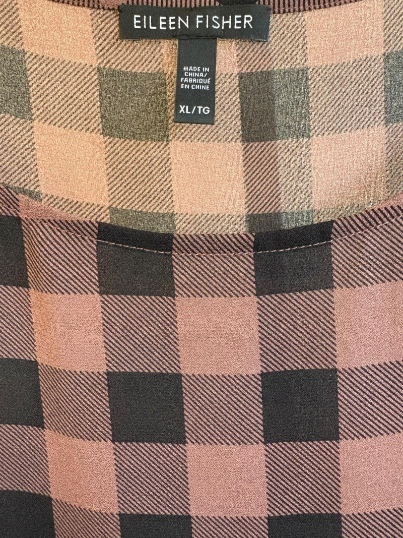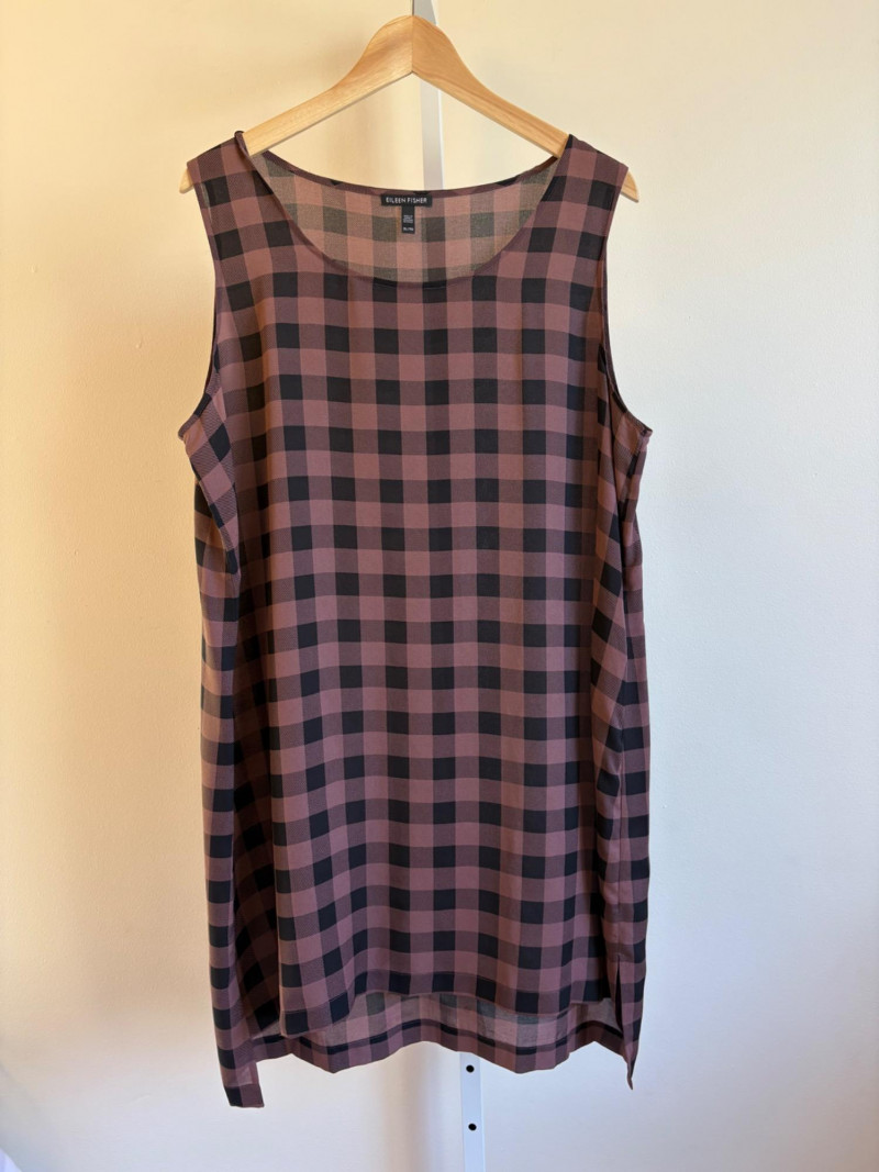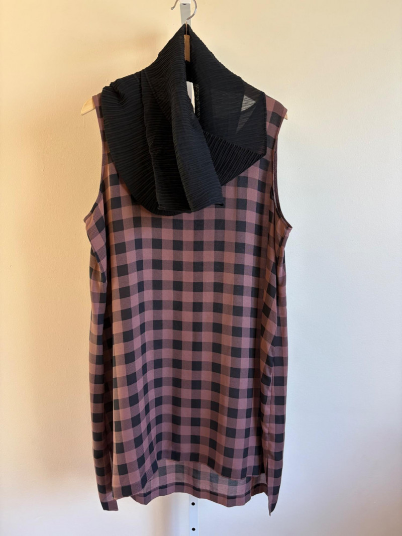 Checked tunic and lovely scarf from Eileen Fisher. Sleeveless tunic with curved neckline in black and pinkish-brown check. Split hem with back approx. 2" longer than front. In excellent condition. 100% silk. Measures 23" pit to pit and 34.5" from scoop back neckline to bottom back hem. Size tag says XL. Pleated rectangular black scarf. In excellent condition. No fabric tag, but feels like a synthetic blend. Measures approx. 16" x 62".
