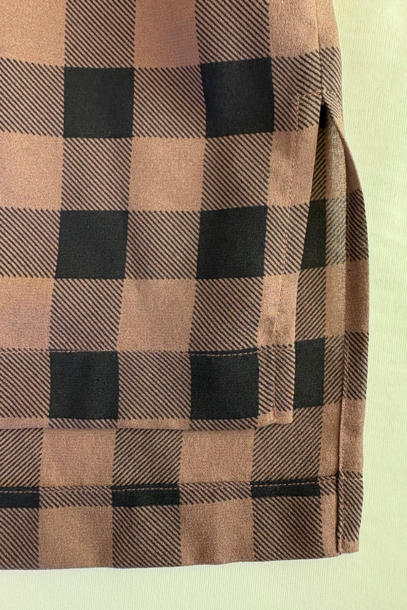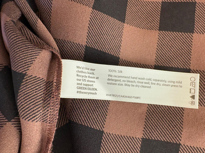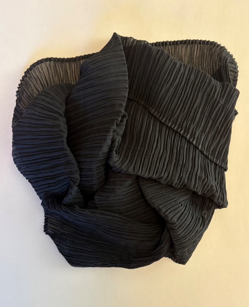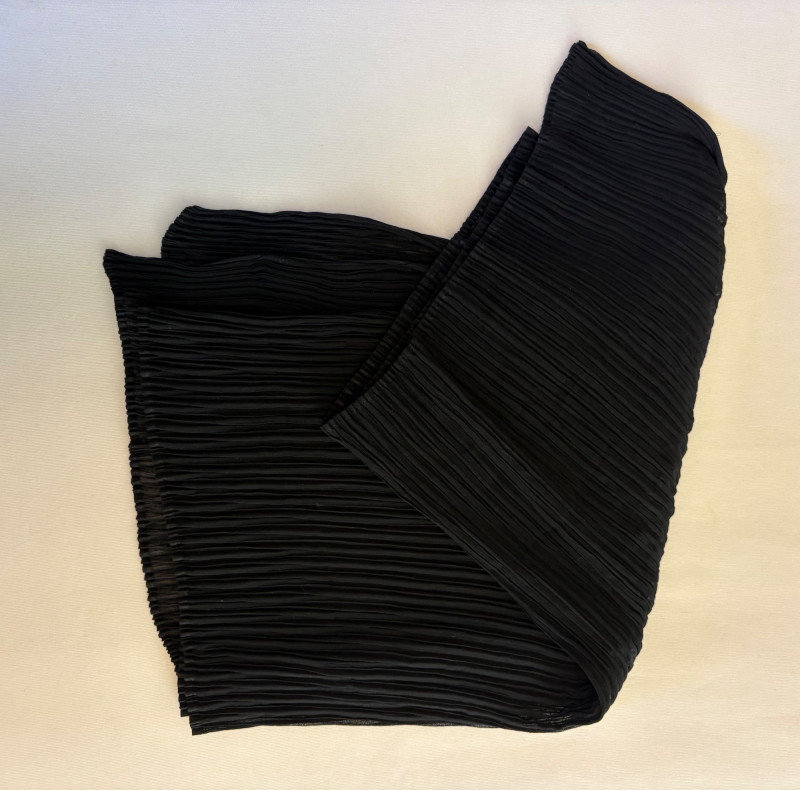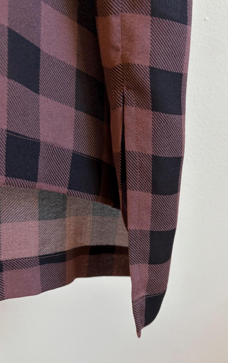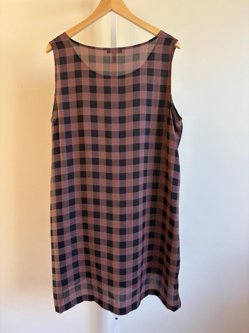 Checked tunic and lovely scarf from Eileen Fisher. Sleeveless tunic with curved neckline in black and pinkish-brown check. Split hem with back approx. 2" longer than front. In excellent condition. 100% silk. Measures 23" pit to pit and 34.5" from scoop back neckline to bottom back hem. Size tag says XL. Pleated rectangular black scarf. In excellent condition. No fabric tag, but feels like a synthetic blend. Measures approx. 16" x 62".