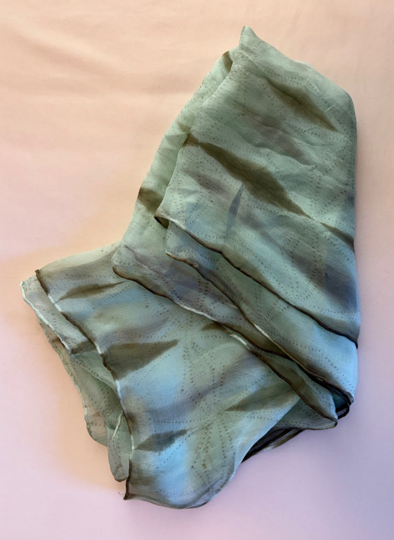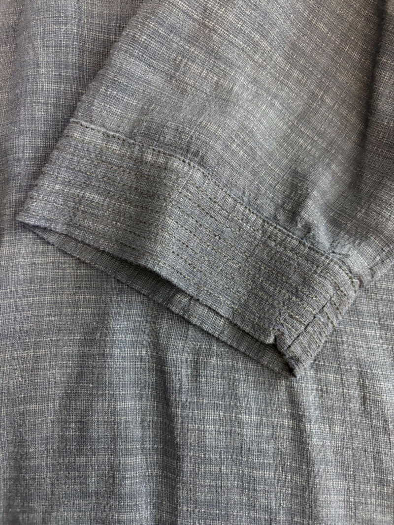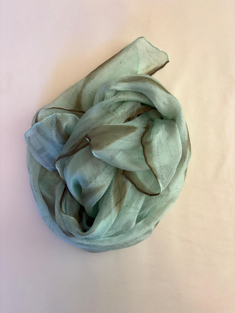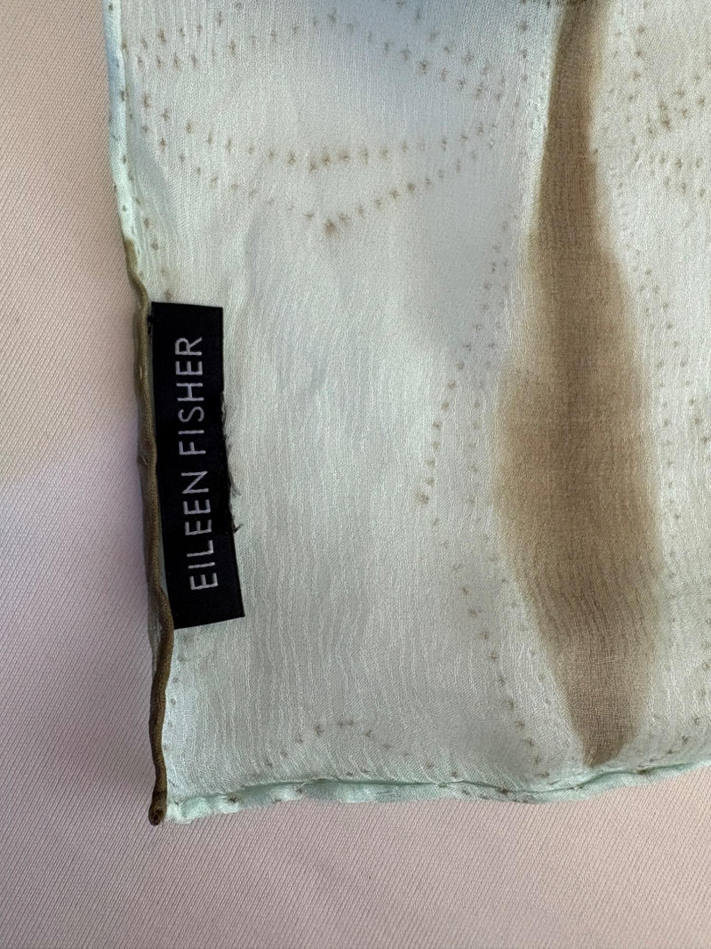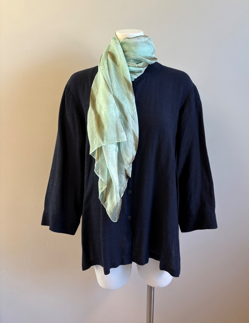 Pretty pairing - shirt/tunic & scarf from Eileen Fisher. Deep midnight blue shirt/tunic has mandarin collar, front button closure, banded cuffs, and split hem. Fabric has a slight woven variegated pattern. In excellent condition. 54% viscose and 40% linen with 6% nylon. Measures 24" pit to pit and 25.5" from back neckline to bottom back hem. Size tag says 1X. Pretty pale aqua scarf with greenish-brown design. In excellent condition. Fabric tag is missing but feels like lightweight voile. Measures approx. 18" x 72".
