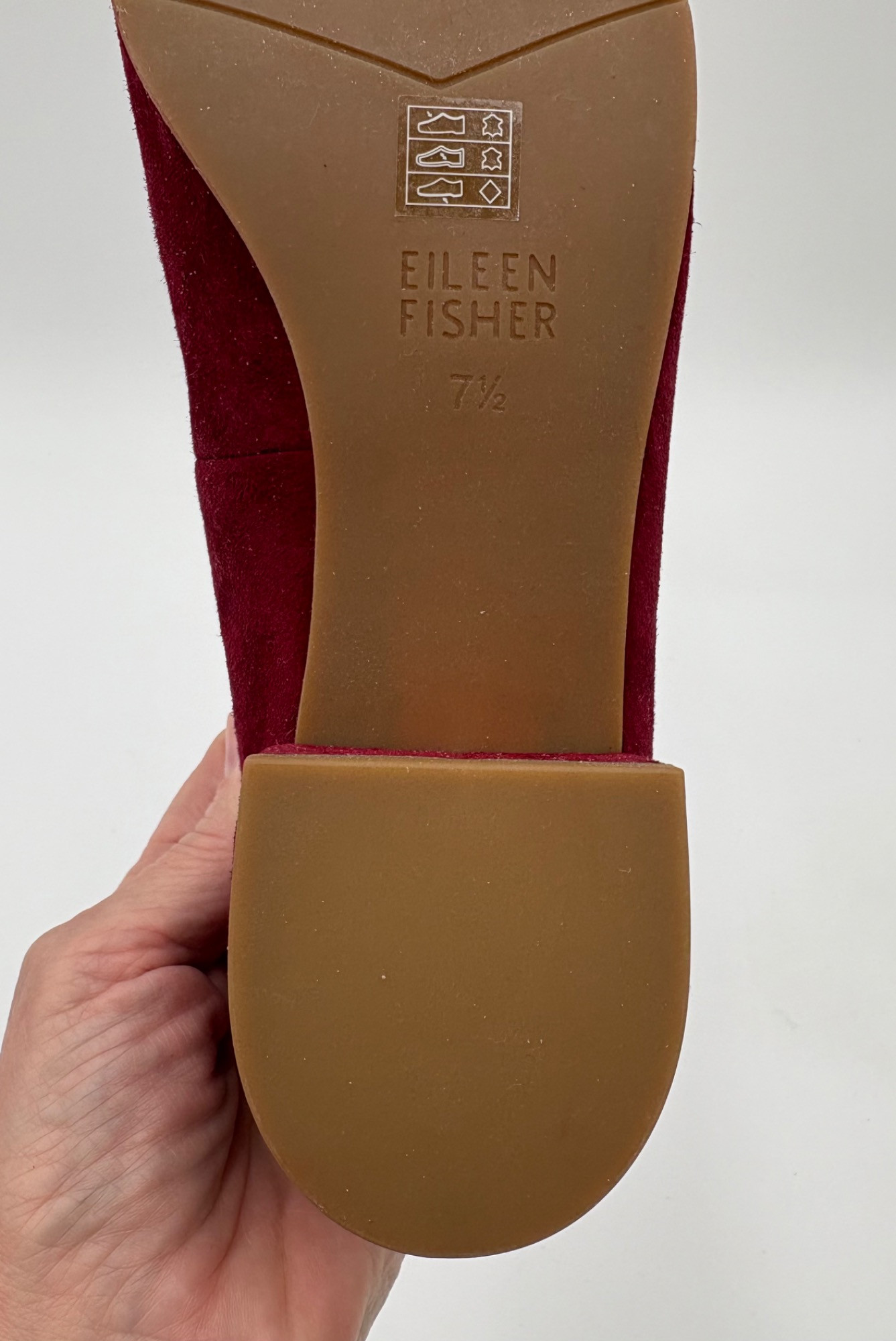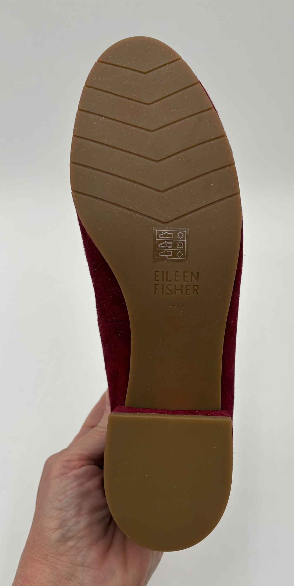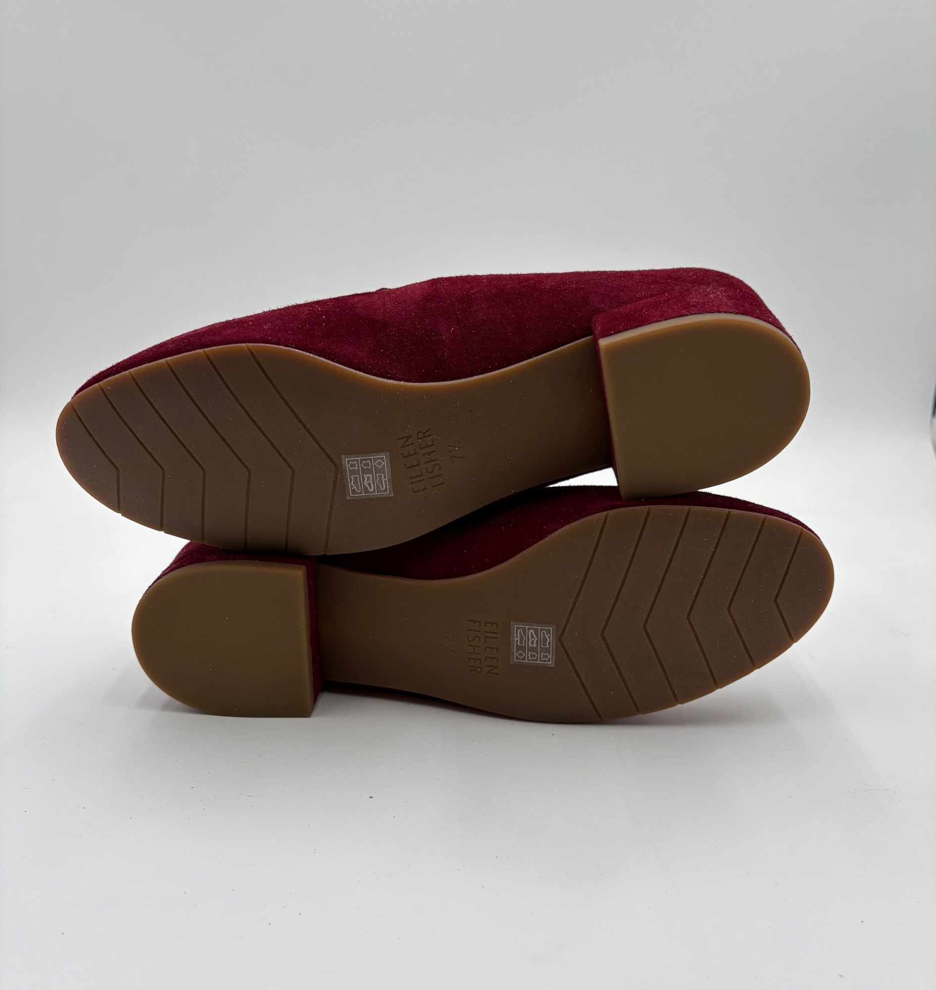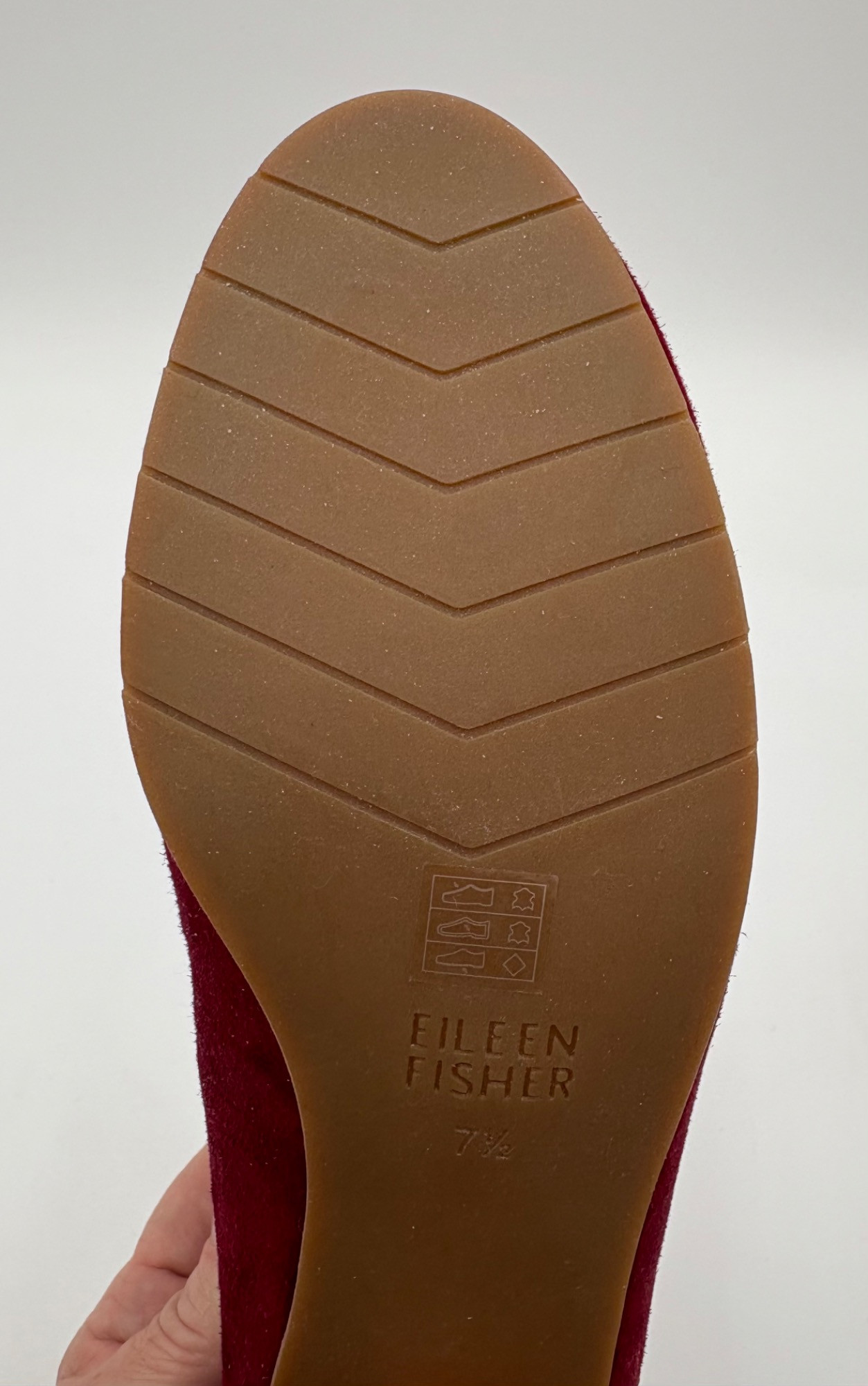 Deep red suede pumps from Eileen Fisher have a curved topstitched vamp, a neutral-colored rubber sole, and a self-covered 1.25" heel. Appear new or worn only to try on - soles show no wear. . Size 7.5