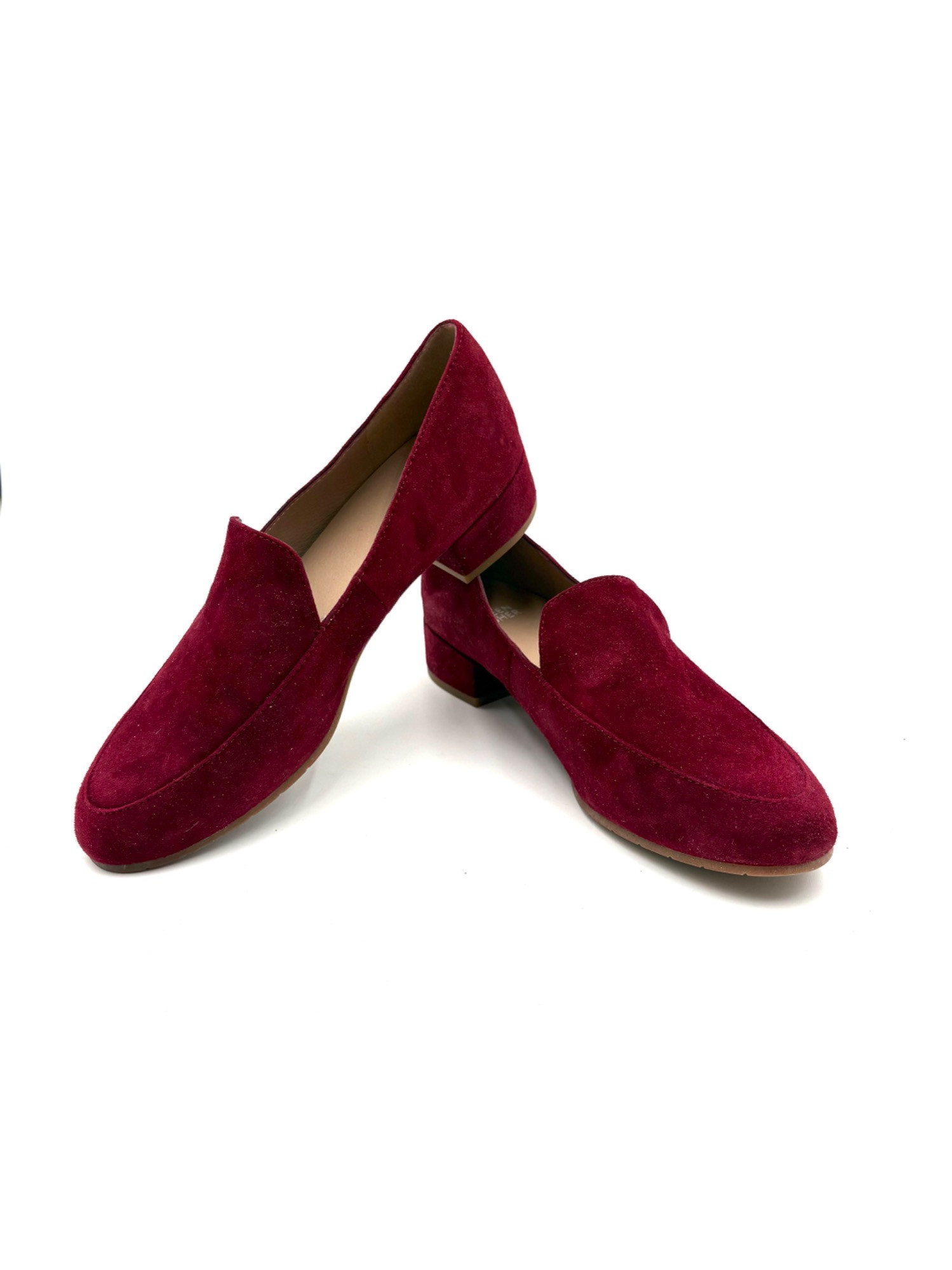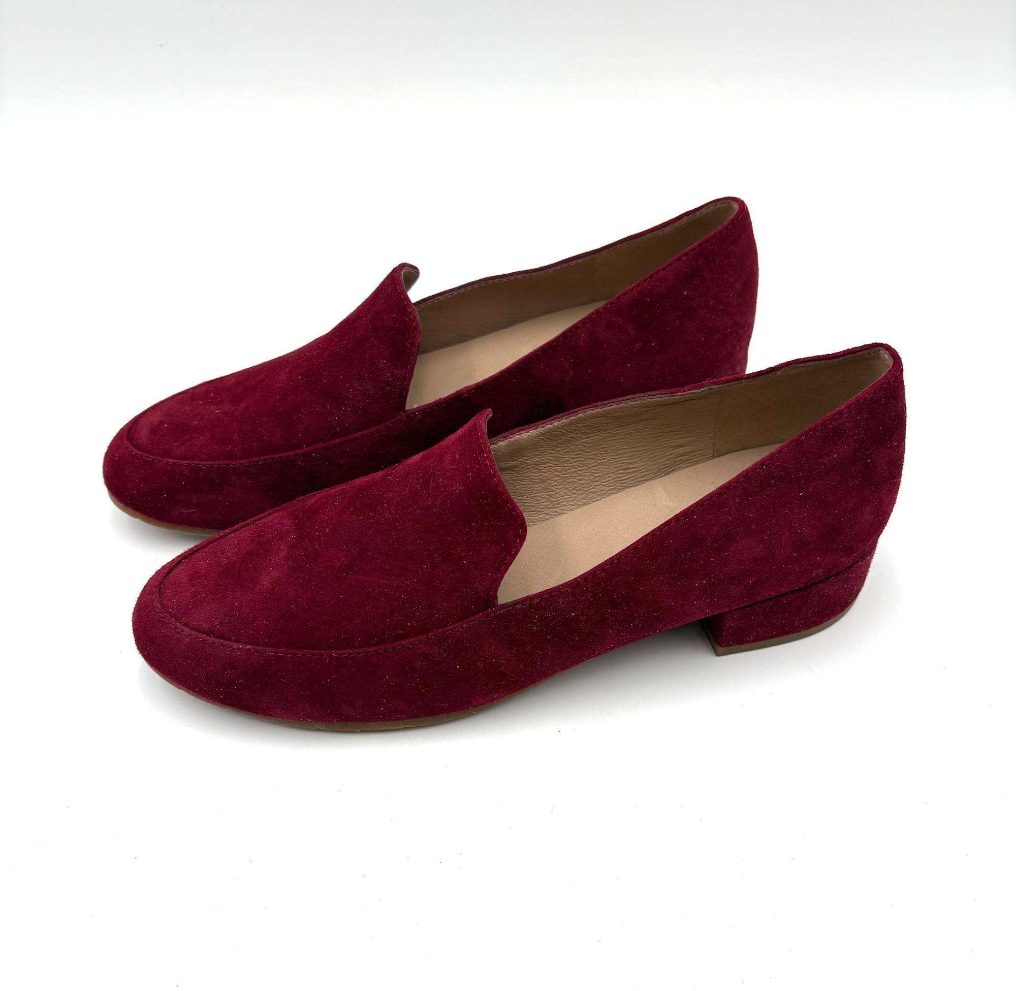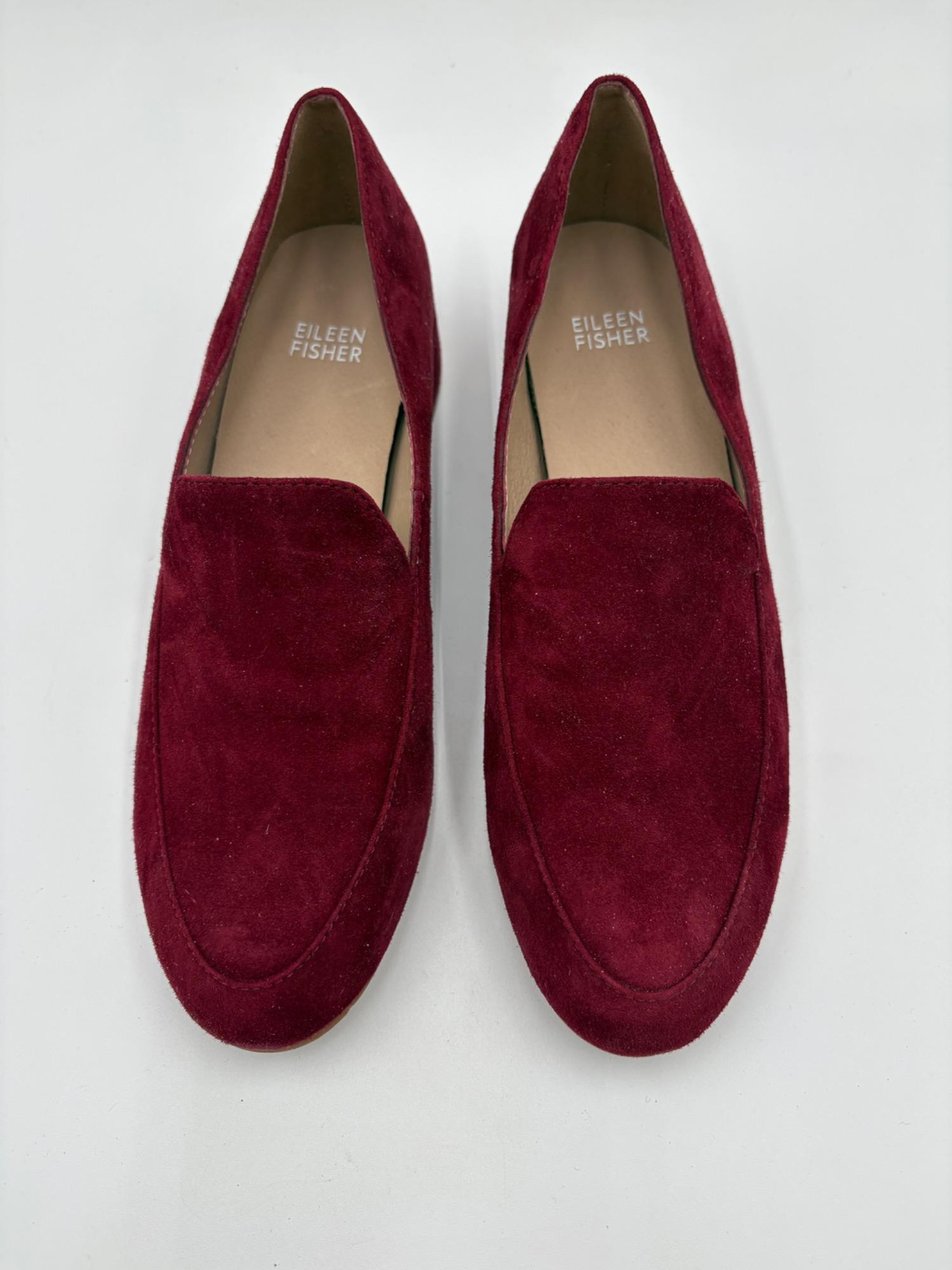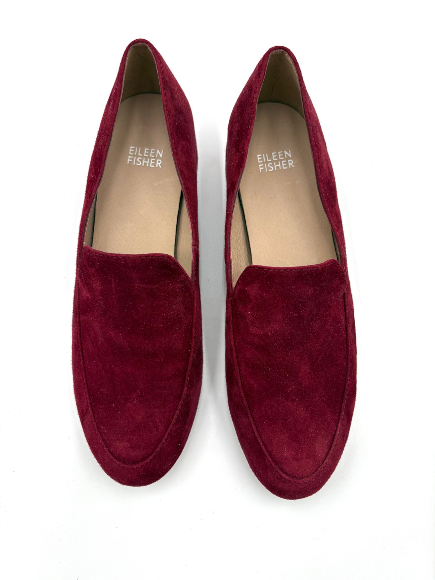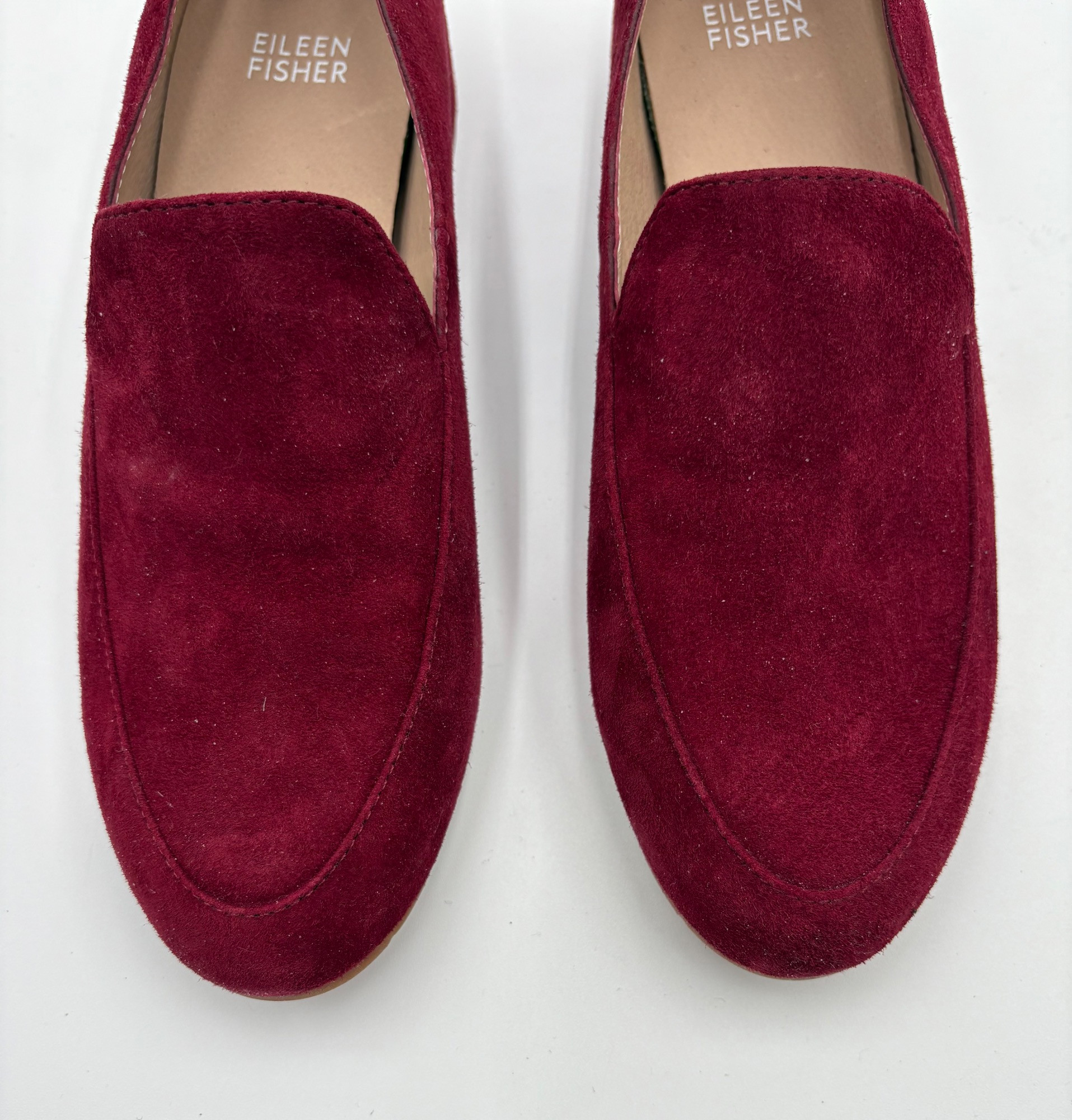 Deep red suede pumps from Eileen Fisher have a curved topstitched vamp, a neutral-colored rubber sole, and a self-covered 1.25" heel. Appear new or worn only to try on - soles show no wear. . Size 7.5