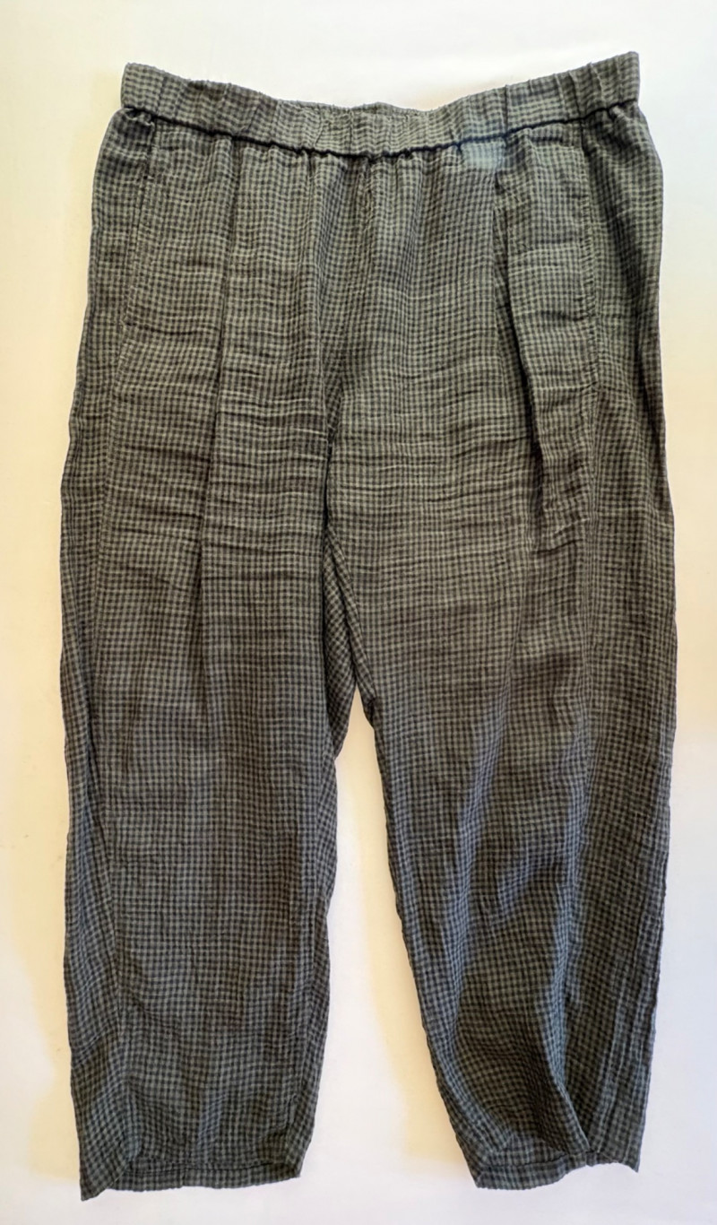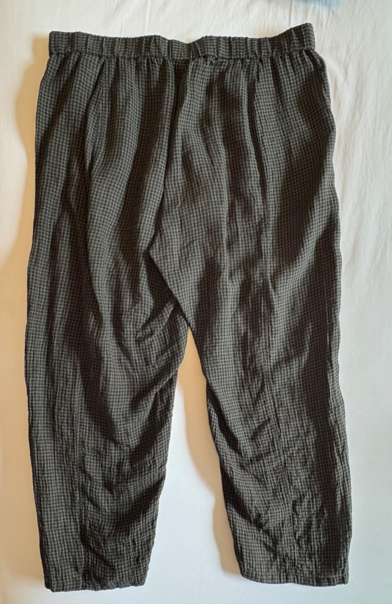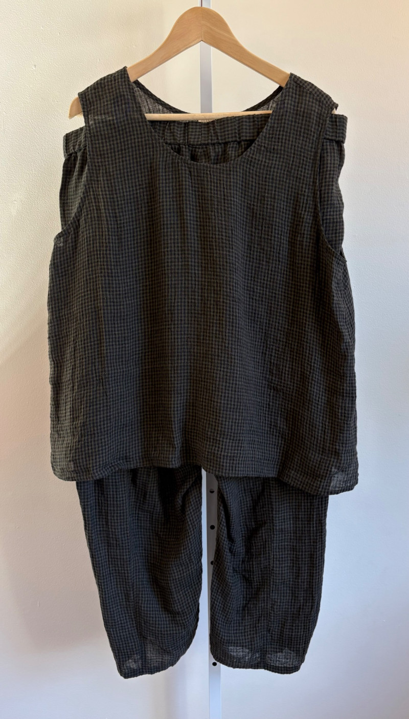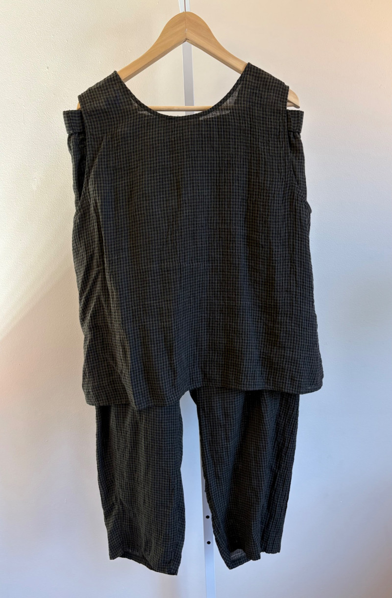Two piece casual linen set in black and grey check from Eileen Fisher. Sleeveless shell top has scoop neck and split hem. In excellent condition. 100% organic linen. Measures 24" pit to pit and 21.5" from back scoop neckline to back hemline. Size tag says 1X. Pants in the same fabric have elasticated waistband, 2 small front pleats, and front set-in pockets. Back of pants have unusual construction with seam running along the back of each bun to the bottom of the leg - probably better shaping through this tailoring technique. In excellent condition. Measure 19" side to side at waist with 26" inseam. Size tag says XL.
