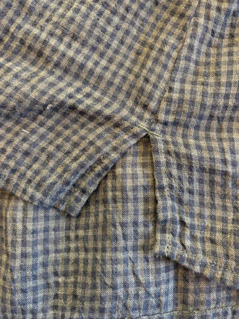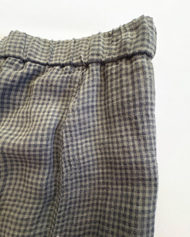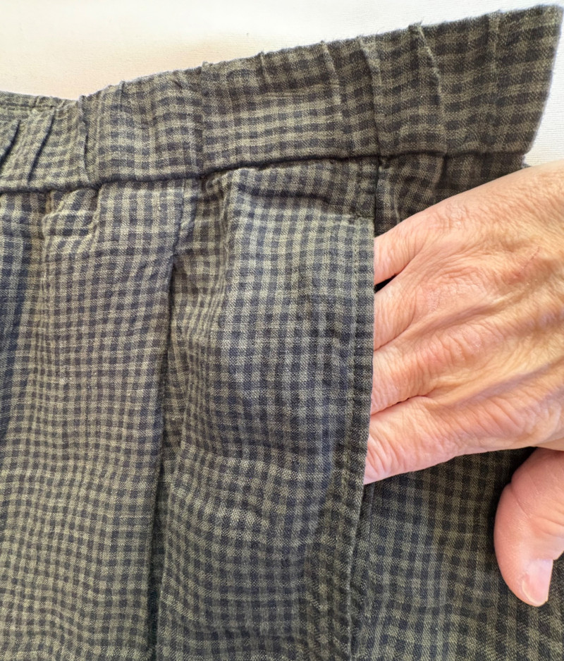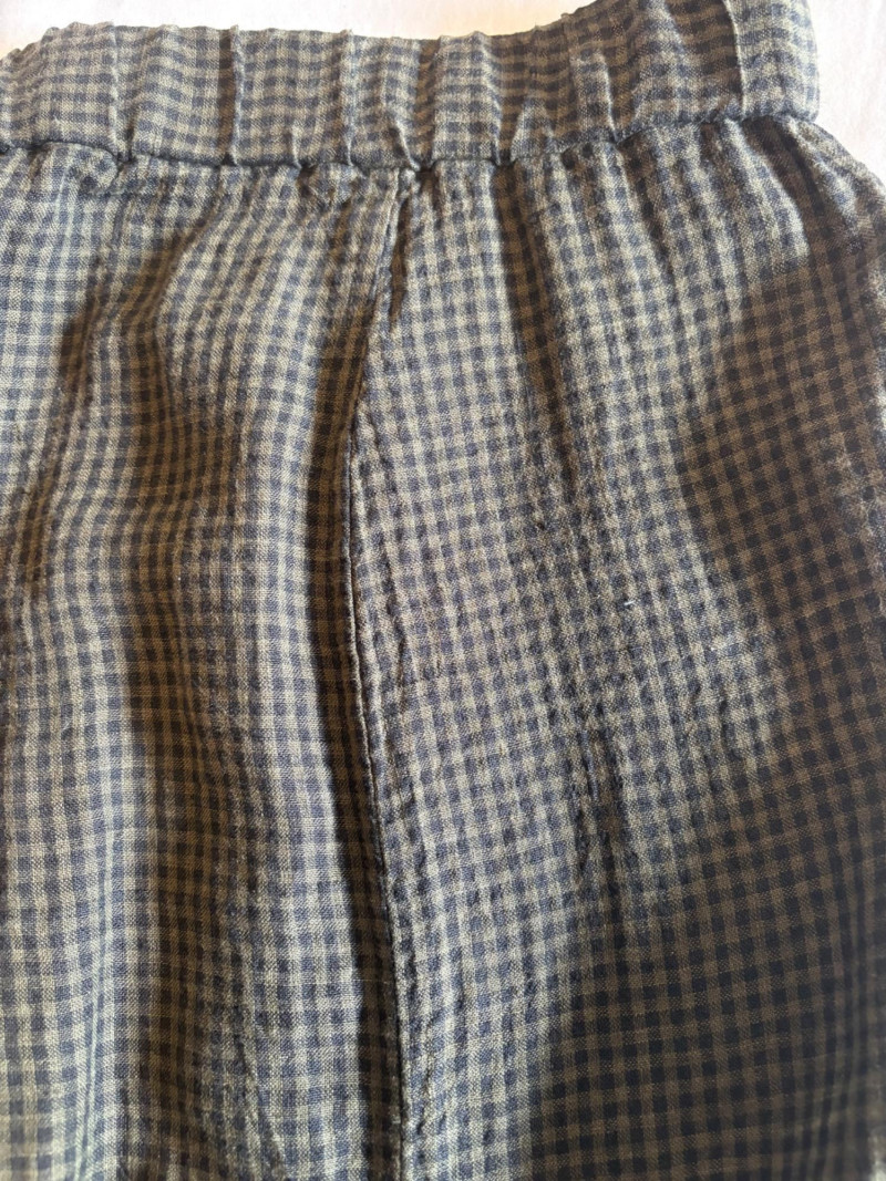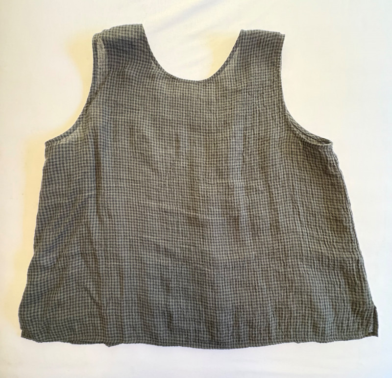 Two piece casual linen set in black and grey check from Eileen Fisher. Sleeveless shell top has scoop neck and split hem. In excellent condition. 100% organic linen. Measures 24" pit to pit and 21.5" from back scoop neckline to back hemline. Size tag says 1X. Pants in the same fabric have elasticated waistband, 2 small front pleats, and front set-in pockets. Back of pants have unusual construction with seam running along the back of each bun to the bottom of the leg - probably better shaping through this tailoring technique. In excellent condition. Measure 19" side to side at waist with 26" inseam. Size tag says XL.