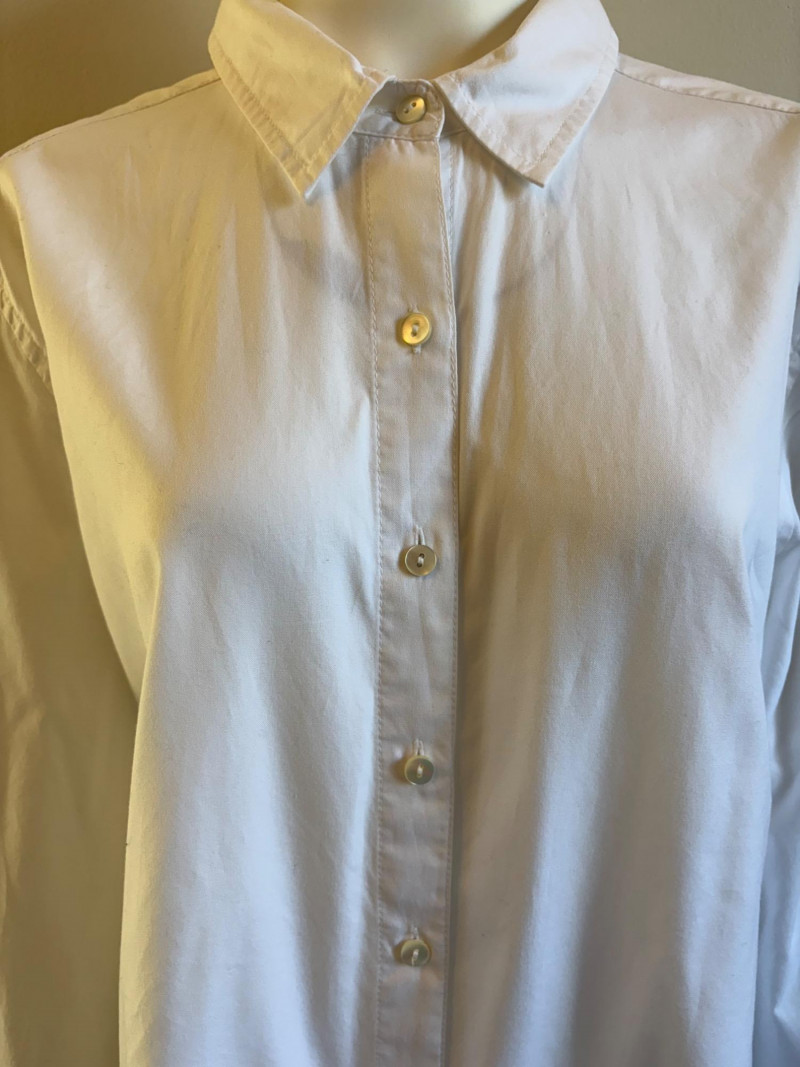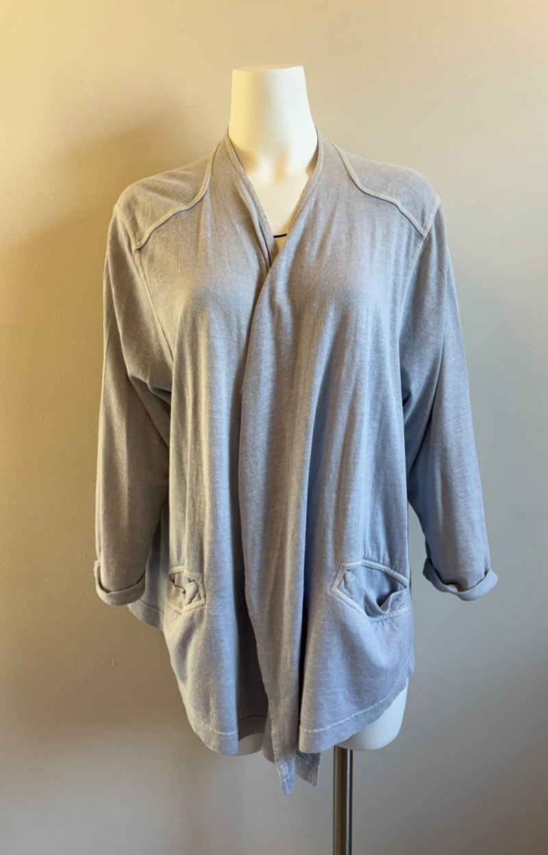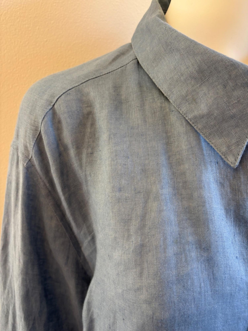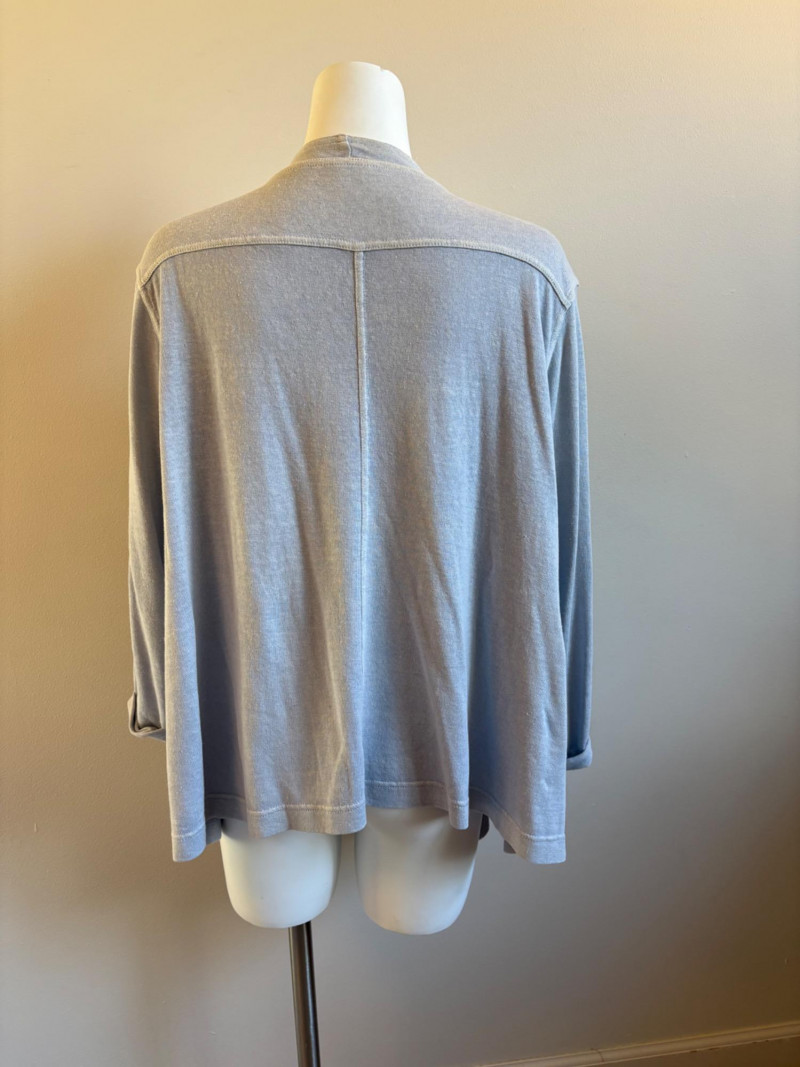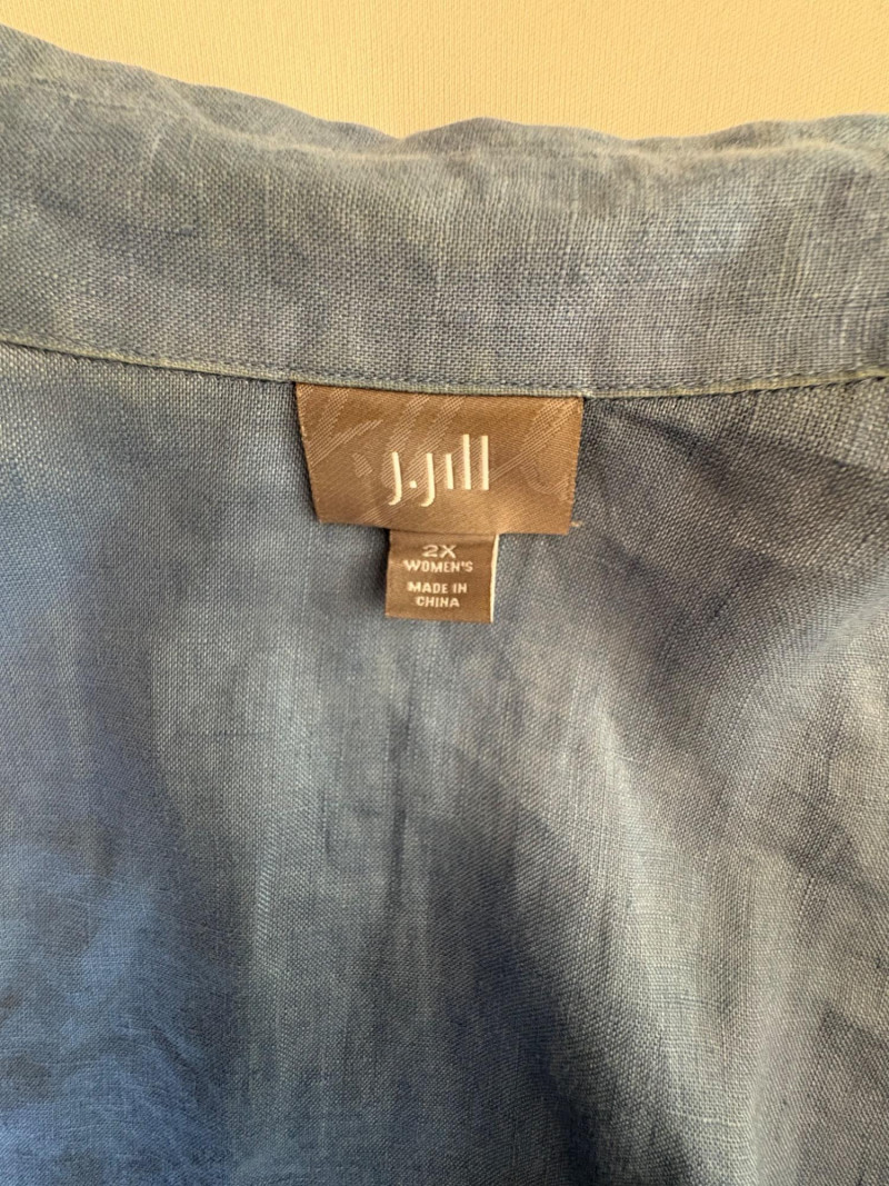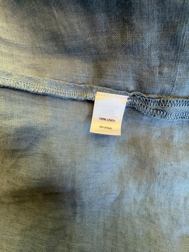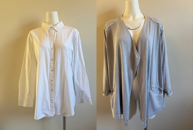 Shirt and knit cardigan for casual style from J Jill and Poetry. Crisp white shirt from J. Jill with classic features: button front closure, single button placket cuffs. curved shirt hem, and back yoke with center pleat. In excellent condition. 100% cotton. Measures 26 pit to pit and 29" from back neck seam to back bottom hem. Size tag says XL. Pale blue cardigan from Poetry with welted pockets, curved shoulder sections, back yoke, and rolled cuffs.. Open front panels extend past the front center when left as is or they could be held surplice style with a brooch/pin for a less casual look. In good condition showing very slight overall fading. 55% hemp with 45% cotton. Measures 26" pit to pit and 25" from back neckline to back bottom hem. Size tag says 18. BONUS - J. Jill blue linen shirt with with front button closure, pleated single button cuffs, bust darts, and split hem. In good condition except for needed repair noted below. 100% linen. Measures 26" pit to pit and 29" from back neck seam to bottom center back hem. Size tag says 2X. Issue: left bust dart stitching has come loose. Solution: 30 seconds of of straight stitch on a sewing machine or 5 minutes of hand stitching along the dart. Please see last picture.