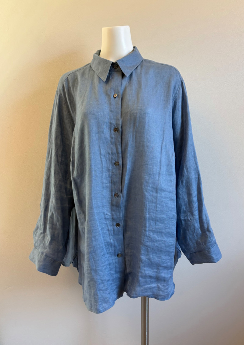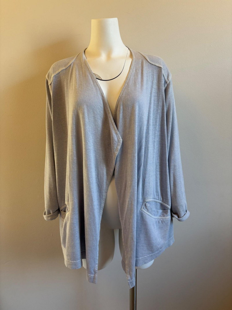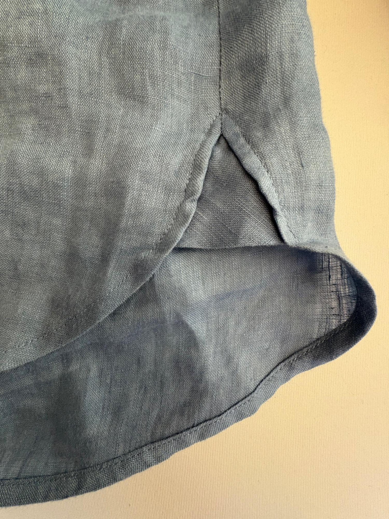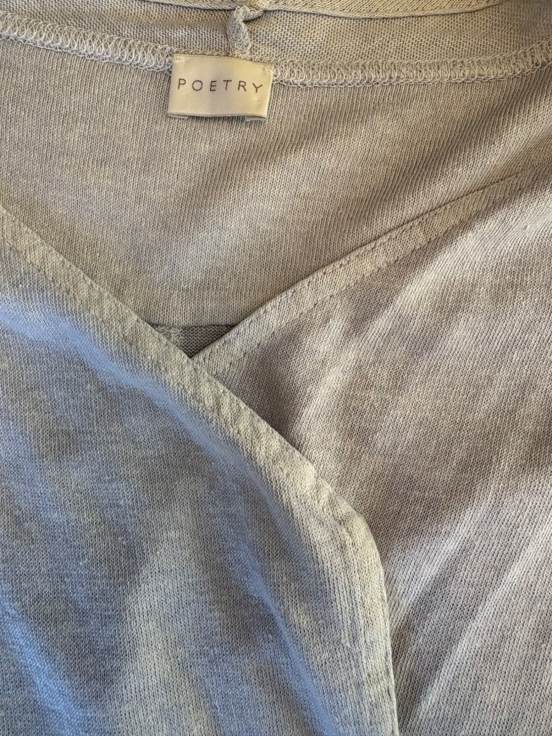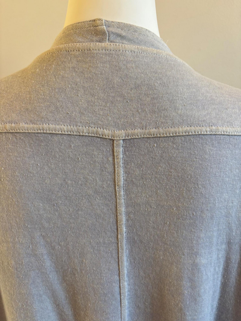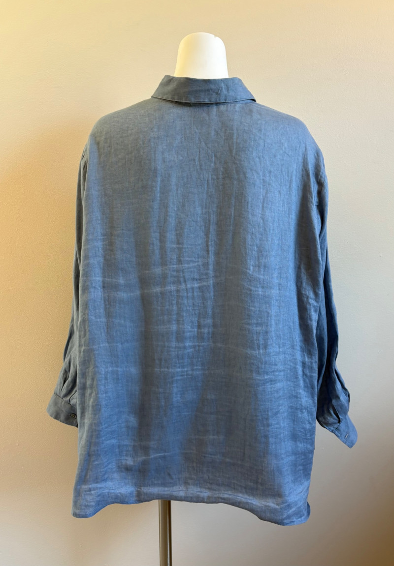 Shirt and knit cardigan for casual style from J Jill and Poetry. Crisp white shirt from J. Jill with classic features: button front closure, single button placket cuffs. curved shirt hem, and back yoke with center pleat. In excellent condition. 100% cotton. Measures 26 pit to pit and 29" from back neck seam to back bottom hem. Size tag says XL. Pale blue cardigan from Poetry with welted pockets, curved shoulder sections, back yoke, and rolled cuffs.. Open front panels extend past the front center when left as is or they could be held surplice style with a brooch/pin for a less casual look. In good condition showing very slight overall fading. 55% hemp with 45% cotton. Measures 26" pit to pit and 25" from back neckline to back bottom hem. Size tag says 18. BONUS - J. Jill blue linen shirt with with front button closure, pleated single button cuffs, bust darts, and split hem. In good condition except for needed repair noted below. 100% linen. Measures 26" pit to pit and 29" from back neck seam to bottom center back hem. Size tag says 2X. Issue: left bust dart stitching has come loose. Solution: 30 seconds of of straight stitch on a sewing machine or 5 minutes of hand stitching along the dart. Please see last picture.