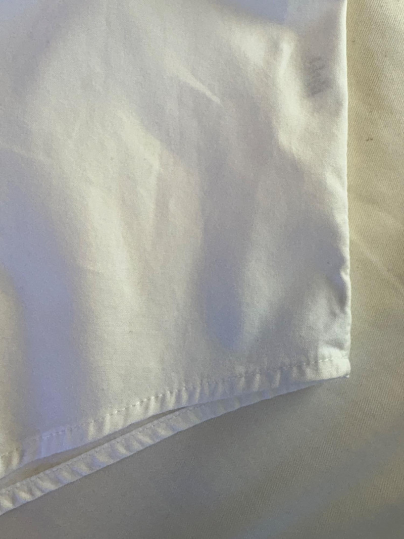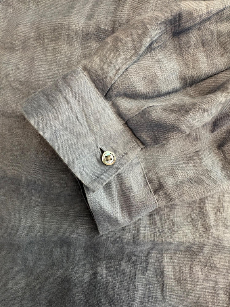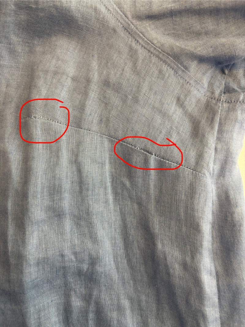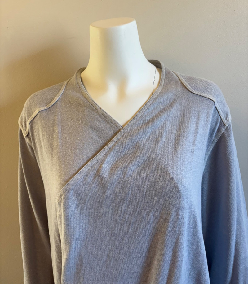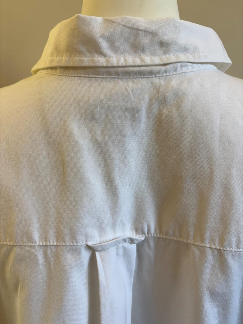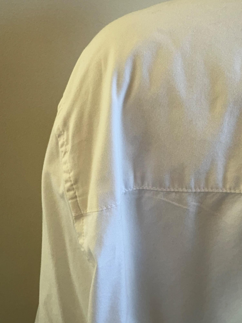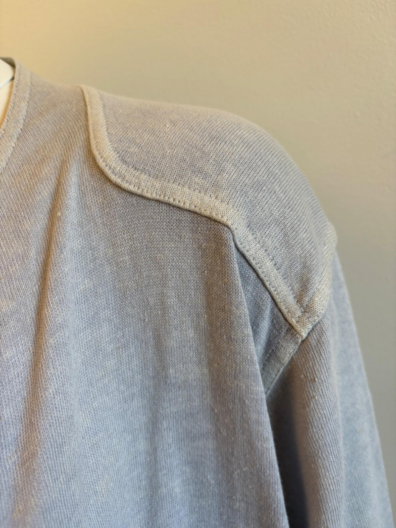 Shirt and knit cardigan for casual style from J Jill and Poetry. Crisp white shirt from J. Jill with classic features: button front closure, single button placket cuffs. curved shirt hem, and back yoke with center pleat. In excellent condition. 100% cotton. Measures 26 pit to pit and 29" from back neck seam to back bottom hem. Size tag says XL. Pale blue cardigan from Poetry with welted pockets, curved shoulder sections, back yoke, and rolled cuffs.. Open front panels extend past the front center when left as is or they could be held surplice style with a brooch/pin for a less casual look. In good condition showing very slight overall fading. 55% hemp with 45% cotton. Measures 26" pit to pit and 25" from back neckline to back bottom hem. Size tag says 18. BONUS - J. Jill blue linen shirt with with front button closure, pleated single button cuffs, bust darts, and split hem. In good condition except for needed repair noted below. 100% linen. Measures 26" pit to pit and 29" from back neck seam to bottom center back hem. Size tag says 2X. Issue: left bust dart stitching has come loose. Solution: 30 seconds of of straight stitch on a sewing machine or 5 minutes of hand stitching along the dart. Please see last picture.