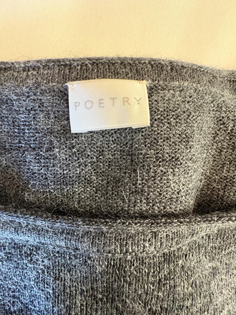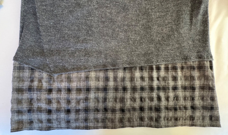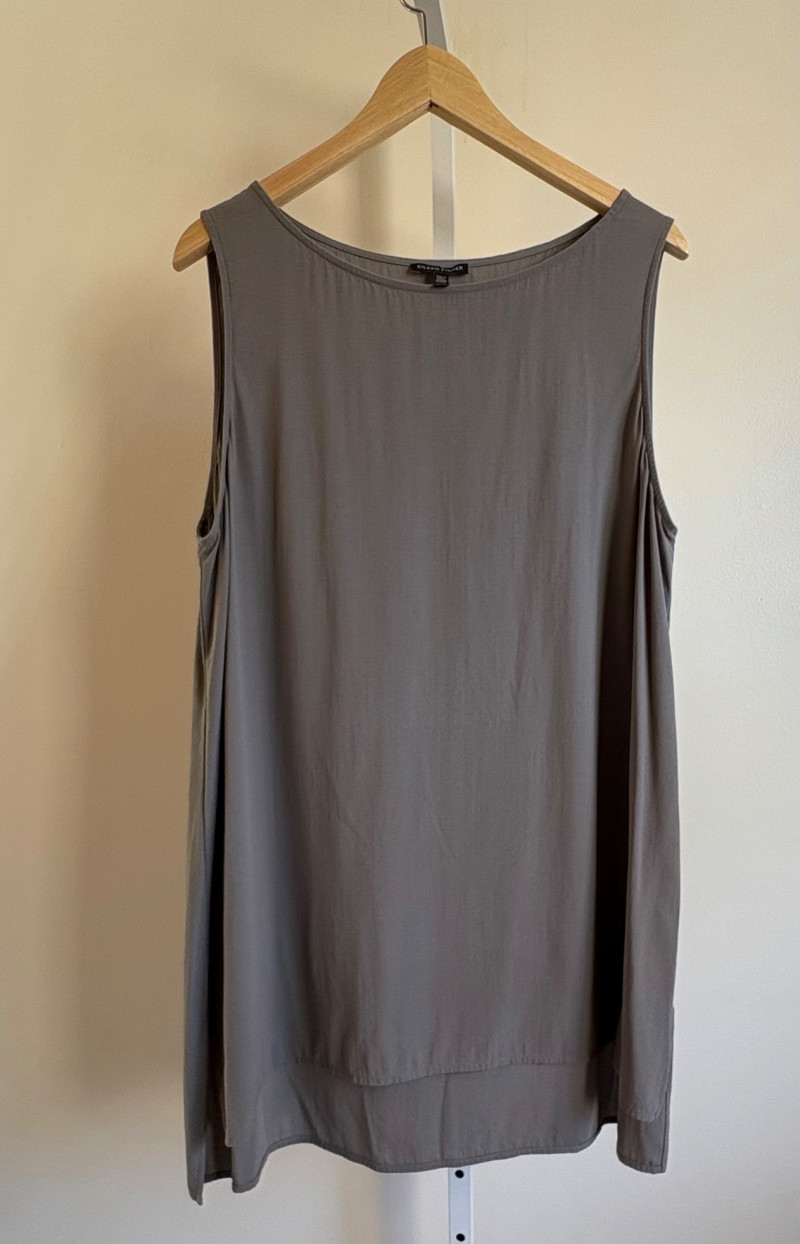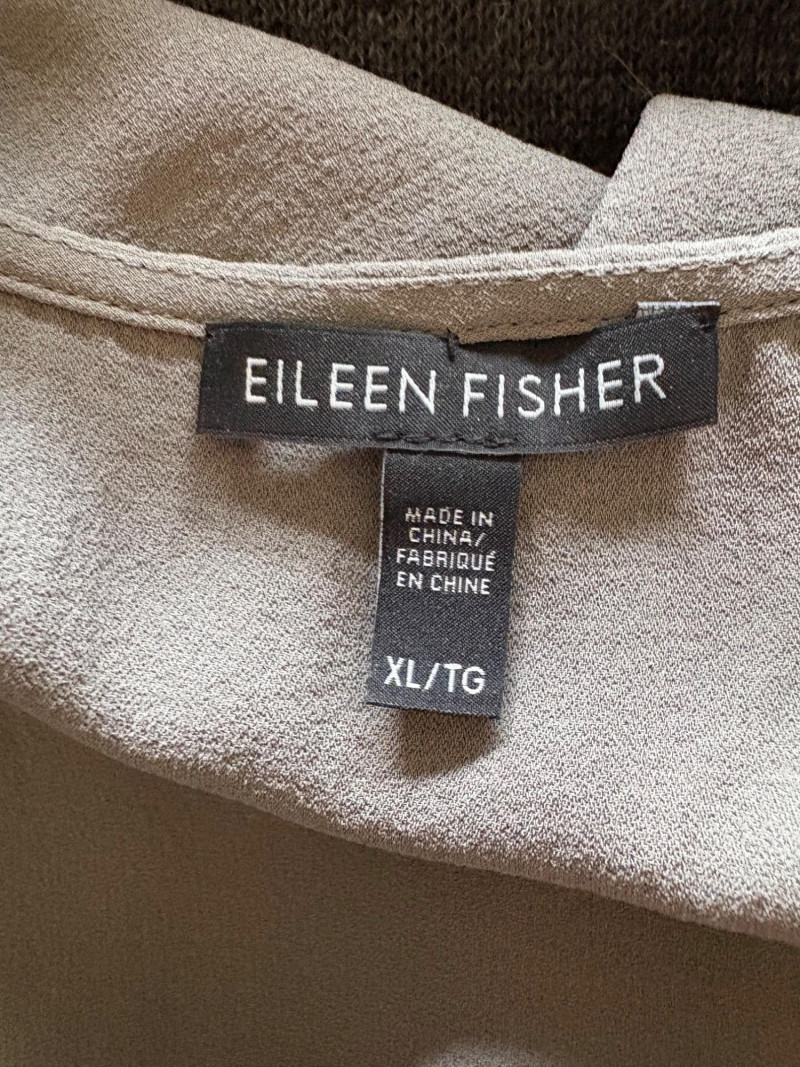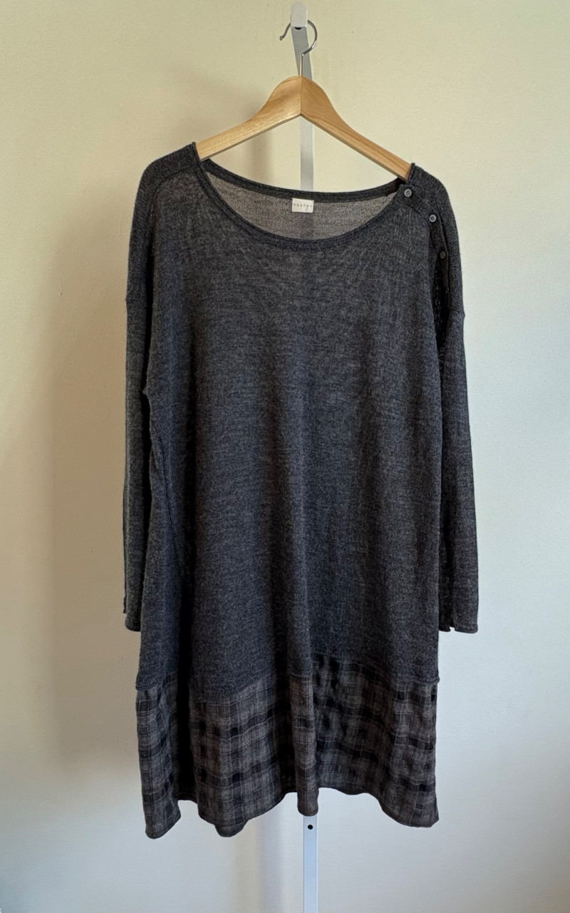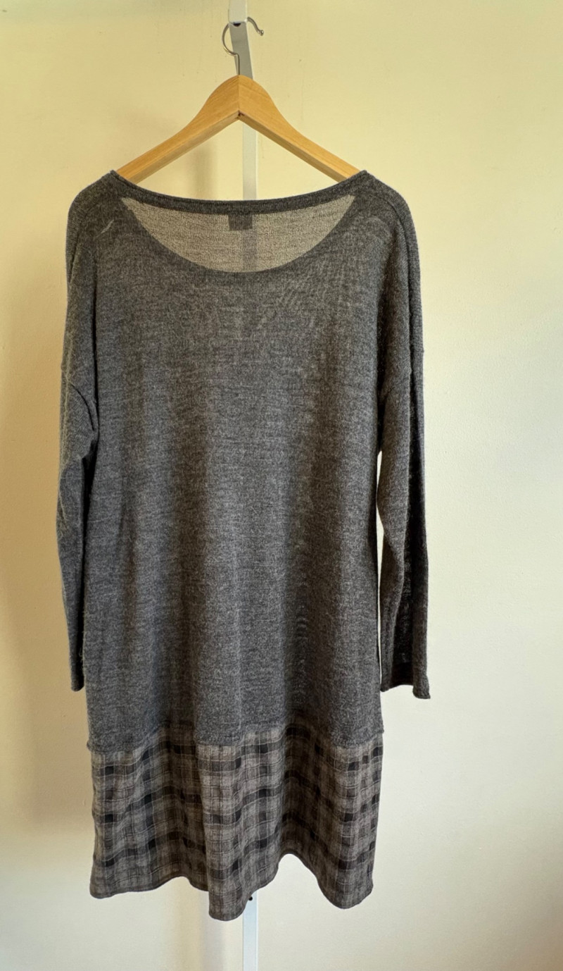 Two grey pieces; one more casual & one more dressy from Eileen Fisher & Poetry. Grey lightweight knit dress from Poetry has straight lines, button shoulder closure, split hem & cuffs, and black & grey plaid horizontal border at hem with a horizontal point on the right. In good condition. Knit top part of dress is 100% alpaca while the plaid border trim is 72% wool with 15% viscose and 13% polyester. Measures 23" pit to pit and 34" from back neckline to bottom back hem. Size tag says 16. Medium grey tunic from Eileen Fisher has rounded neck and split hem with lower hem about 3" longer than the front hem. In excellent condition. 100% silk. Measures 22.5" pit to pit and 32" from center back neckline to back center hemline. Size tag says XL.