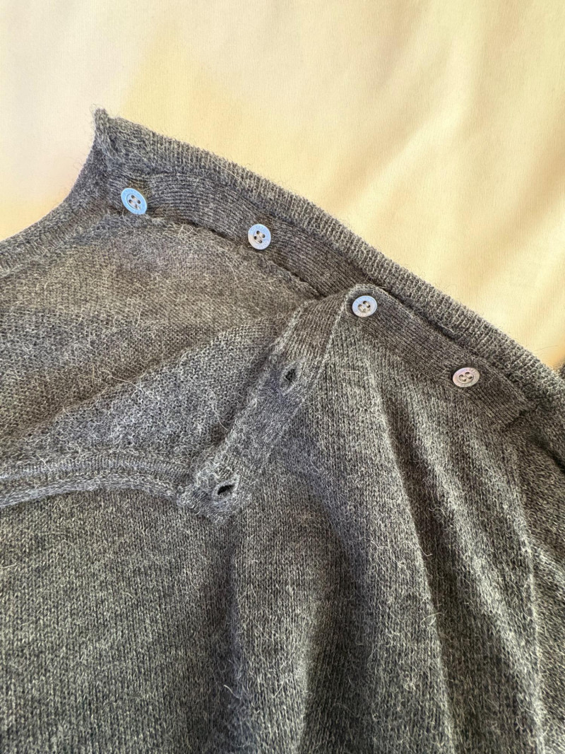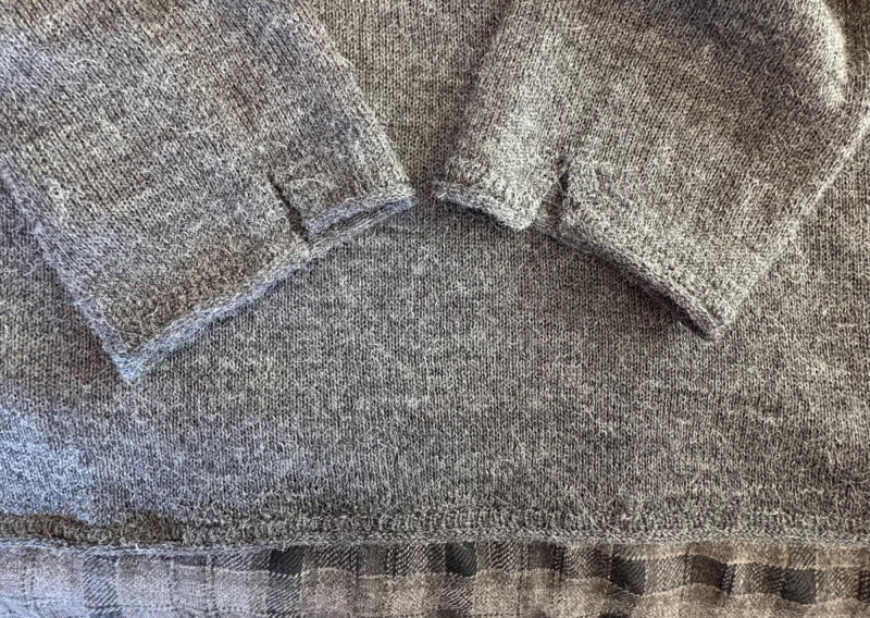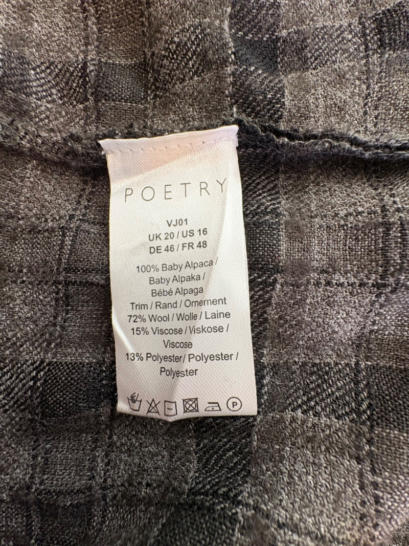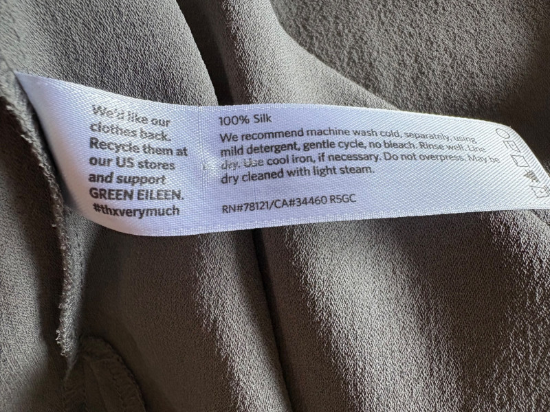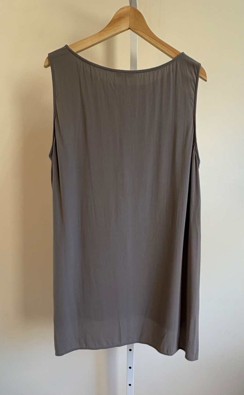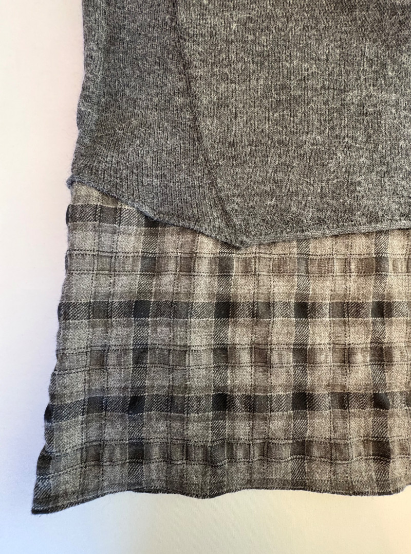 Two grey pieces; one more casual & one more dressy from Eileen Fisher & Poetry. Grey lightweight knit dress from Poetry has straight lines, button shoulder closure, split hem & cuffs, and black & grey plaid horizontal border at hem with a horizontal point on the right. In good condition. Knit top part of dress is 100% alpaca while the plaid border trim is 72% wool with 15% viscose and 13% polyester. Measures 23" pit to pit and 34" from back neckline to bottom back hem. Size tag says 16. Medium grey tunic from Eileen Fisher has rounded neck and split hem with lower hem about 3" longer than the front hem. In excellent condition. 100% silk. Measures 22.5" pit to pit and 32" from center back neckline to back center hemline. Size tag says XL.