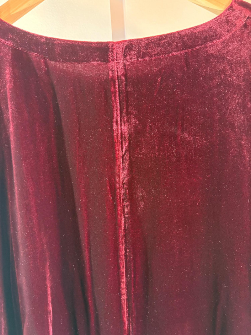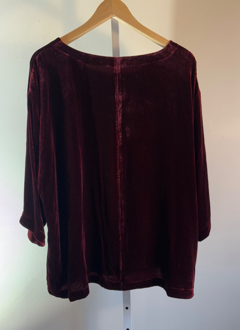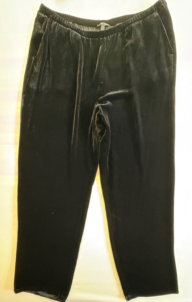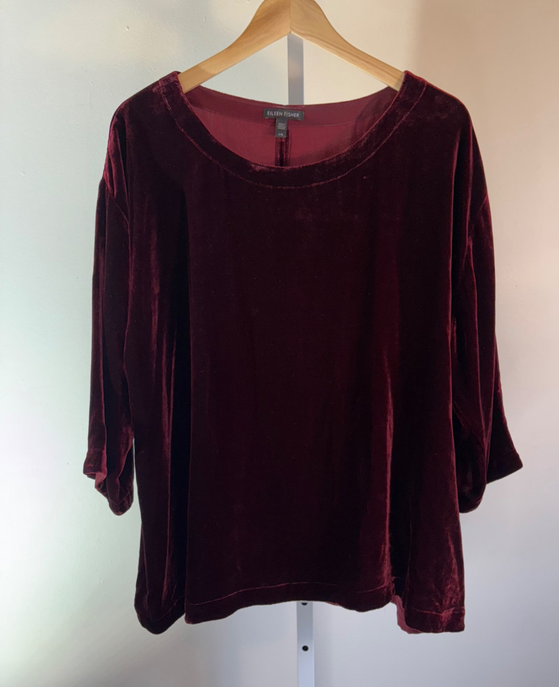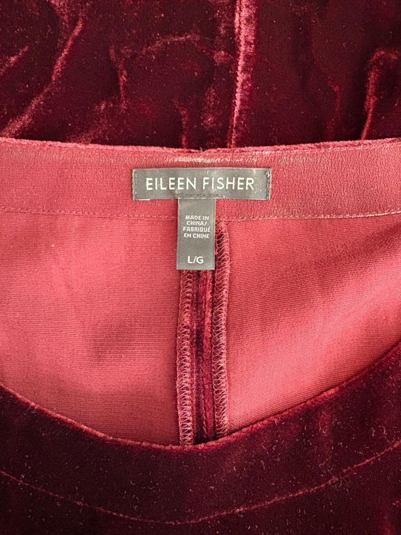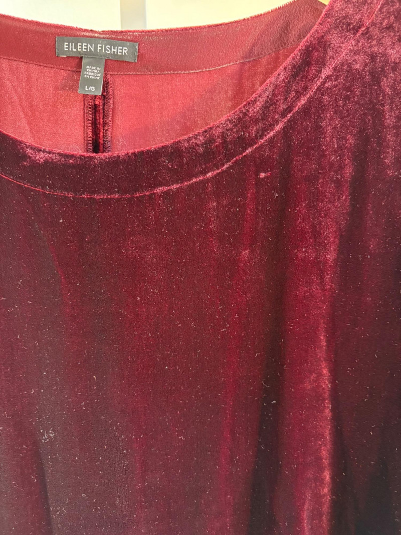 Three dressy but comfortable pieces in velvet blends from Eileen Fisher.* Dressy black velvet duo is perfect for special occasions, dress it up or dress it down with the scarf of your choice. Tunic top has a banded collar with button front closure, 1-button sleeve placket, and 2-button cuff. 82% rayon with 18% silk. In good used condition.* Measures 24" pit to pit by 36" from center back neck seam to bottom back hem. Size tag says XL. Pants have elasticated waistband and set-in lined front pockets. 80% viscose with 20% silk. In good used condition. Measure 19.5" side to side at waist with a 27" inseam. Deep red/burgundy velvet top has curved neckline, dropped shoulder seams, and curved back hem. In good used condition. 82% rayon with 18% silk. Measures 25" pit to pit and 25" from neck edge to bottom hem. Size tag says L/G. *Please note that velvet blends are very hard to photograph because of light reflected in the nap. "Flat" areas in the photo are much less noticeable IRL. However, the pieces do show use - the black ones in particular. Please see last photo.