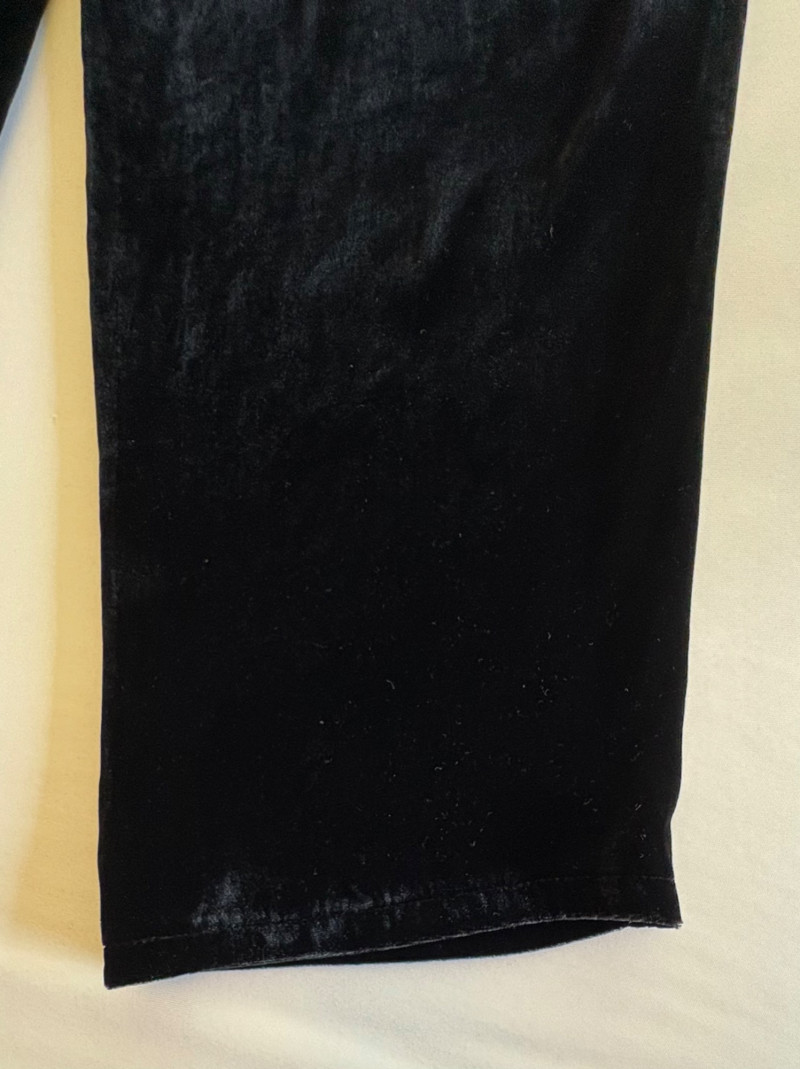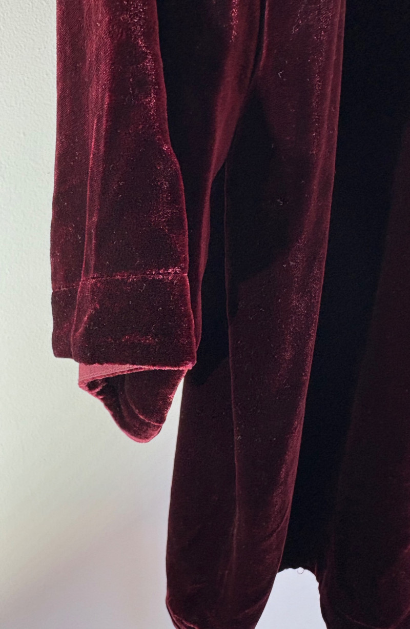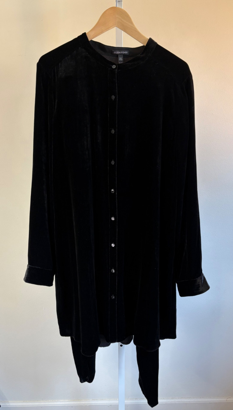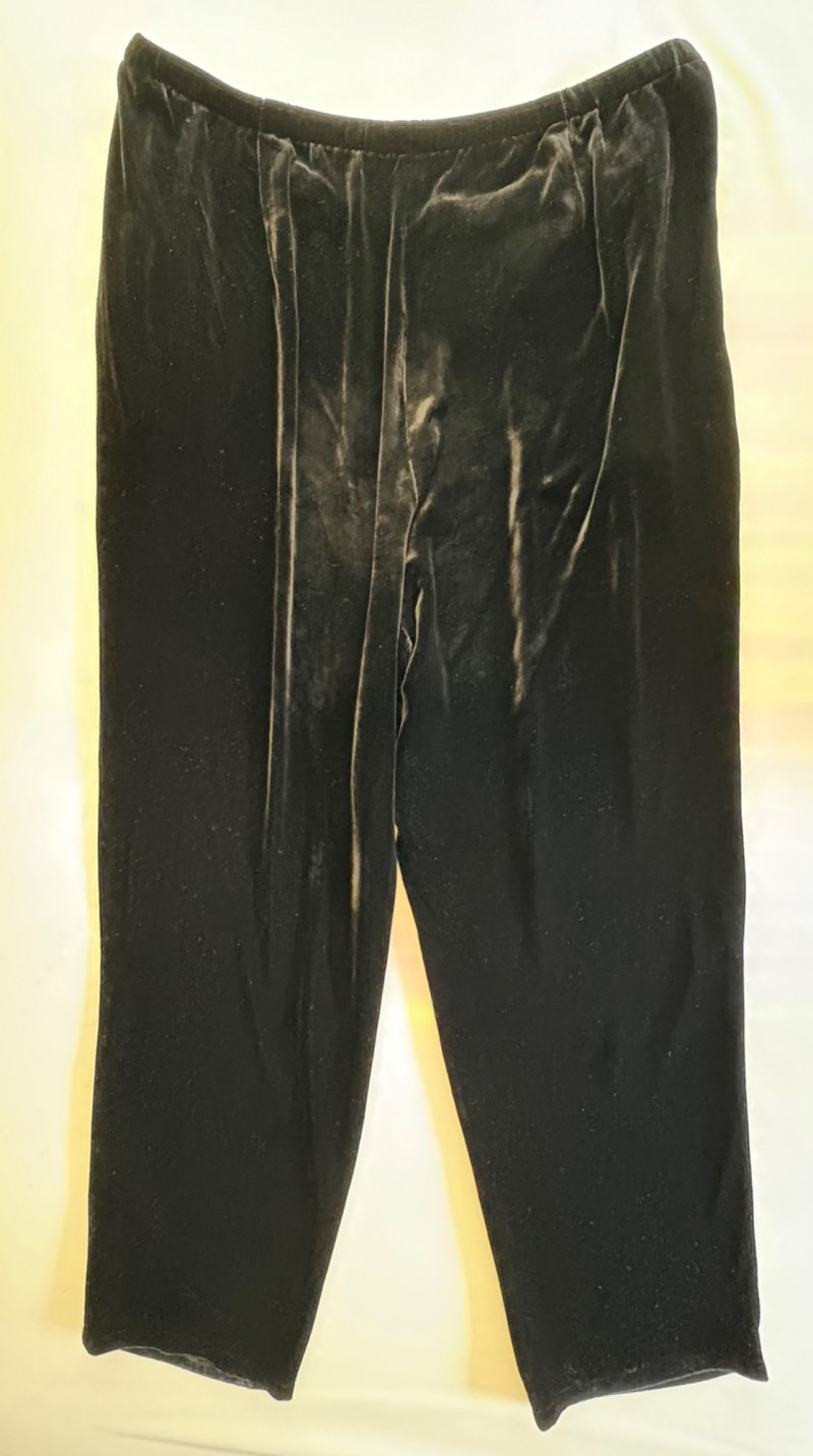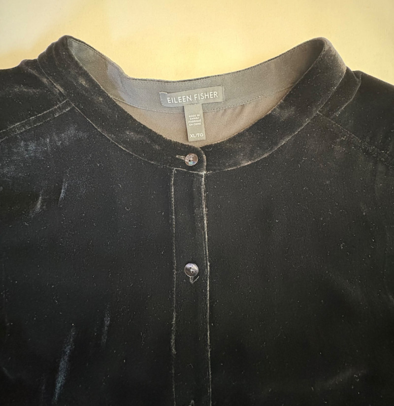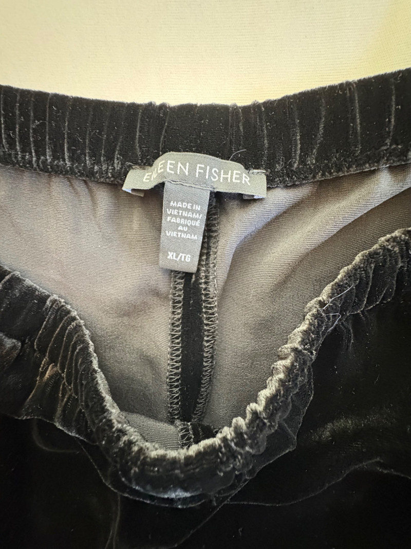 Three dressy but comfortable pieces in velvet blends from Eileen Fisher.* Dressy black velvet duo is perfect for special occasions, dress it up or dress it down with the scarf of your choice. Tunic top has a banded collar with button front closure, 1-button sleeve placket, and 2-button cuff. 82% rayon with 18% silk. In good used condition.* Measures 24" pit to pit by 36" from center back neck seam to bottom back hem. Size tag says XL. Pants have elasticated waistband and set-in lined front pockets. 80% viscose with 20% silk. In good used condition. Measure 19.5" side to side at waist with a 27" inseam. Deep red/burgundy velvet top has curved neckline, dropped shoulder seams, and curved back hem. In good used condition. 82% rayon with 18% silk. Measures 25" pit to pit and 25" from neck edge to bottom hem. Size tag says L/G. *Please note that velvet blends are very hard to photograph because of light reflected in the nap. "Flat" areas in the photo are much less noticeable IRL. However, the pieces do show use - the black ones in particular. Please see last photo.