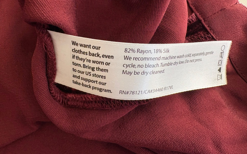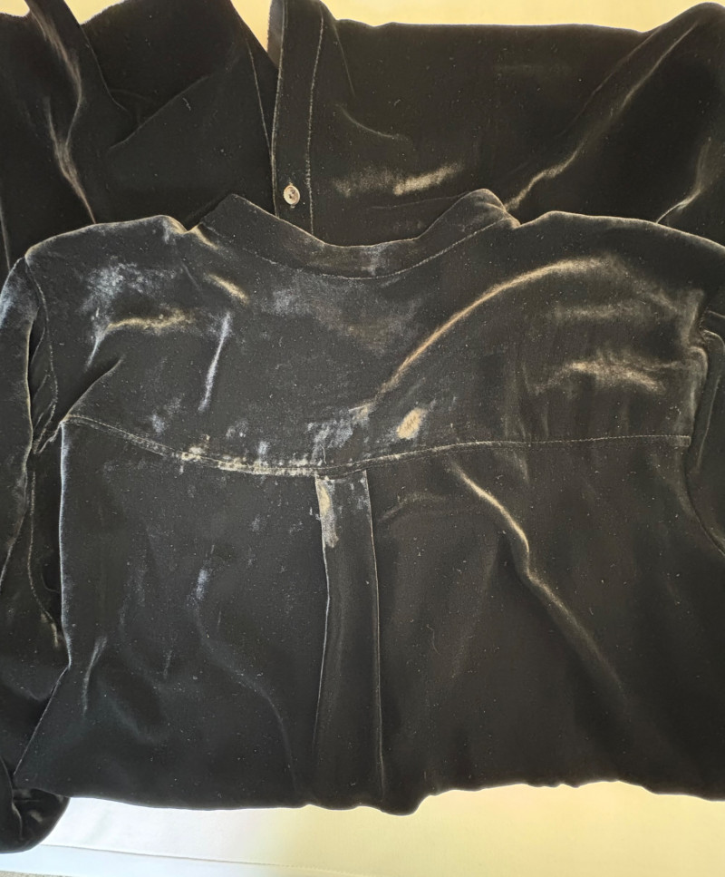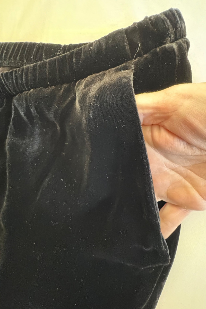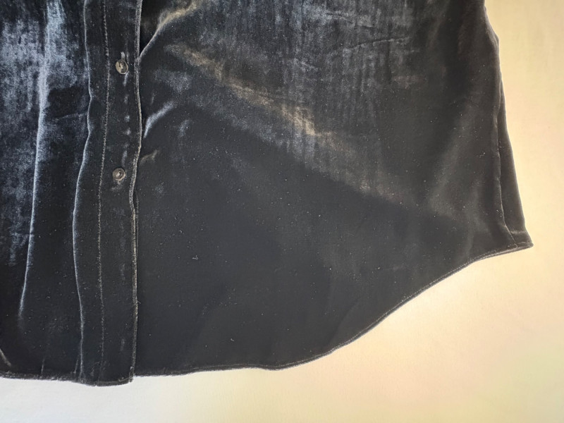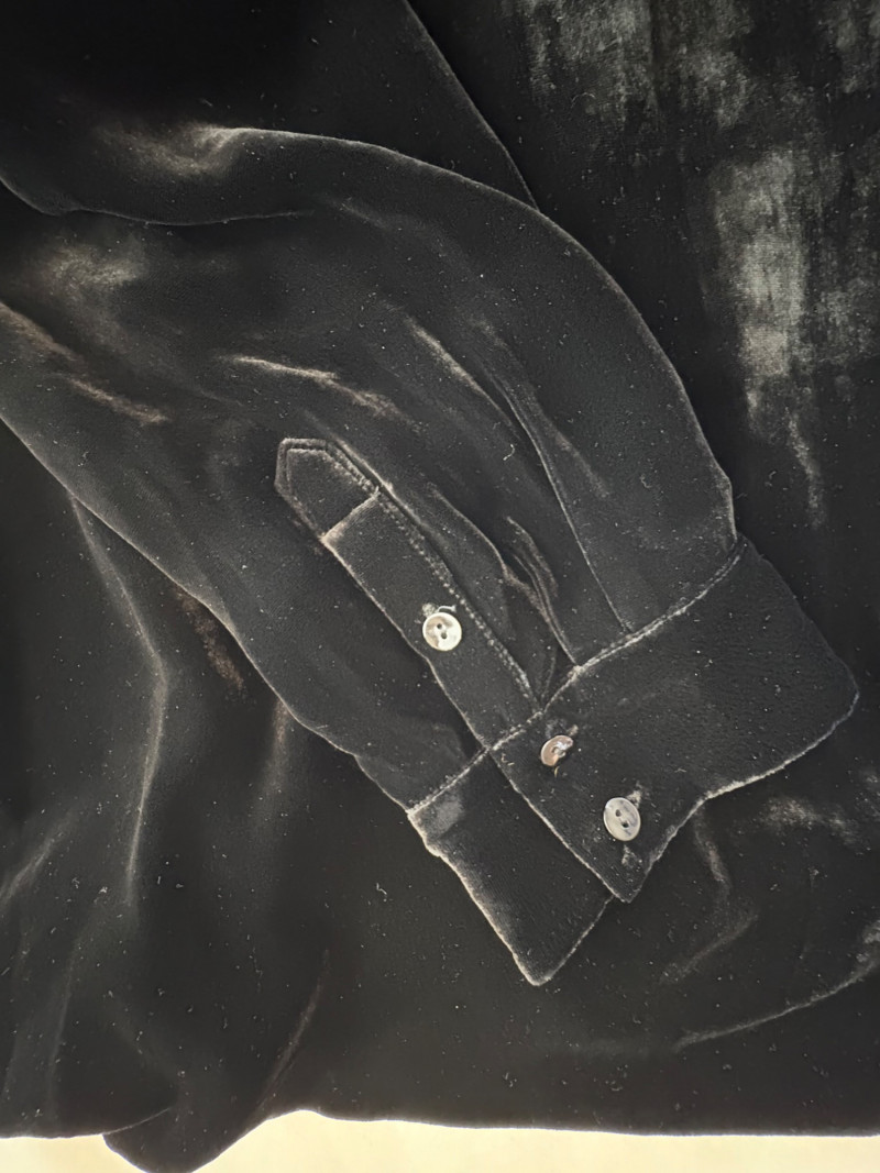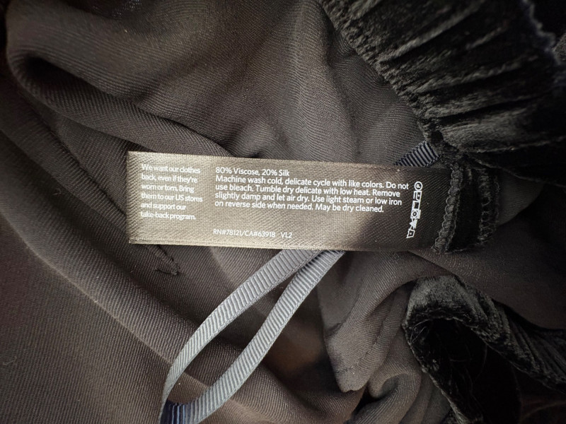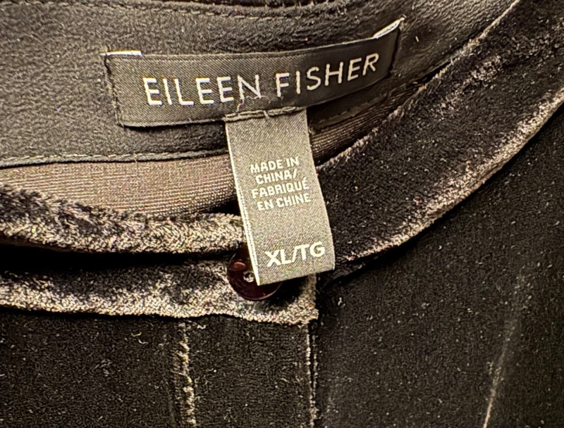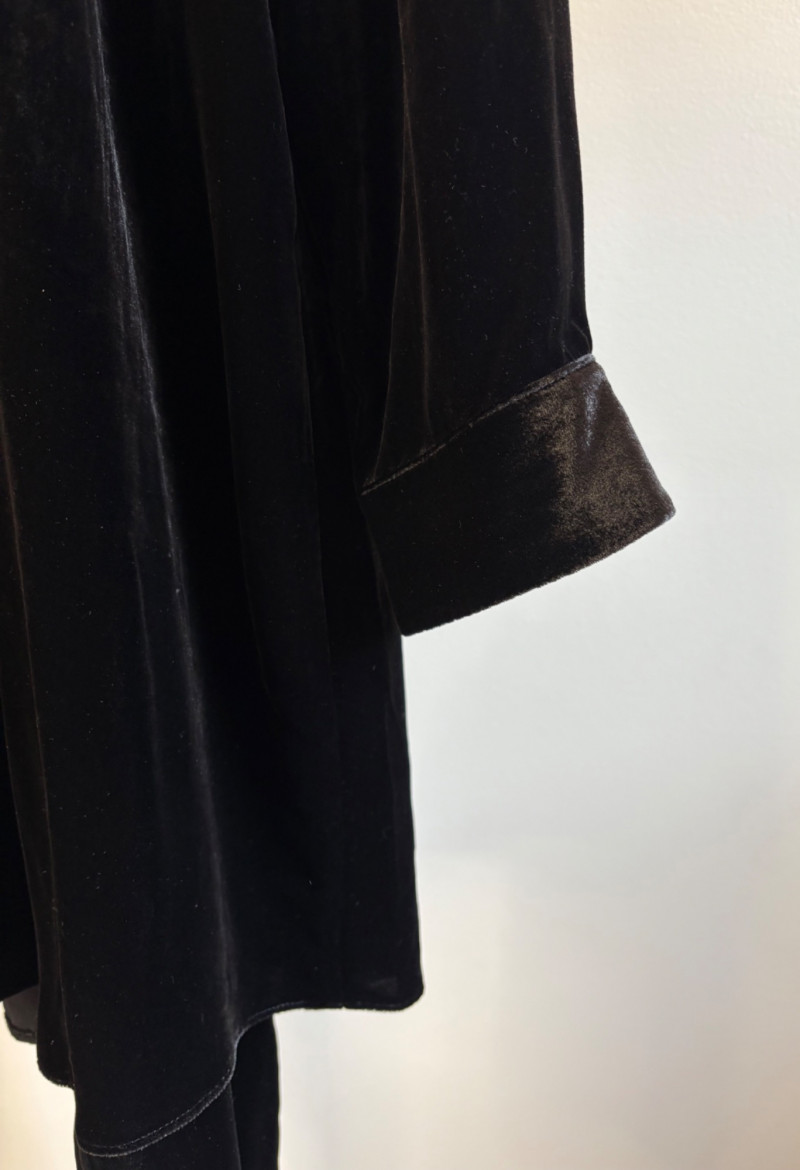Three dressy but comfortable pieces in velvet blends from Eileen Fisher.* Dressy black velvet duo is perfect for special occasions, dress it up or dress it down with the scarf of your choice. Tunic top has a banded collar with button front closure, 1-button sleeve placket, and 2-button cuff. 82% rayon with 18% silk. In good used condition.* Measures 24" pit to pit by 36" from center back neck seam to bottom back hem. Size tag says XL. Pants have elasticated waistband and set-in lined front pockets. 80% viscose with 20% silk. In good used condition. Measure 19.5" side to side at waist with a 27" inseam. Deep red/burgundy velvet top has curved neckline, dropped shoulder seams, and curved back hem. In good used condition. 82% rayon with 18% silk. Measures 25" pit to pit and 25" from neck edge to bottom hem. Size tag says L/G. *Please note that velvet blends are very hard to photograph because of light reflected in the nap. "Flat" areas in the photo are much less noticeable IRL. However, the pieces do show use - the black ones in particular. Please see last photo.
