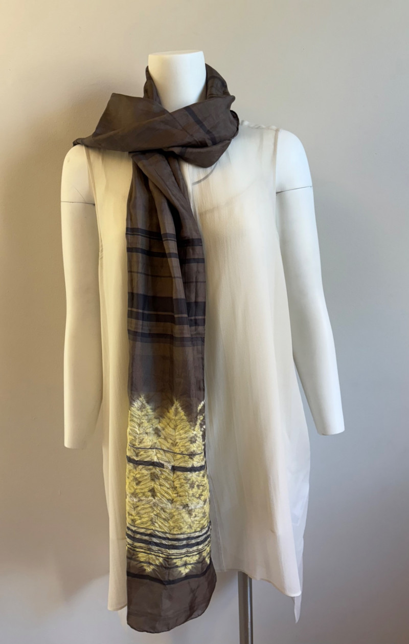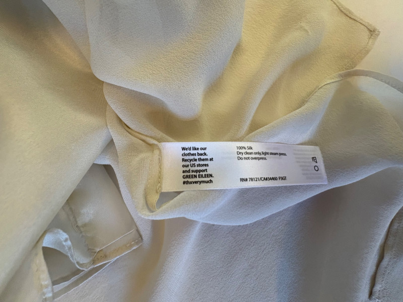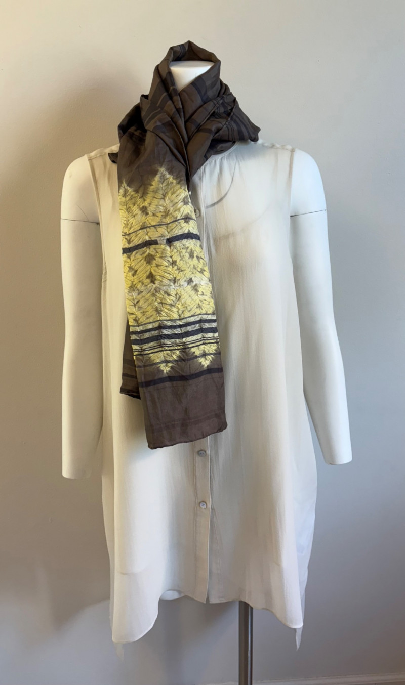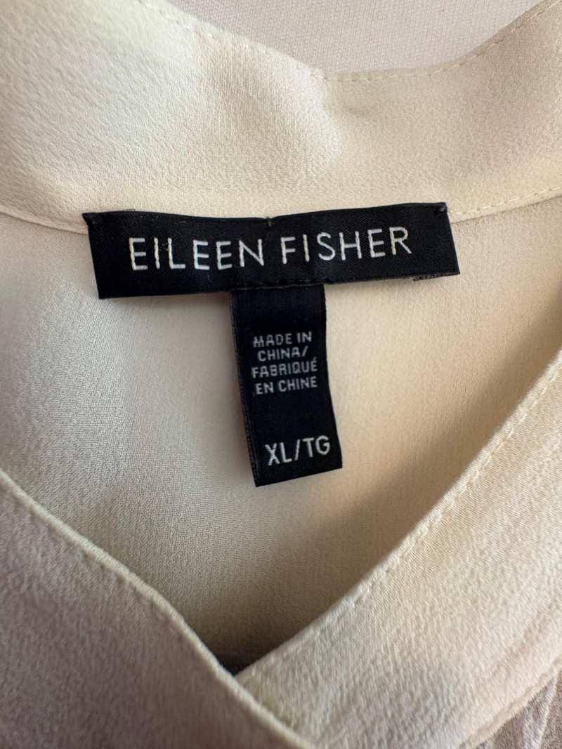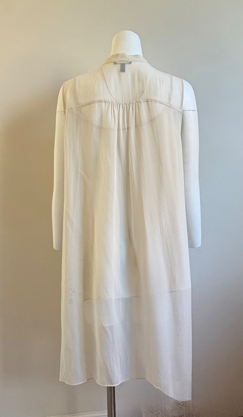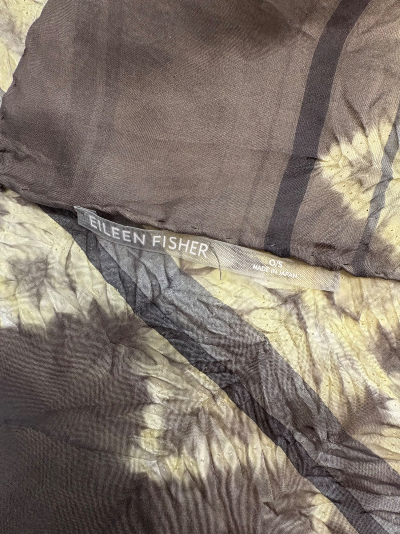 Lovely ivory silk tunic with separate camisole and scarf from Eileen Fisher. Long flowing tunic with button front closure, curved neck, and split hem. Back hem is about 3" longer than front hem. Fabric is very delicate and transparent, so a matching camisole is included. The camisole has adjustable spaghetti straps and the client added an invisible snap to the tunic to prevent any bust gapping. All pieces are in great condition, but we found a minor discoloration on the back collar of the tunic when doing photographing (we think it should launder out) - see last photo. Both tunic and camisole are 100% silk. Tunic measures 22" pit to pit and 36" from back neckline to bottom of back hemline. Size tag says XL. Scarf has fine batik-like print in ivory, brown. and yellow. Fabric tag is missing, but we believe it is 100% silk given the feel. Measures approx. 15' x 74". In good condition.