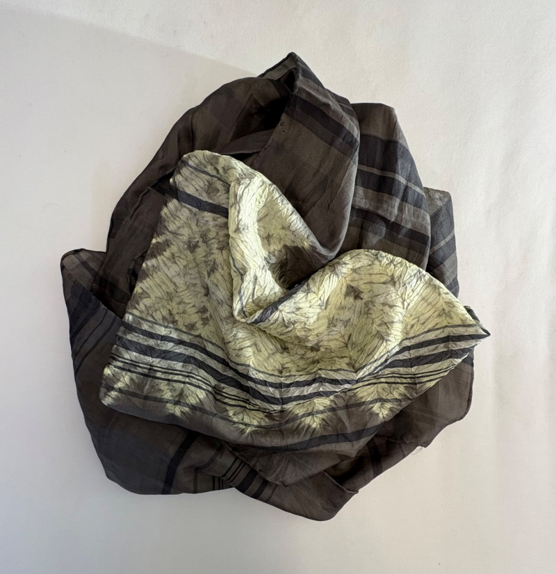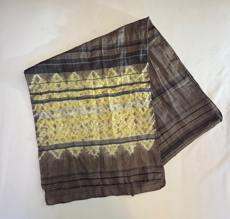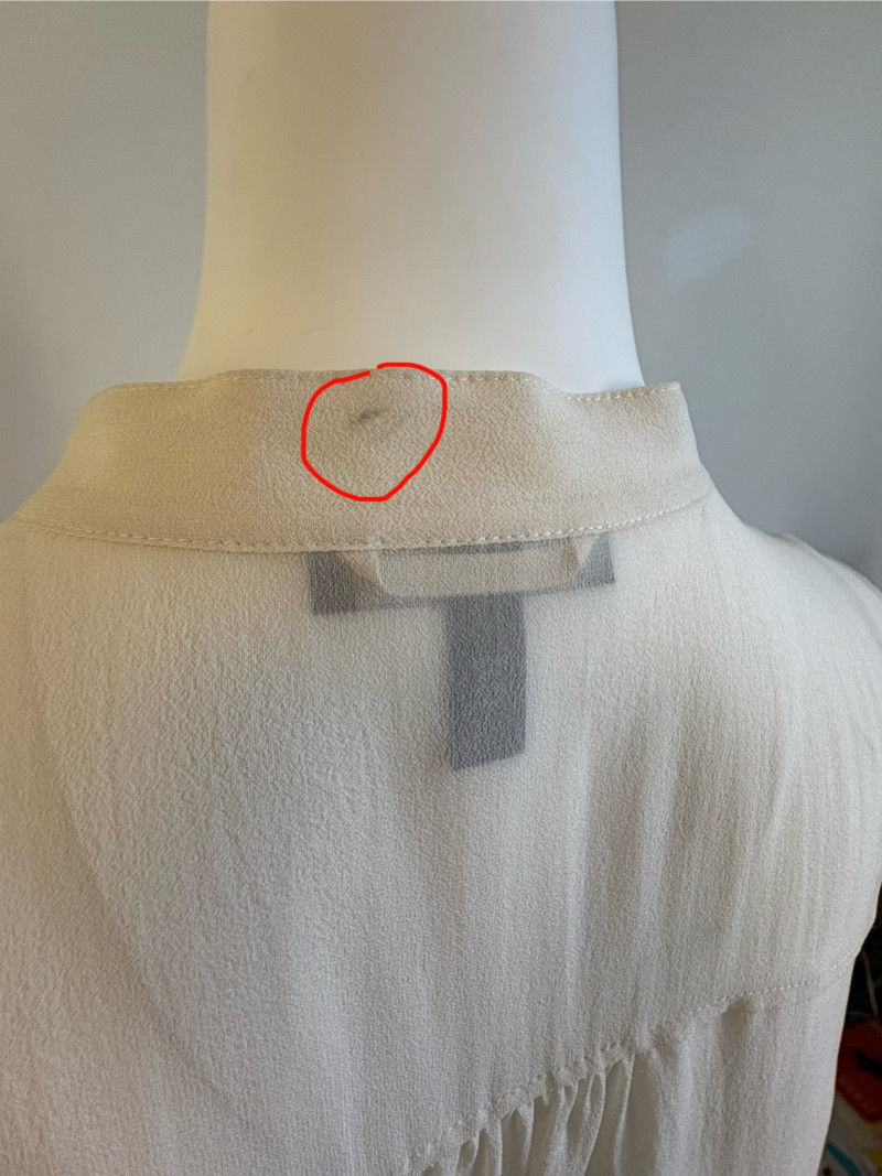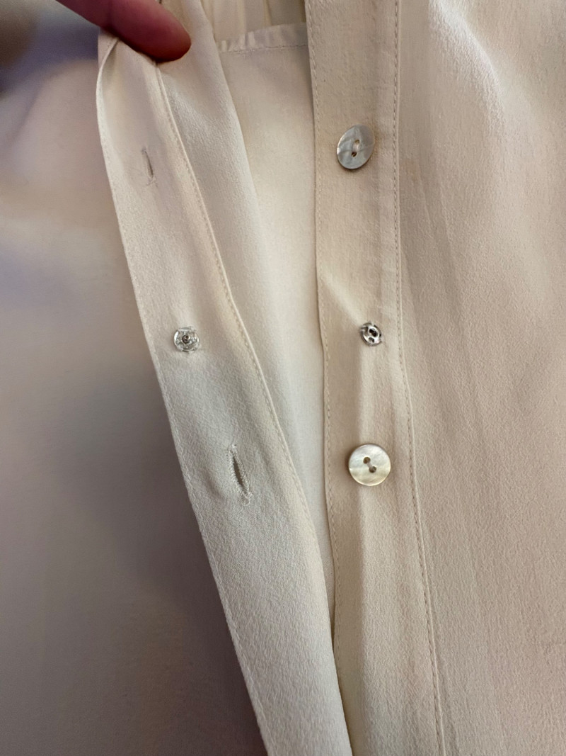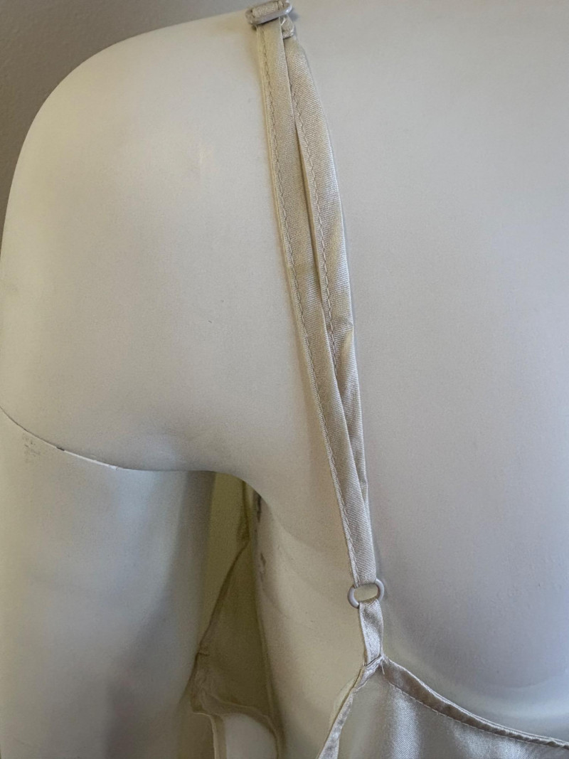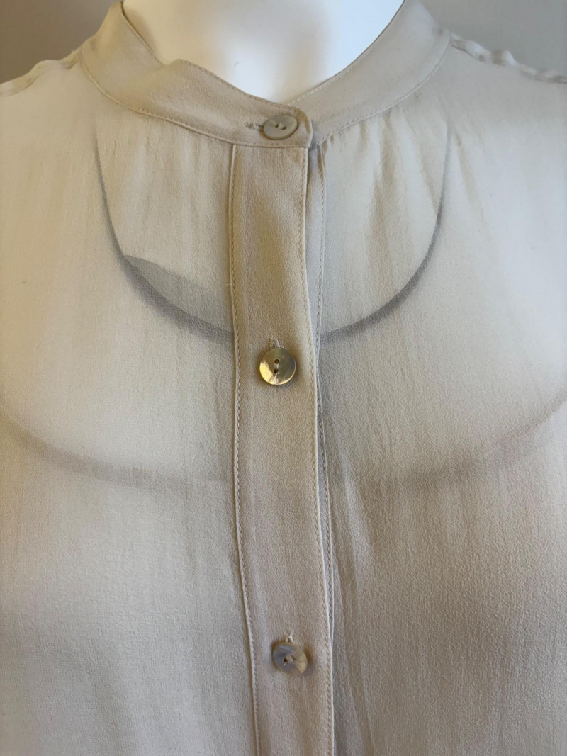 Lovely ivory silk tunic with separate camisole and scarf from Eileen Fisher. Long flowing tunic with button front closure, curved neck, and split hem. Back hem is about 3" longer than front hem. Fabric is very delicate and transparent, so a matching camisole is included. The camisole has adjustable spaghetti straps and the client added an invisible snap to the tunic to prevent any bust gapping. All pieces are in great condition, but we found a minor discoloration on the back collar of the tunic when doing photographing (we think it should launder out) - see last photo. Both tunic and camisole are 100% silk. Tunic measures 22" pit to pit and 36" from back neckline to bottom of back hemline. Size tag says XL. Scarf has fine batik-like print in ivory, brown. and yellow. Fabric tag is missing, but we believe it is 100% silk given the feel. Measures approx. 15' x 74". In good condition.