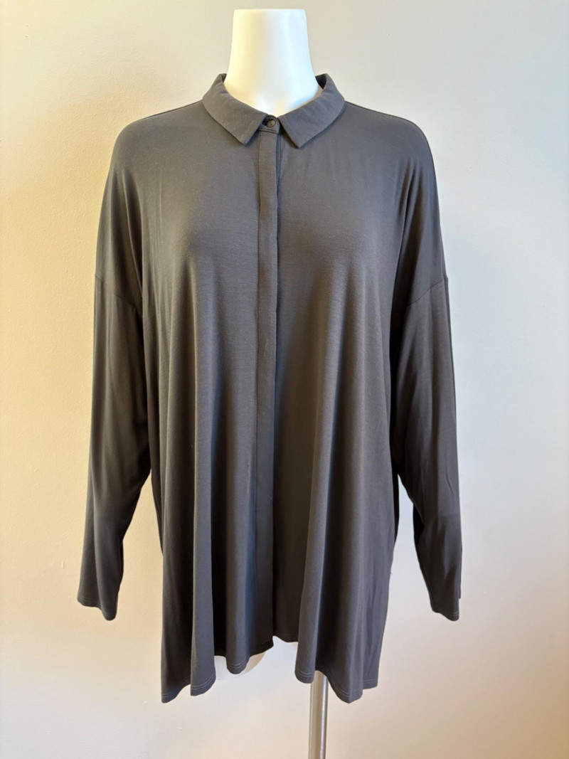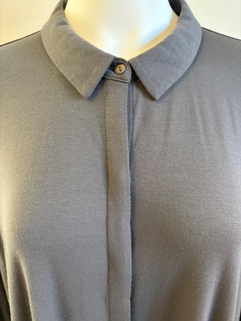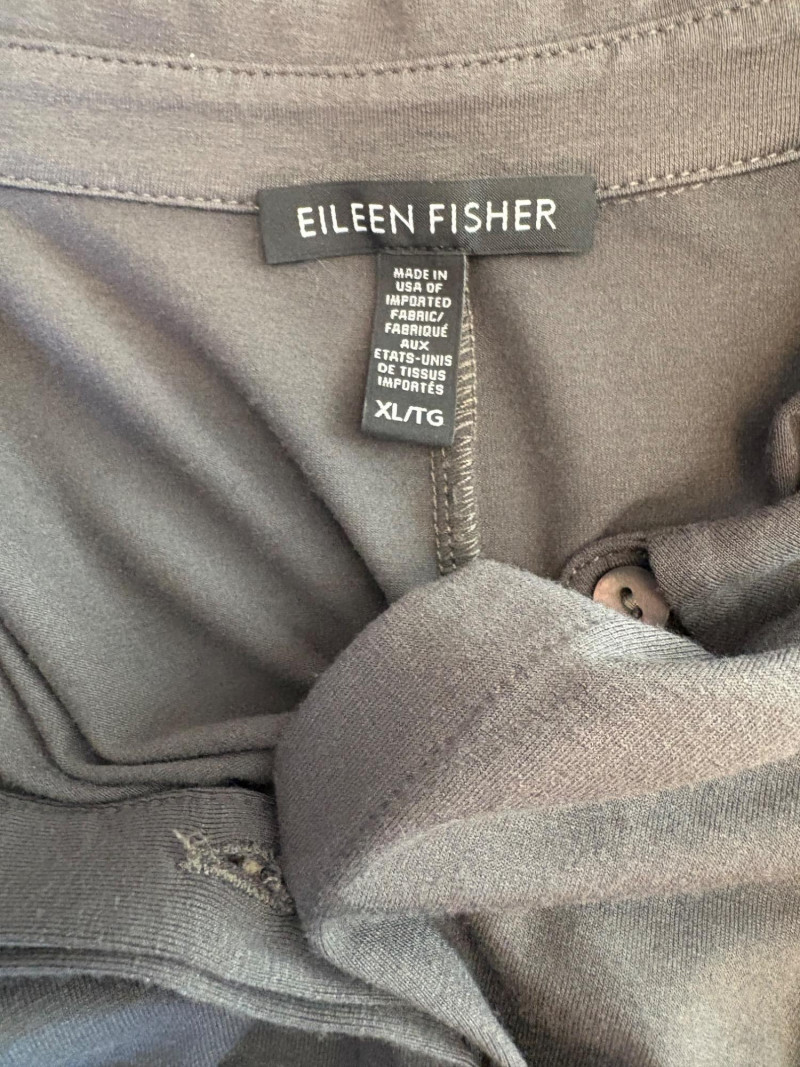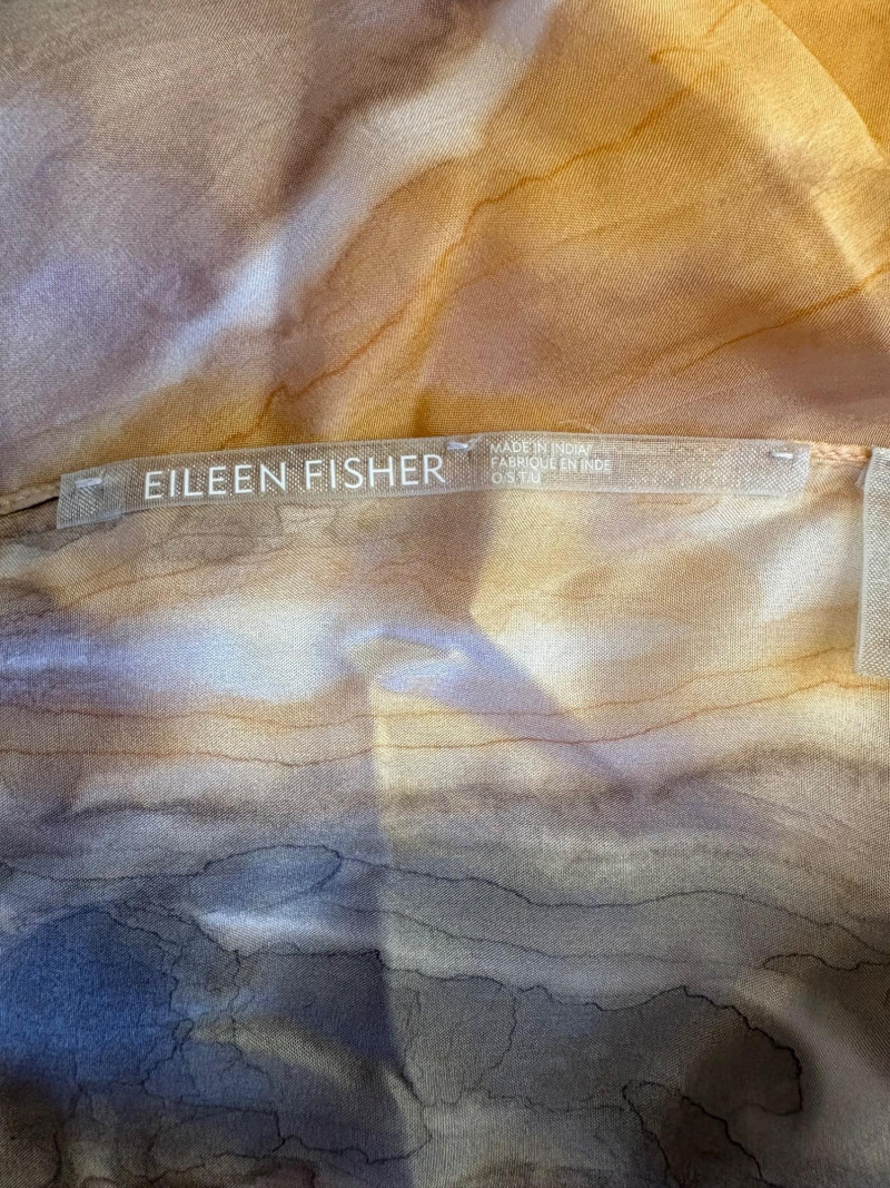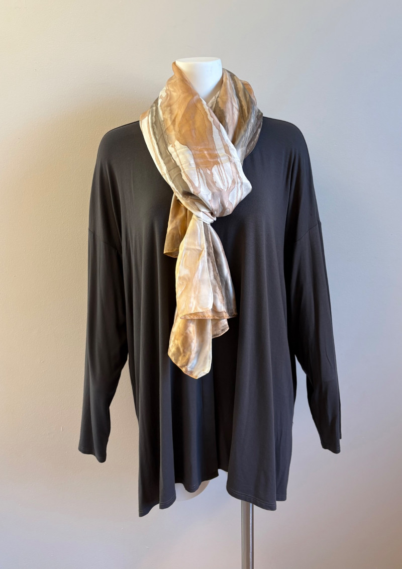 Knit top and silk scarf from Eileen Fisher. Medium gray smooth knit top has long sleeves, button front closure with hidden placket, small collar, and split hem. In excellent condition. 95% viscose with 5% spandex. Measures 26.5" pit to pit and 29" from back neckline seam to bottom hem. Size tag says XL. Neutral tone scarf in cream, beige, and brown ink wash pattern. In great condition. 100% silk. Measures approximately 21" X 75".