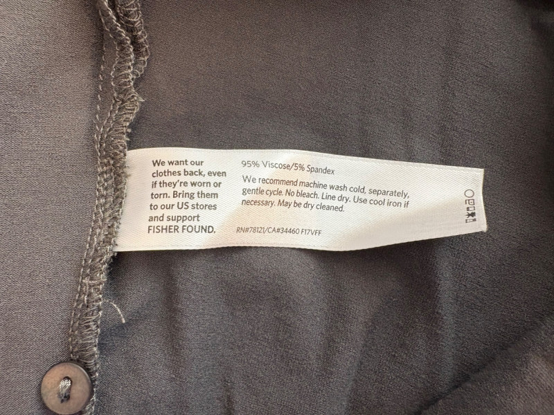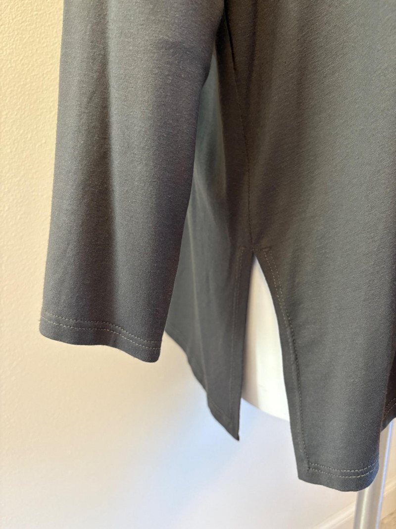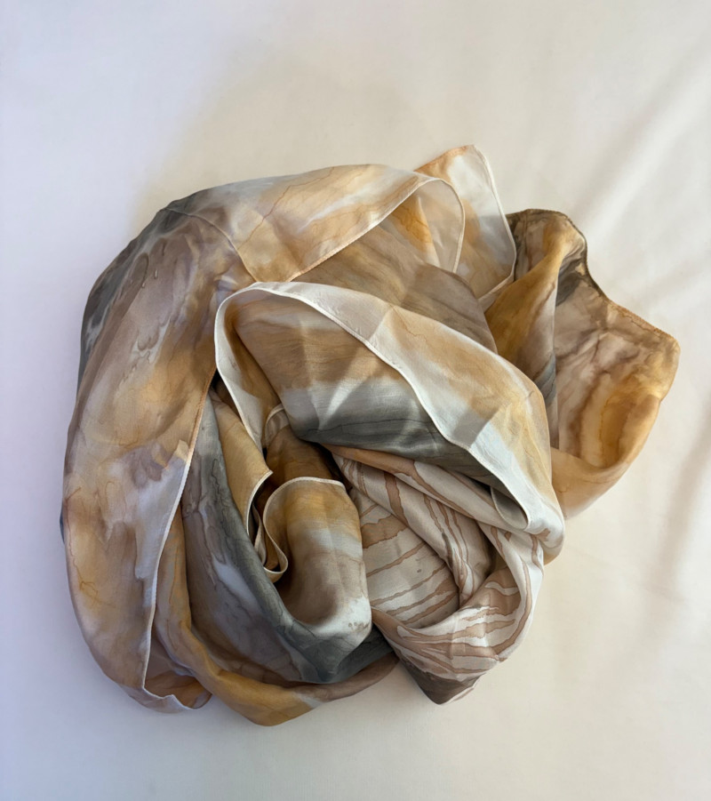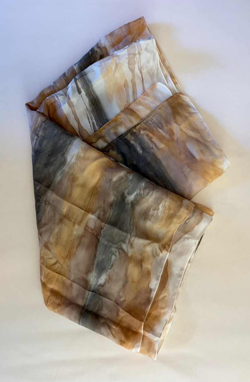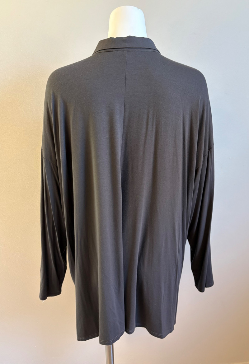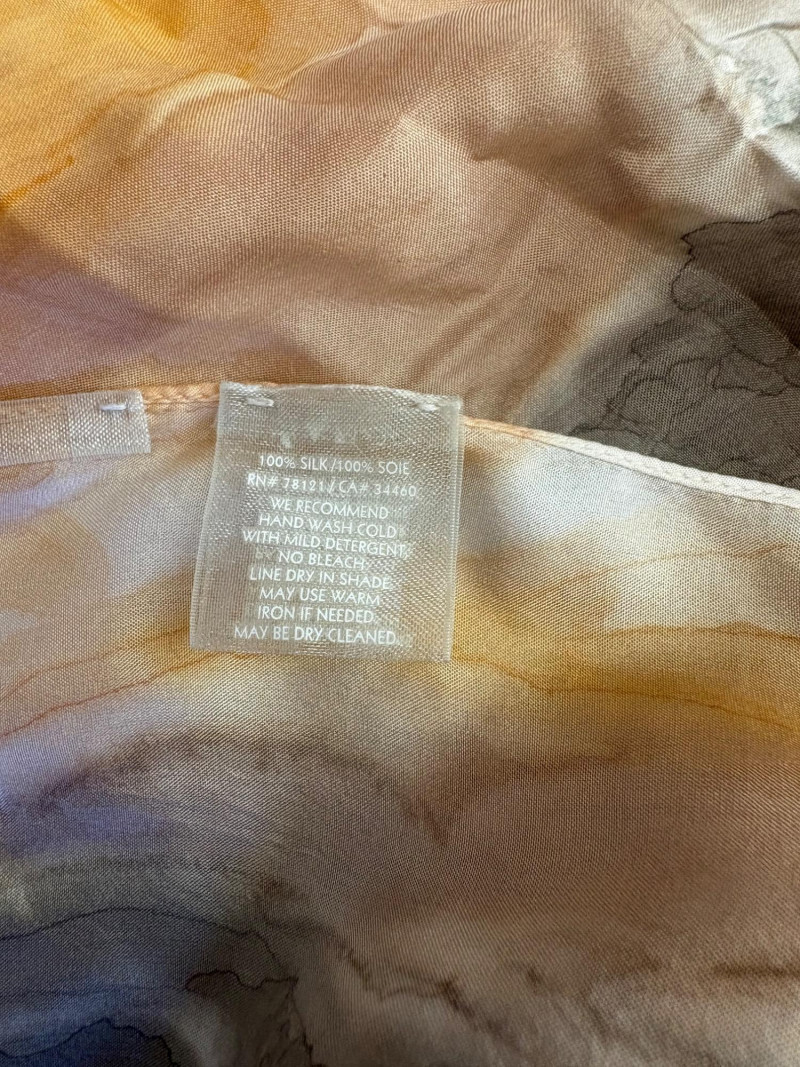 Knit top and silk scarf from Eileen Fisher. Medium gray smooth knit top has long sleeves, button front closure with hidden placket, small collar, and split hem. In excellent condition. 95% viscose with 5% spandex. Measures 26.5" pit to pit and 29" from back neckline seam to bottom hem. Size tag says XL. Neutral tone scarf in cream, beige, and brown ink wash pattern. In great condition. 100% silk. Measures approximately 21" X 75".
