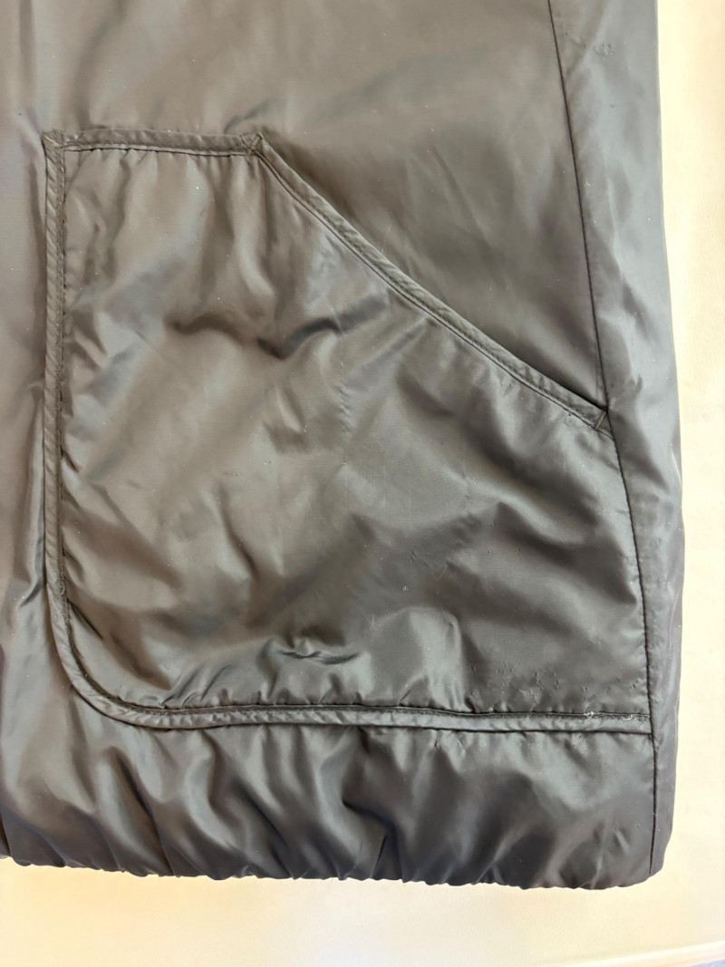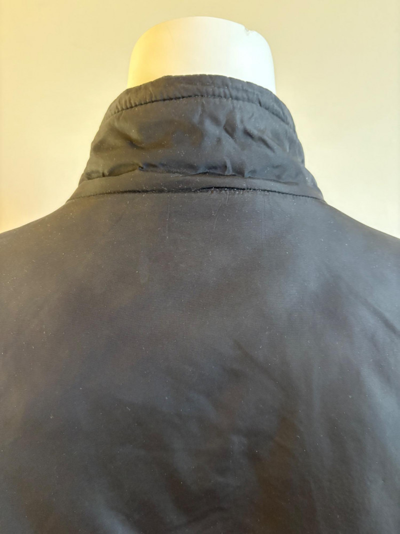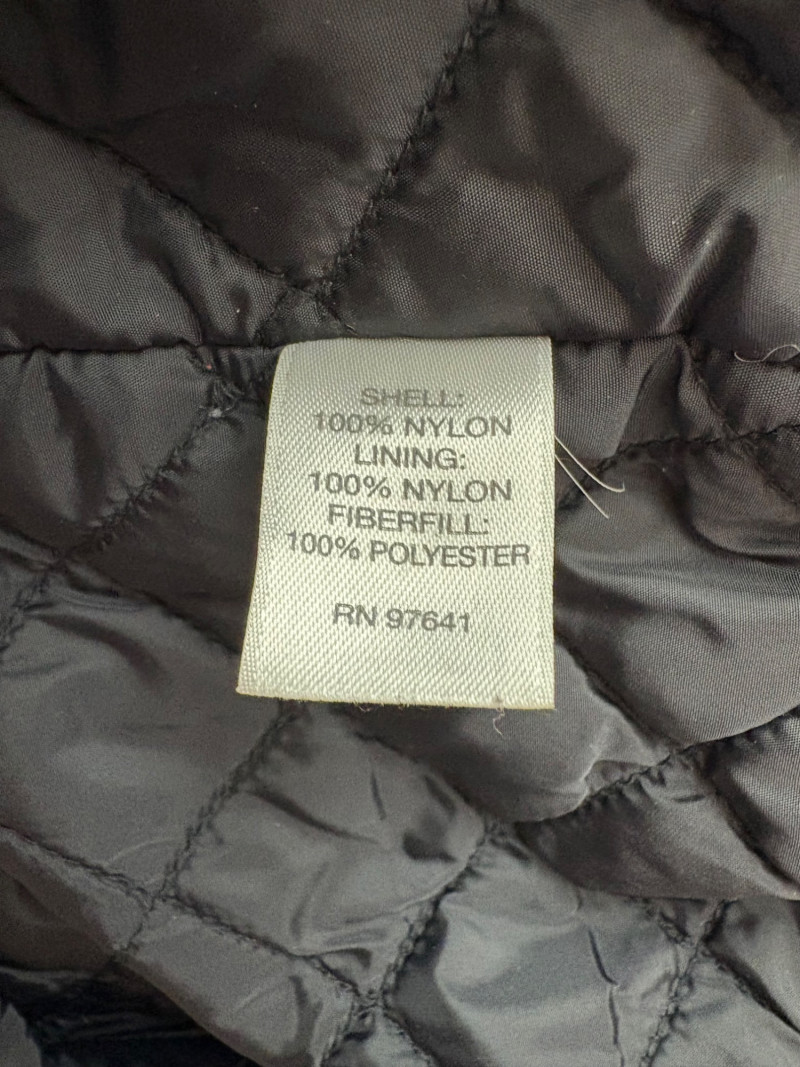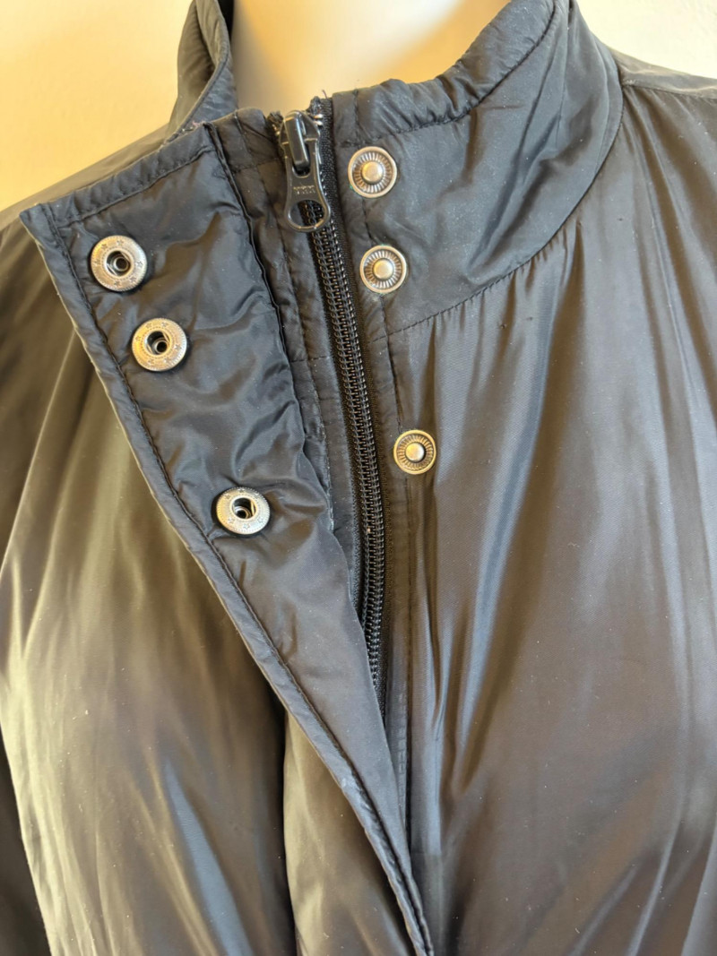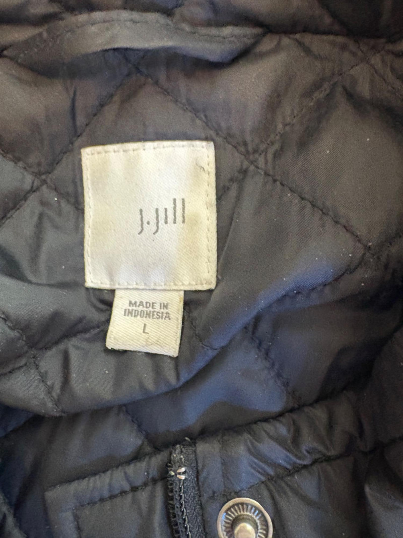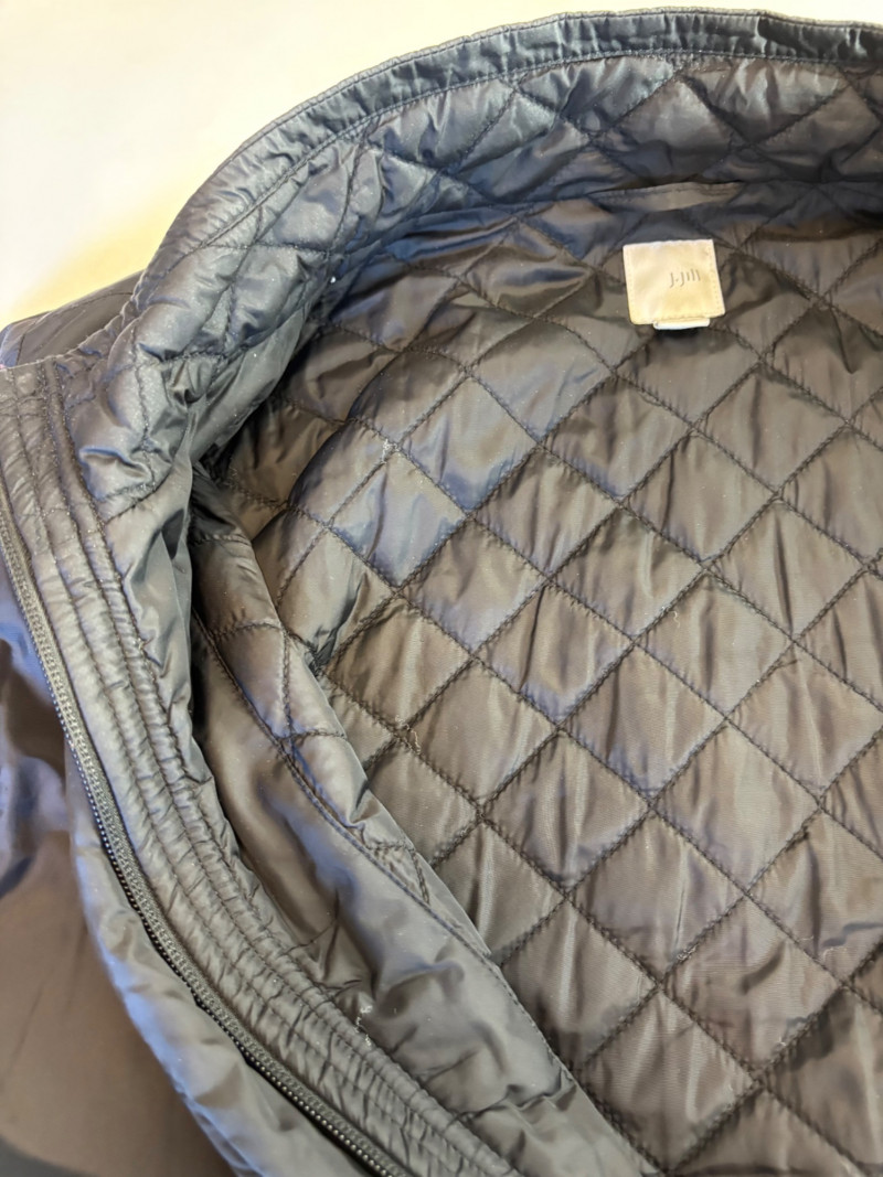 Midweight black coat from J. Jill - perfect for seasonal transitions. Zip close front with snaps, funnel neck collar, and front patch pockets. In very good used condition. Quilted interior with light elastication around bottom hem. 100% nylon shell & filling. Measures 23.5" pit to pit and 29.5" from back neckline to bottom back hem. Size tag says L.