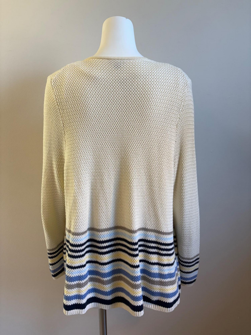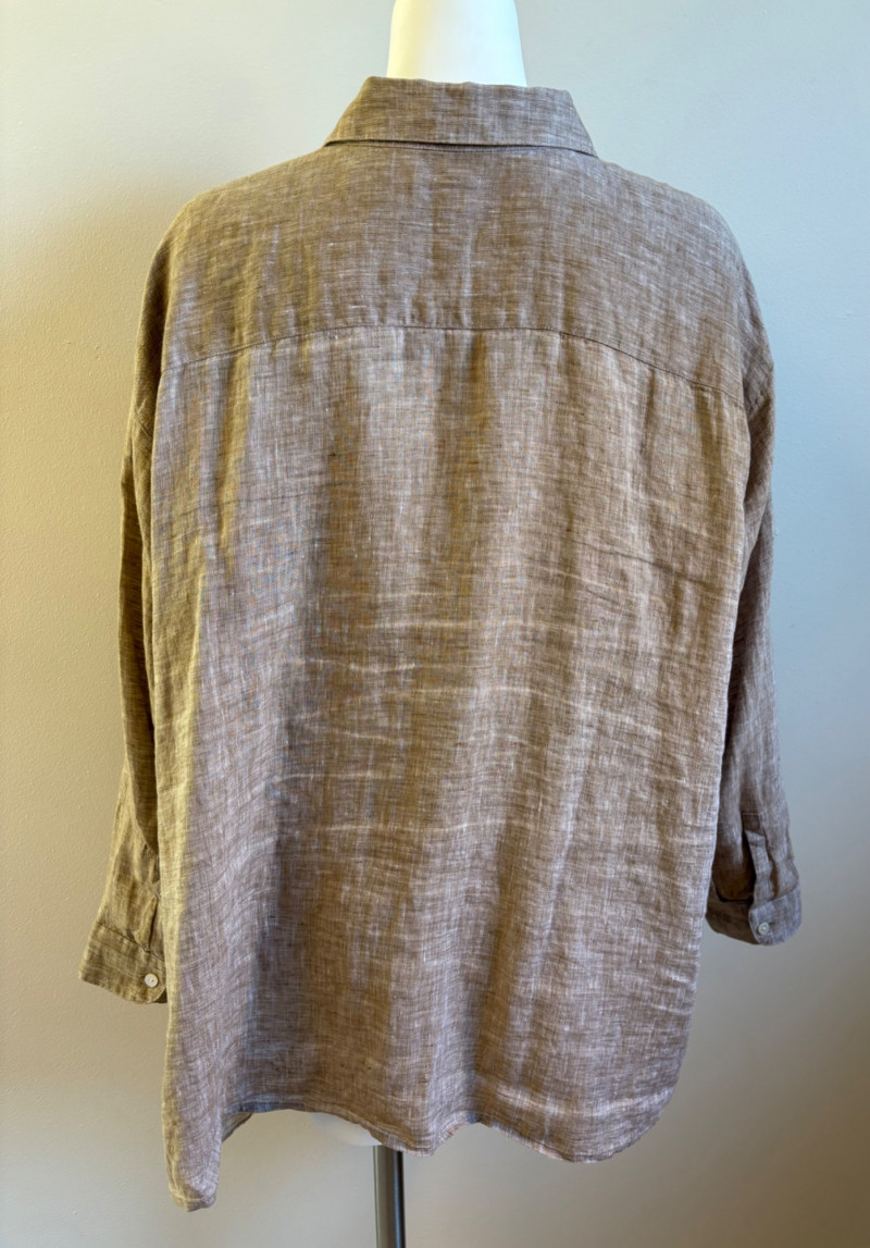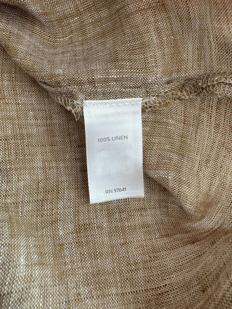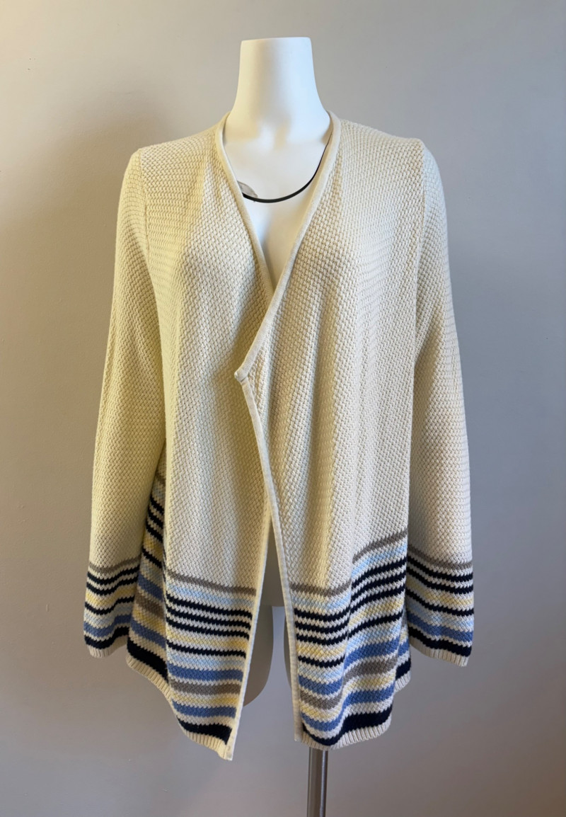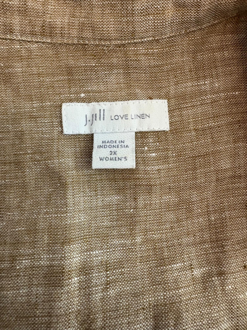 Two versatile pieces from J Jill. Pale brown shirt from J. Jill has front button closure with decorative split placket, single button cuff closures, left breast pocket, and back yoke along with split shirt hem with curves. 100% linen. In excellent condition. Measures 26" pit to pit and 28.5" from back neckline to bottom of back hem. Size tag says 2X. Open front multi-color woolen cardigan from J. Jill. with soft styling and smooth hand. Horizontal blue, beige, and yellow stripes at the waistline and cuffs. No front closure and beautiful open weave with ribbing along neckline, hem, and cuffs. 55% cotton with 25% viscose and 20% nylon. Measures 22" pit to pit and 26" from back neckline to back bottom hemline. Size tag says L. BONUS: White tank from Poetry in 55% hemp with 45% cotton. 2 pin-size small stains and tiny hole at neck; may be able to be laundered out/repaired. Measures 22.5" pit to pit and 27" from back of neck to bottom of hem. Size tag says 16.