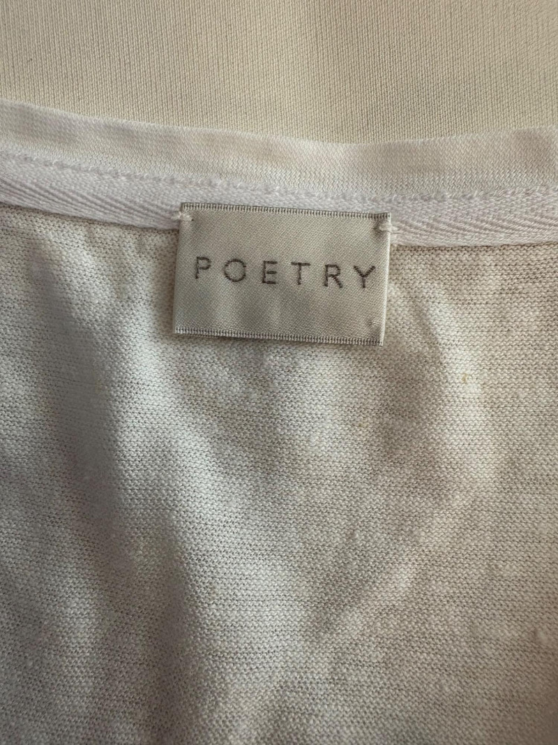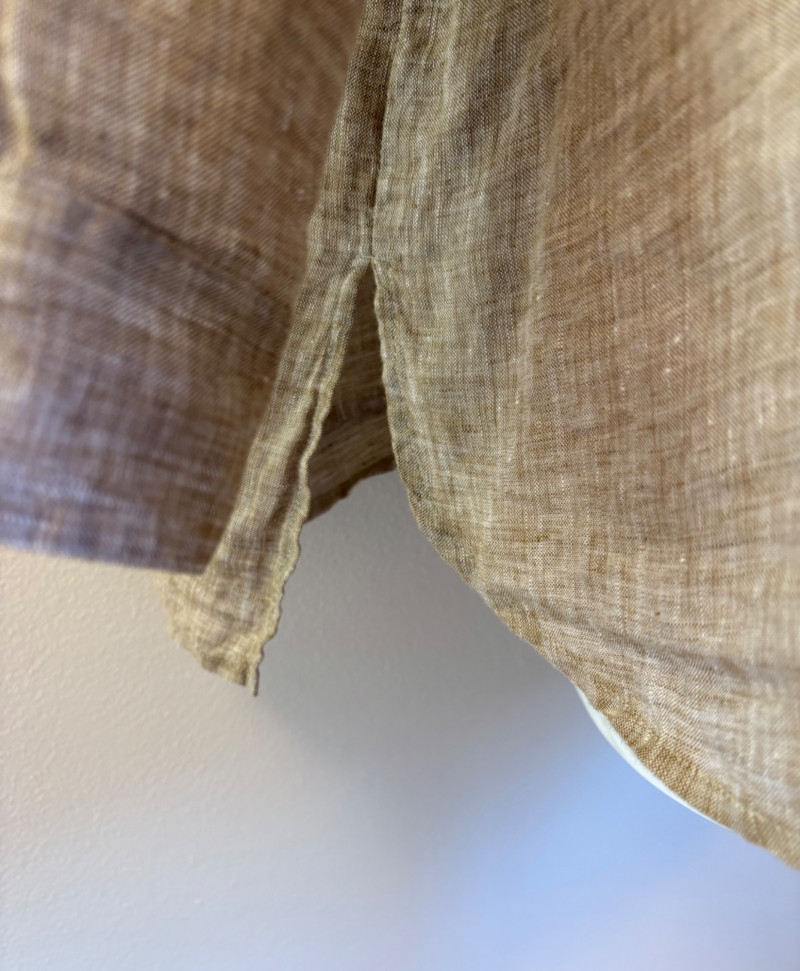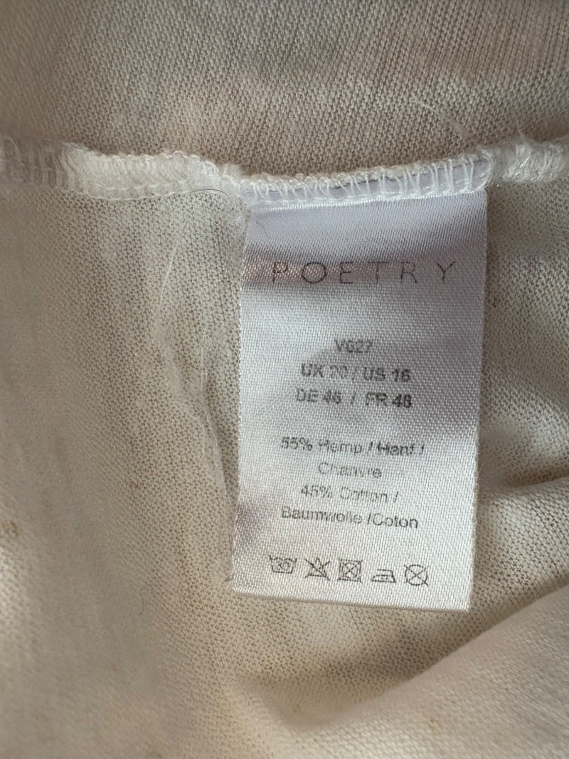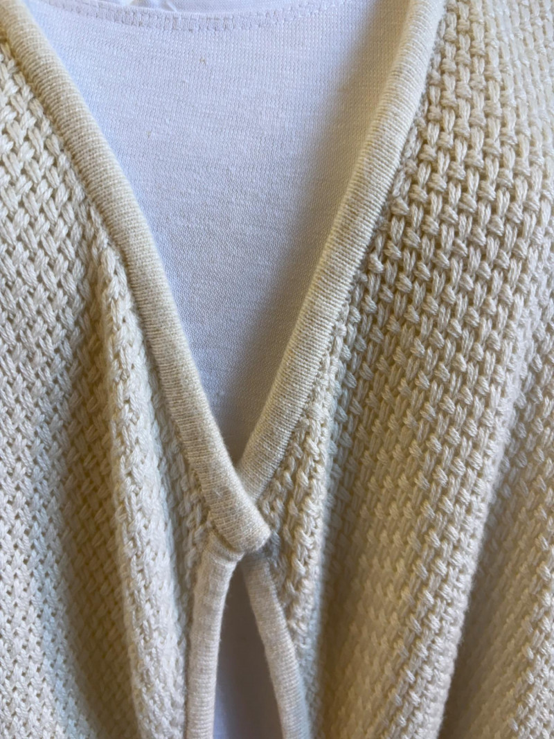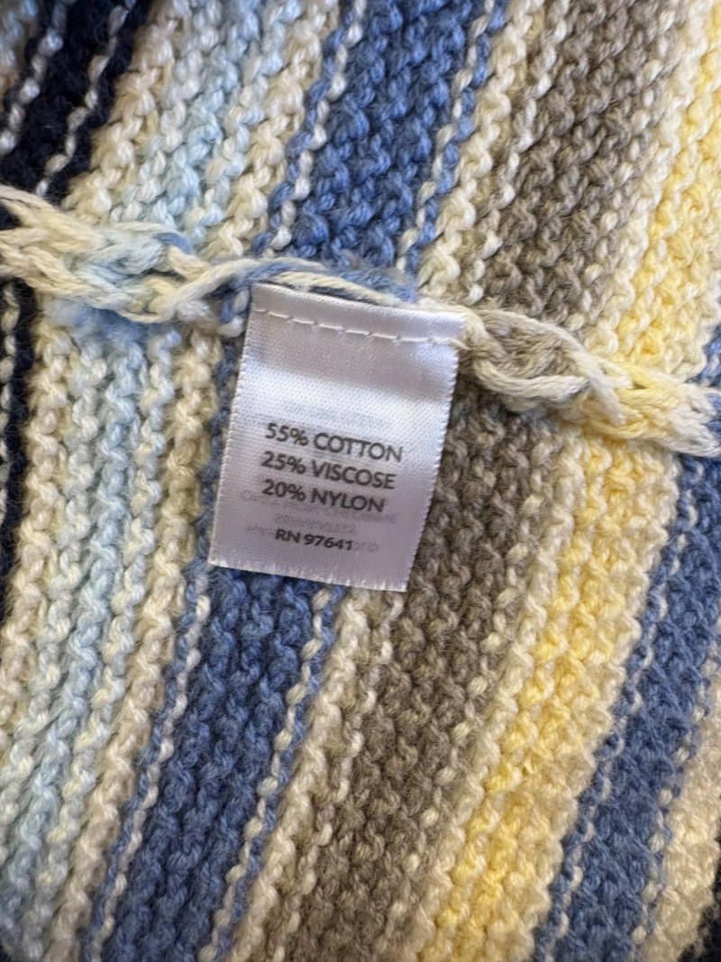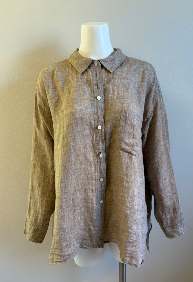 Two versatile pieces from J Jill. Pale brown shirt from J. Jill has front button closure with decorative split placket, single button cuff closures, left breast pocket, and back yoke along with split shirt hem with curves. 100% linen. In excellent condition. Measures 26" pit to pit and 28.5" from back neckline to bottom of back hem. Size tag says 2X. Open front multi-color woolen cardigan from J. Jill. with soft styling and smooth hand. Horizontal blue, beige, and yellow stripes at the waistline and cuffs. No front closure and beautiful open weave with ribbing along neckline, hem, and cuffs. 55% cotton with 25% viscose and 20% nylon. Measures 22" pit to pit and 26" from back neckline to back bottom hemline. Size tag says L. BONUS: White tank from Poetry in 55% hemp with 45% cotton. 2 pin-size small stains and tiny hole at neck; may be able to be laundered out/repaired. Measures 22.5" pit to pit and 27" from back of neck to bottom of hem. Size tag says 16.