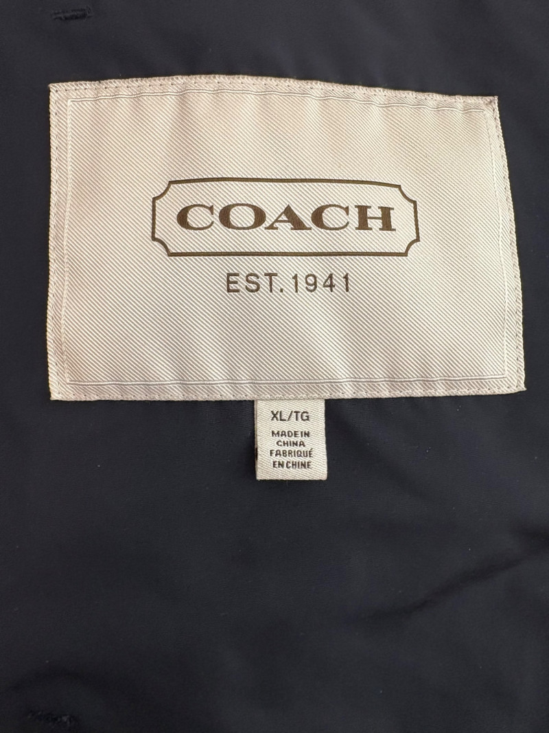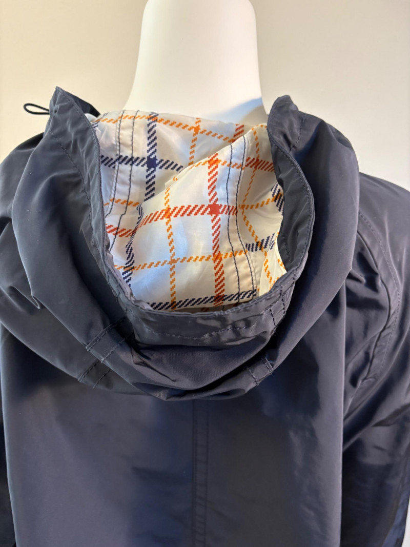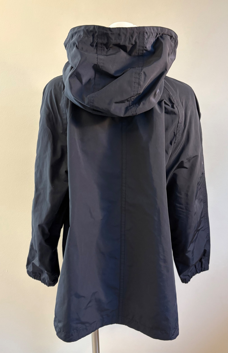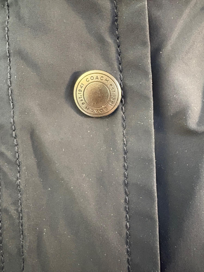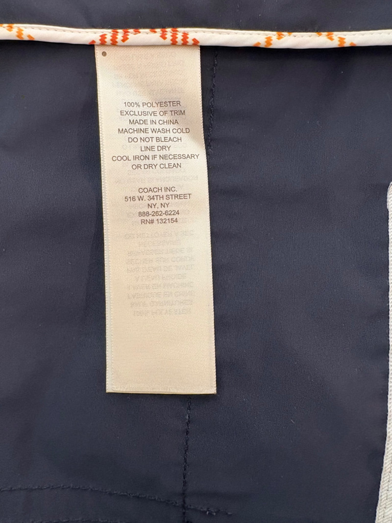 Lovely raincoat from Coach with lots of detailing. Coat has snap front closure, breast pockets with flaps, side-entry front patch pockets, drawstrings at the hemline on either side of the front placket, raglan sleeves, elasticated cuffs, hood with plaid lining, drawstring around the hood edge, and lots of top stitching. In good condition with a small amount of wear. 100% polyester. Measures 24" to pit and 30" from center back neck seam to back hemline. Size tag says XL. Please note that we believe there may have been a lining to this coat at one time as there is a zipper along the inside of the front placket - does not inhibit wear as a rain shell.