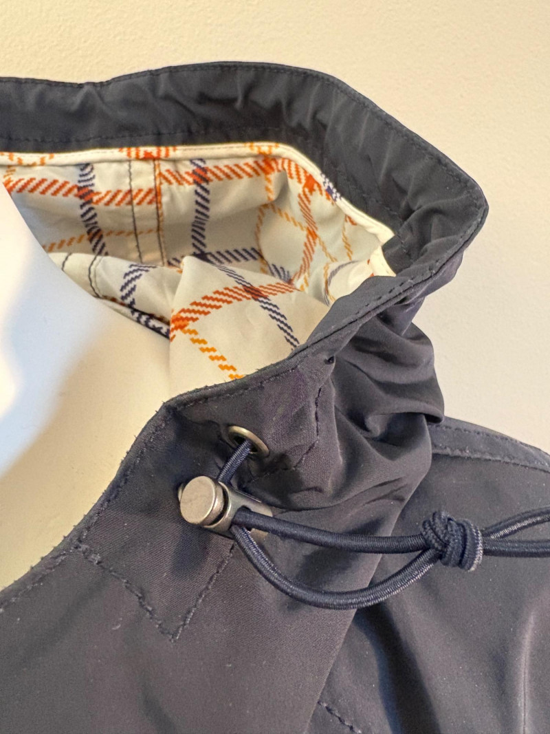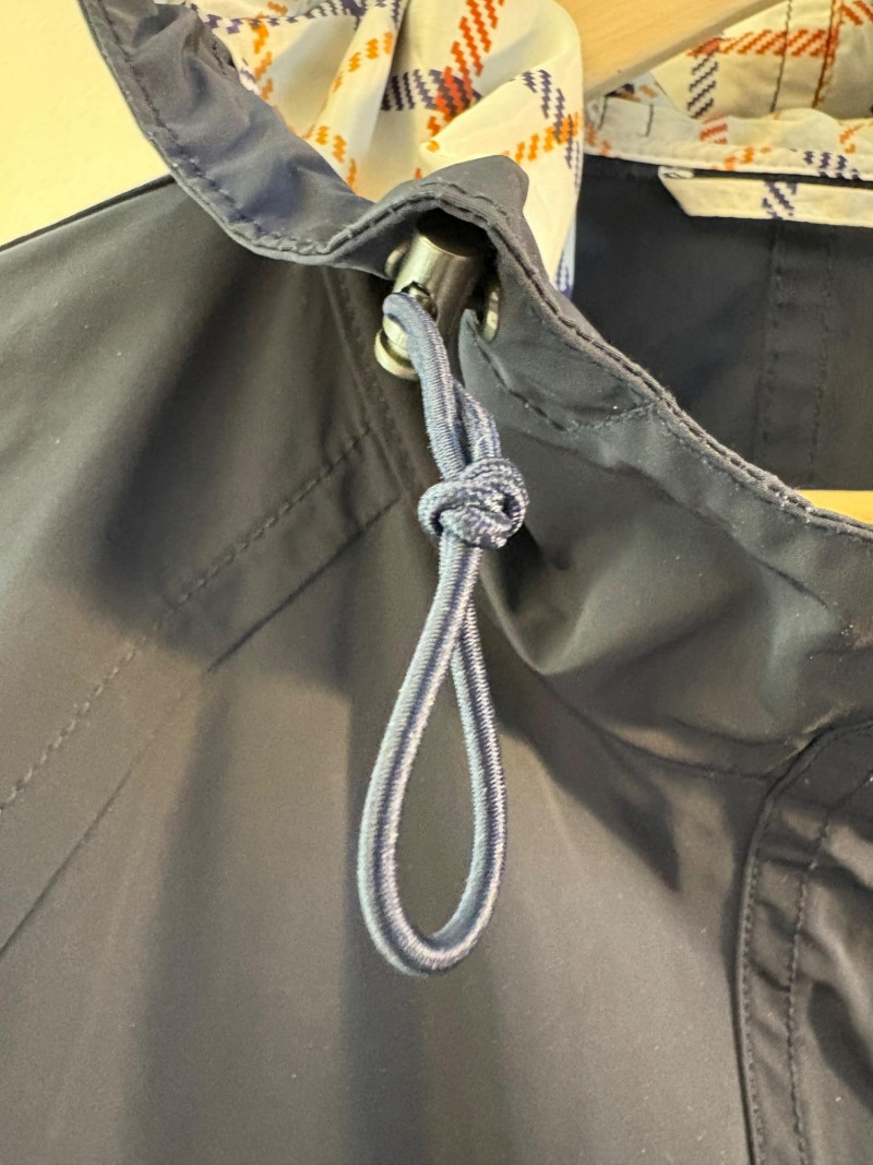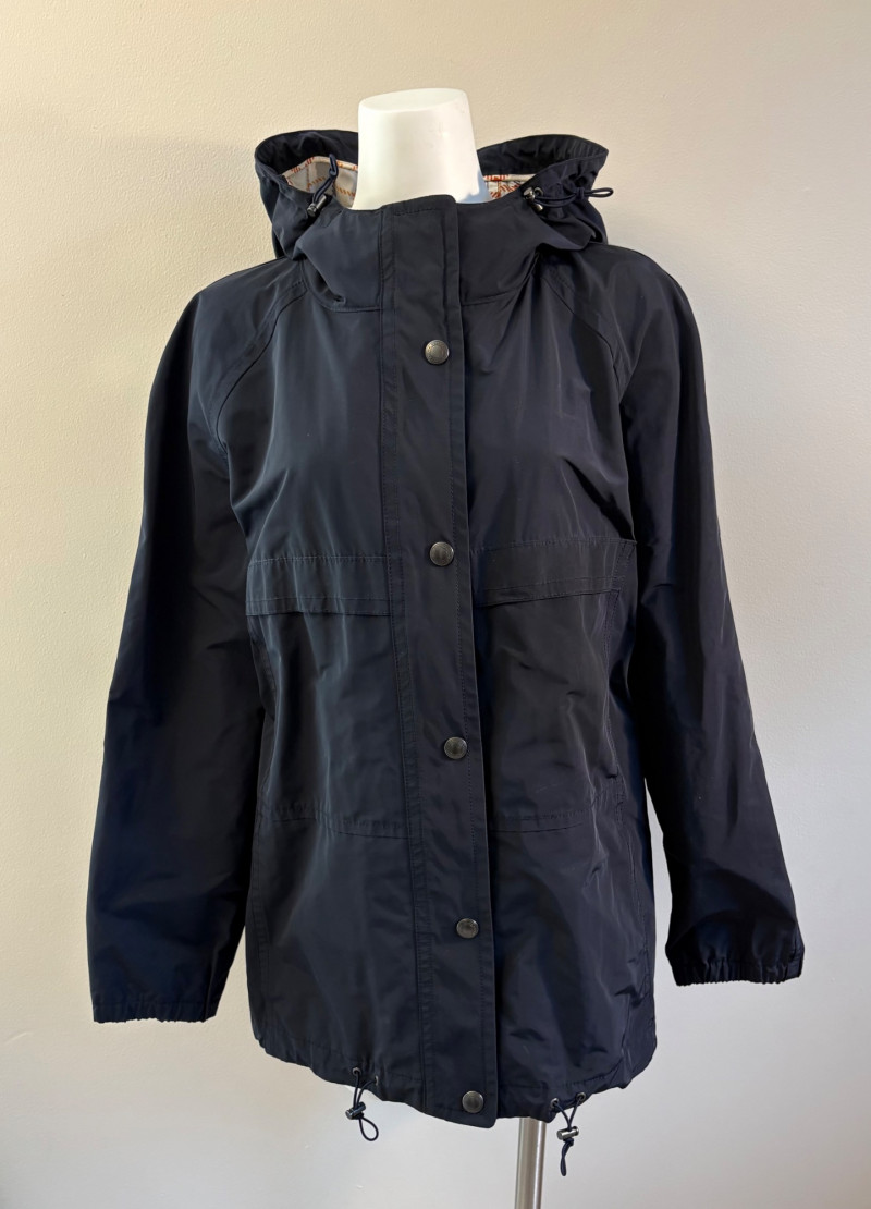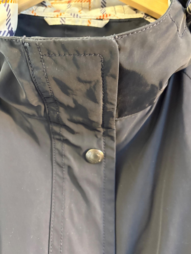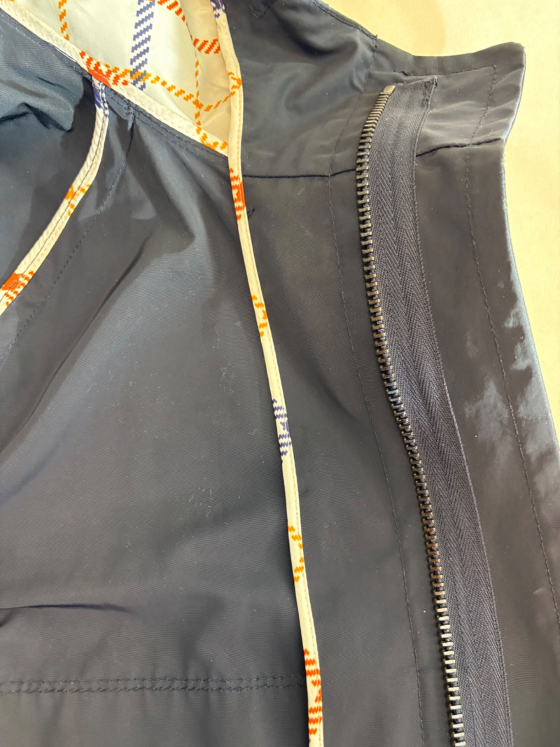 Lovely raincoat from Coach with lots of detailing. Coat has snap front closure, breast pockets with flaps, side-entry front patch pockets, drawstrings at the hemline on either side of the front placket, raglan sleeves, elasticated cuffs, hood with plaid lining, drawstring around the hood edge, and lots of top stitching. In good condition with a small amount of wear. 100% polyester. Measures 24" to pit and 30" from center back neck seam to back hemline. Size tag says XL. Please note that we believe there may have been a lining to this coat at one time as there is a zipper along the inside of the front placket - does not inhibit wear as a rain shell.