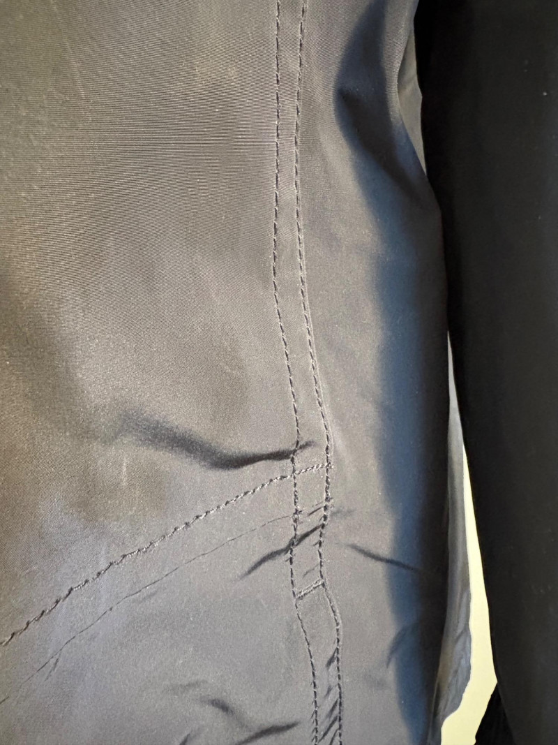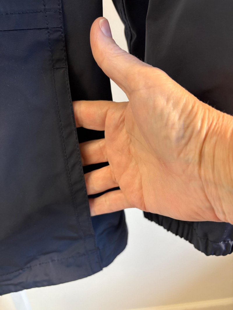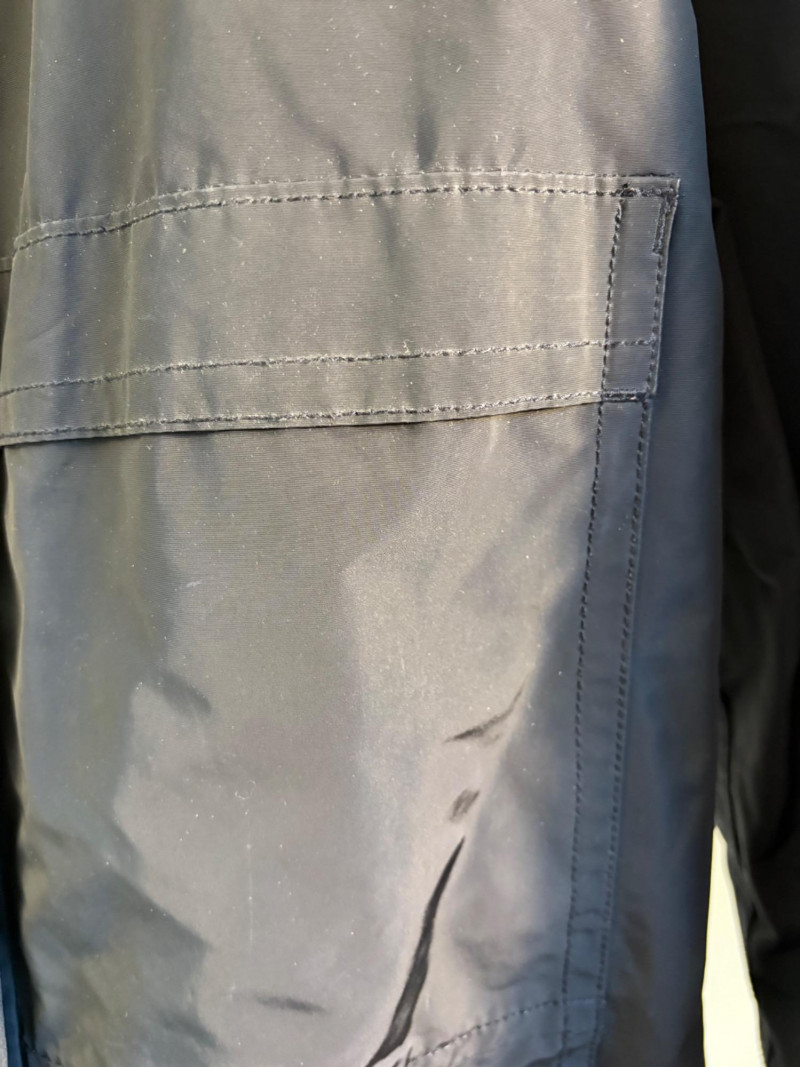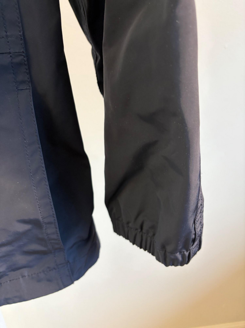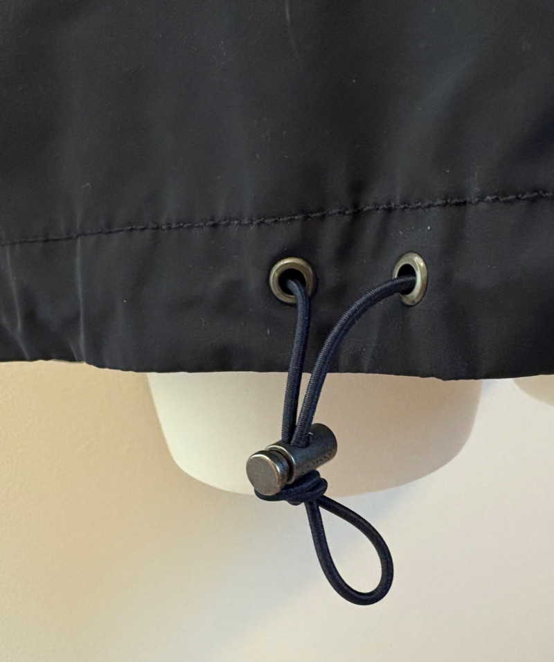 Lovely raincoat from Coach with lots of detailing. Coat has snap front closure, breast pockets with flaps, side-entry front patch pockets, drawstrings at the hemline on either side of the front placket, raglan sleeves, elasticated cuffs, hood with plaid lining, drawstring around the hood edge, and lots of top stitching. In good condition with a small amount of wear. 100% polyester. Measures 24" to pit and 30" from center back neck seam to back hemline. Size tag says XL. Please note that we believe there may have been a lining to this coat at one time as there is a zipper along the inside of the front placket - does not inhibit wear as a rain shell.