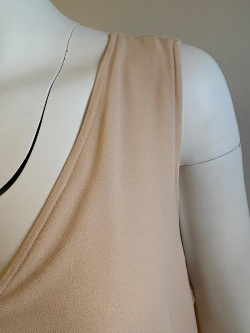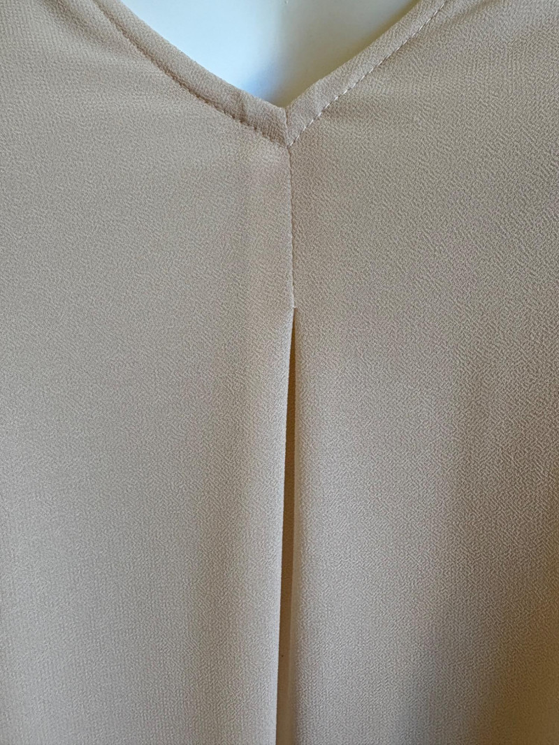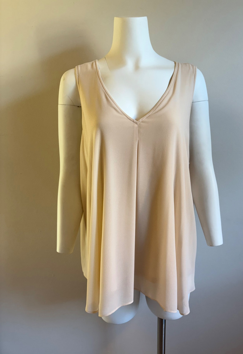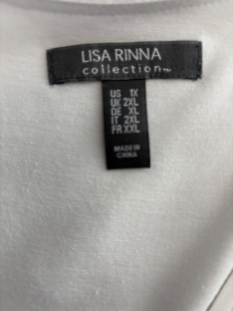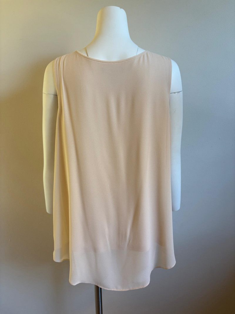 Two nice separates that also work well together from Eileen Fisher & Lisa Rinna, Classic black shirt from Eileen Fisher has button front closure, pleated single button closure cuffs, back yoke with center pleat, and split hem with back hem approx. 3" longer than the front. In excellent condition. 100% cotton. Measures 24.5" pit to pit and 32" from back neckline seam to bottom of back hem. Size tag says XL. Pale pink V-neck tank shell from Lisa Rinna is stretchy soft with attached inner camisole. Front pleat at base of "V" with shell slightly longer than the inner camisole. In excellent condition. Outer layer is 100% polyester while inner layer is 95% viscose and 5% spandex - feels like soft lingerie! Measures 24.5" pit to pit and 27.5" from back neckline to back center hem. Size tag says 1X.