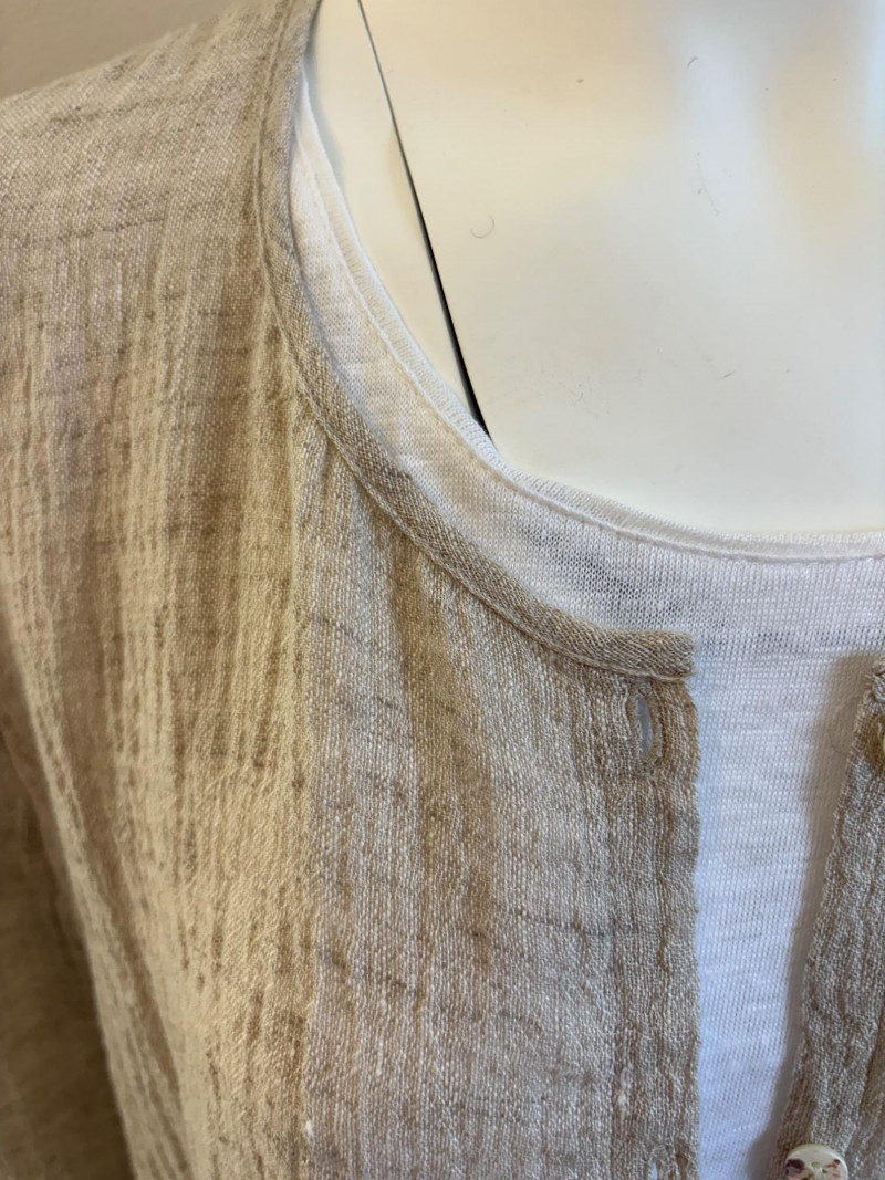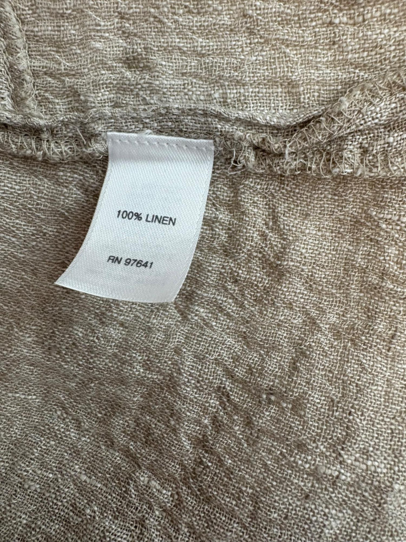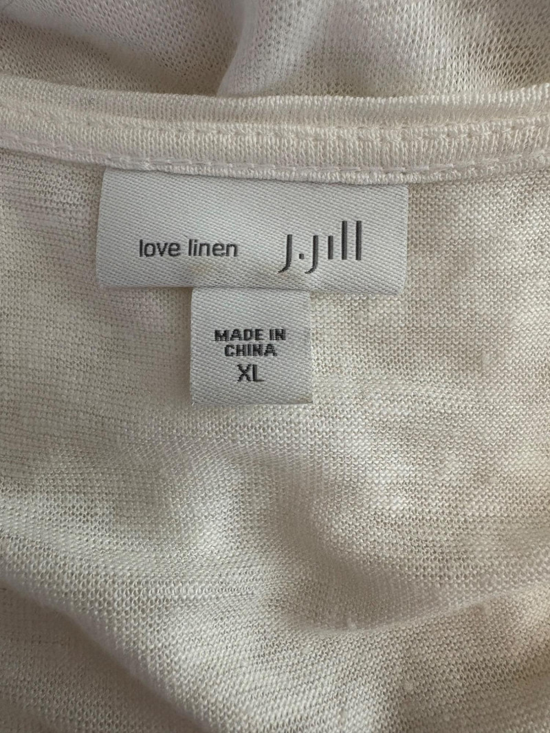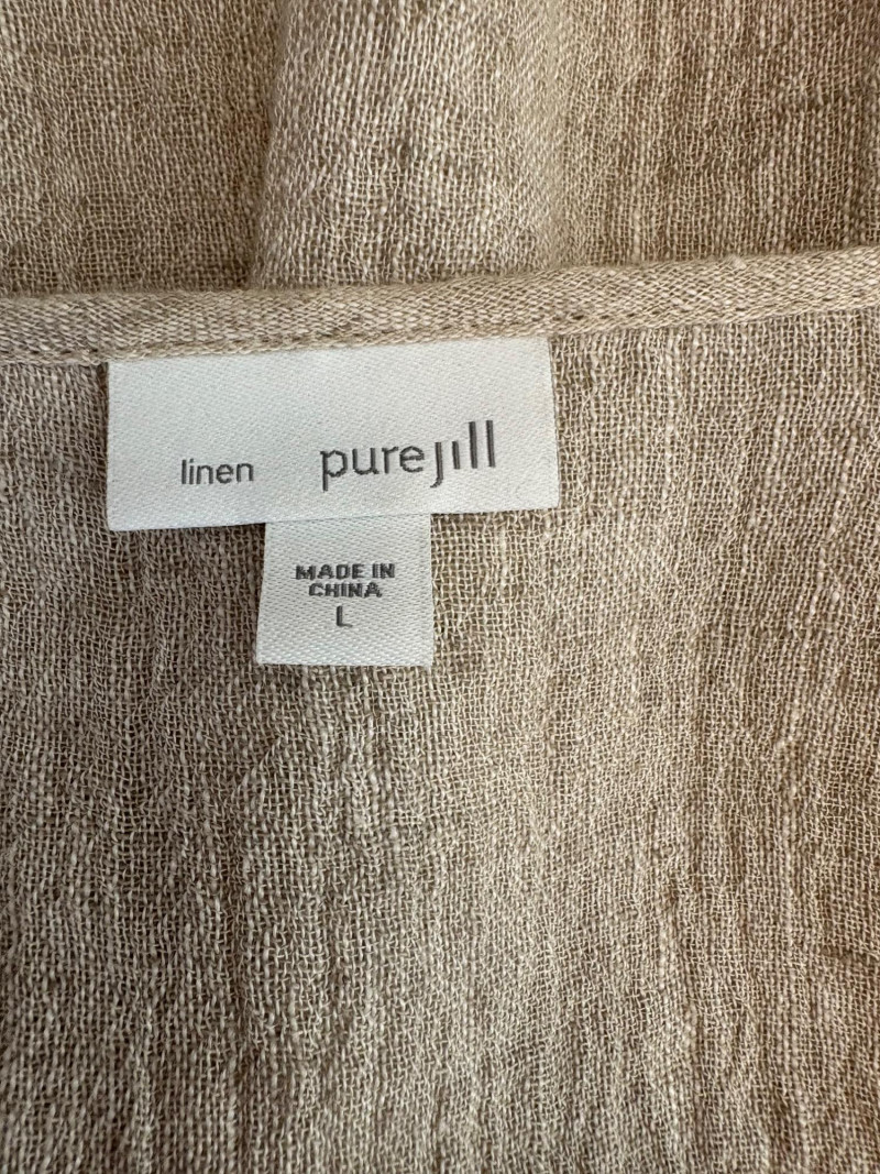 Great lightweight linen duo from J. Jill. Beige lightweight jacket with round neckline, button front closure, split hem, and in-seam horizontal front pockets. in excellent condition. 100% linen. Measures 23" pit to pit and 26" from back neckline to bottom back hem. Size tag says L. Sleeveless modified tank has split hem and is very sheer. 100% linen. In excellent shape. Measures 22" pit to pit. Size tags says L.