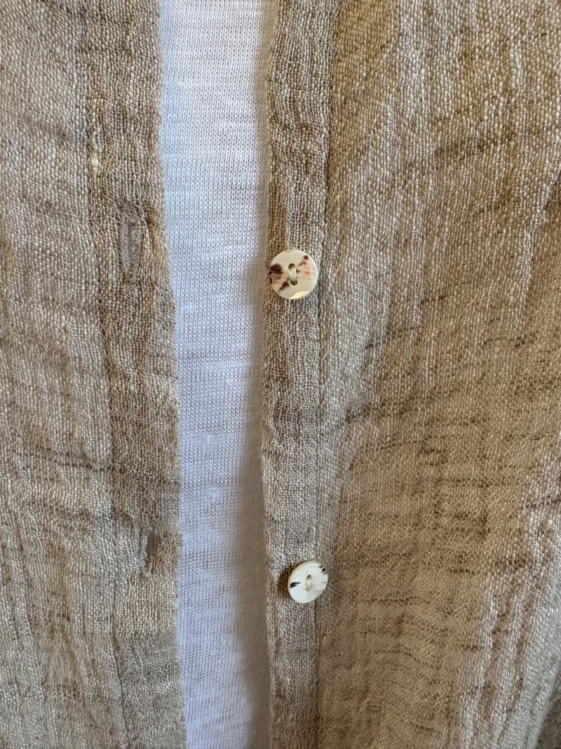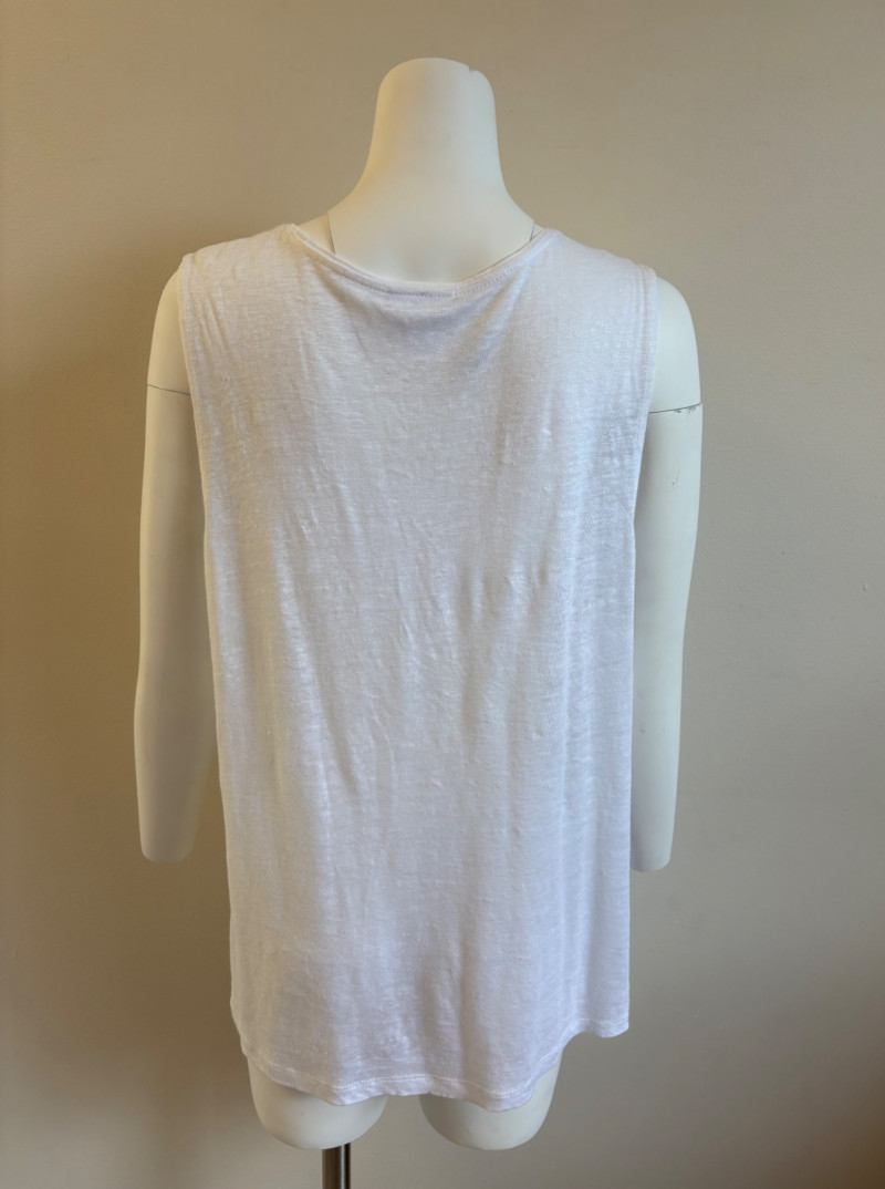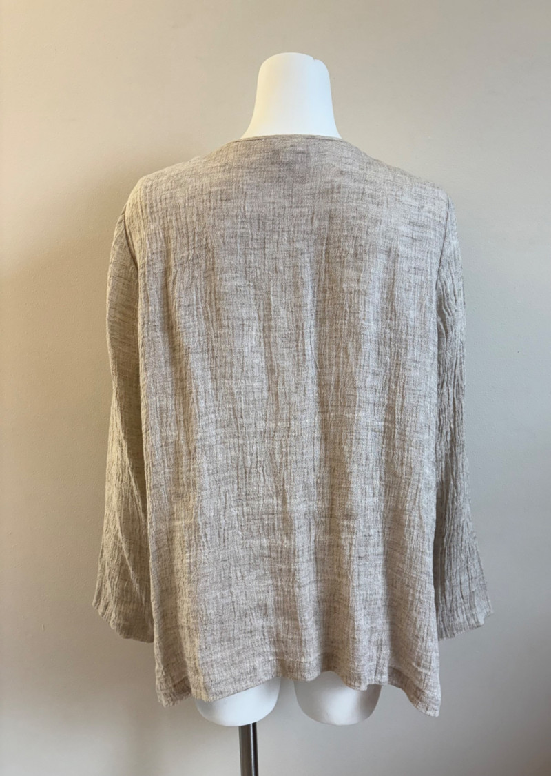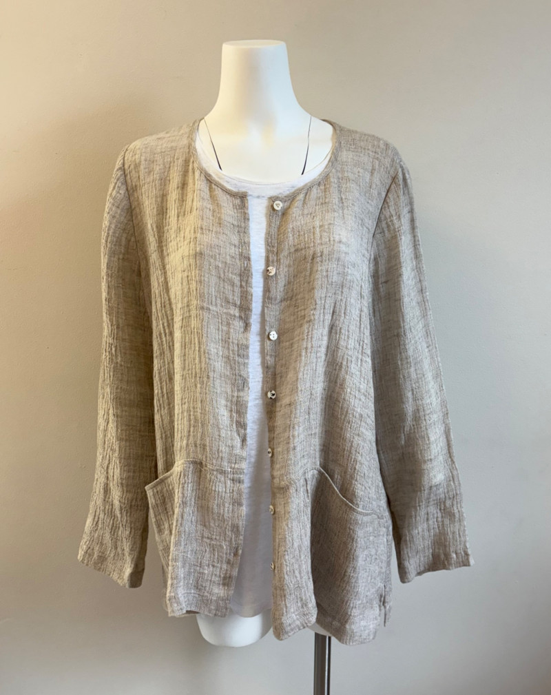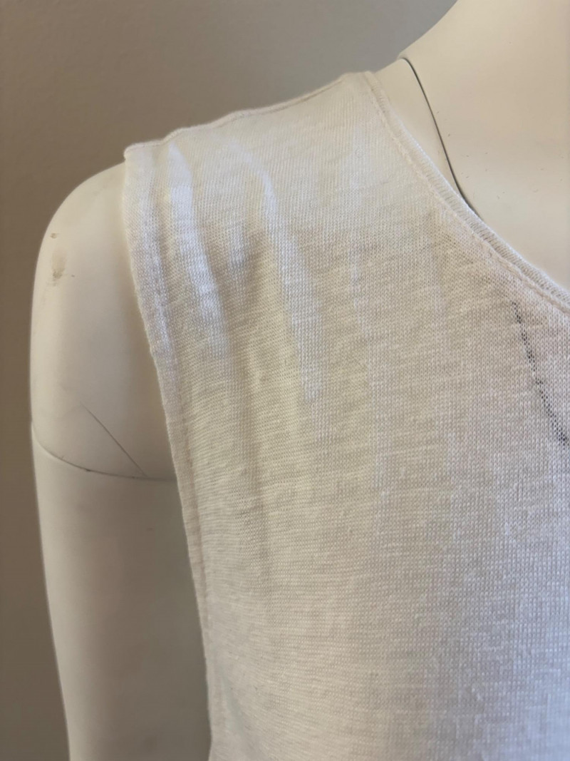 Great lightweight linen duo from J. Jill. Beige lightweight jacket with round neckline, button front closure, split hem, and in-seam horizontal front pockets. in excellent condition. 100% linen. Measures 23" pit to pit and 26" from back neckline to bottom back hem. Size tag says L. Sleeveless modified tank has split hem and is very sheer. 100% linen. In excellent shape. Measures 22" pit to pit. Size tags says L.