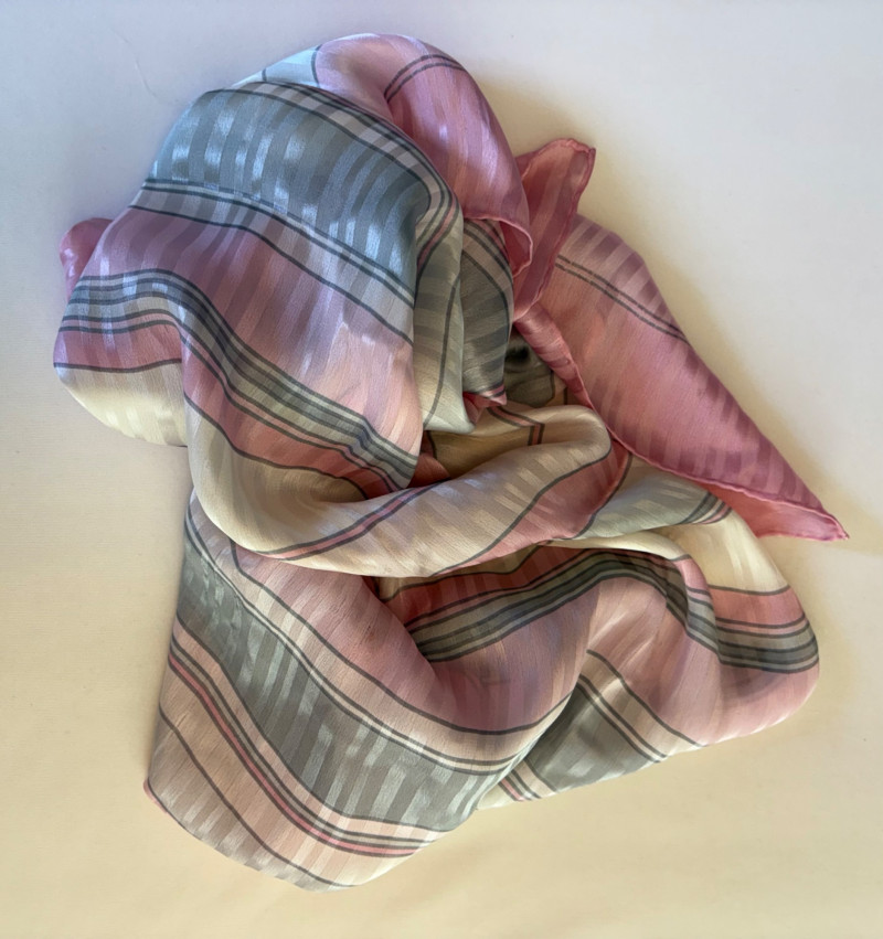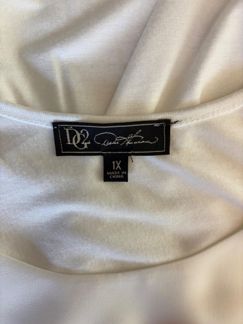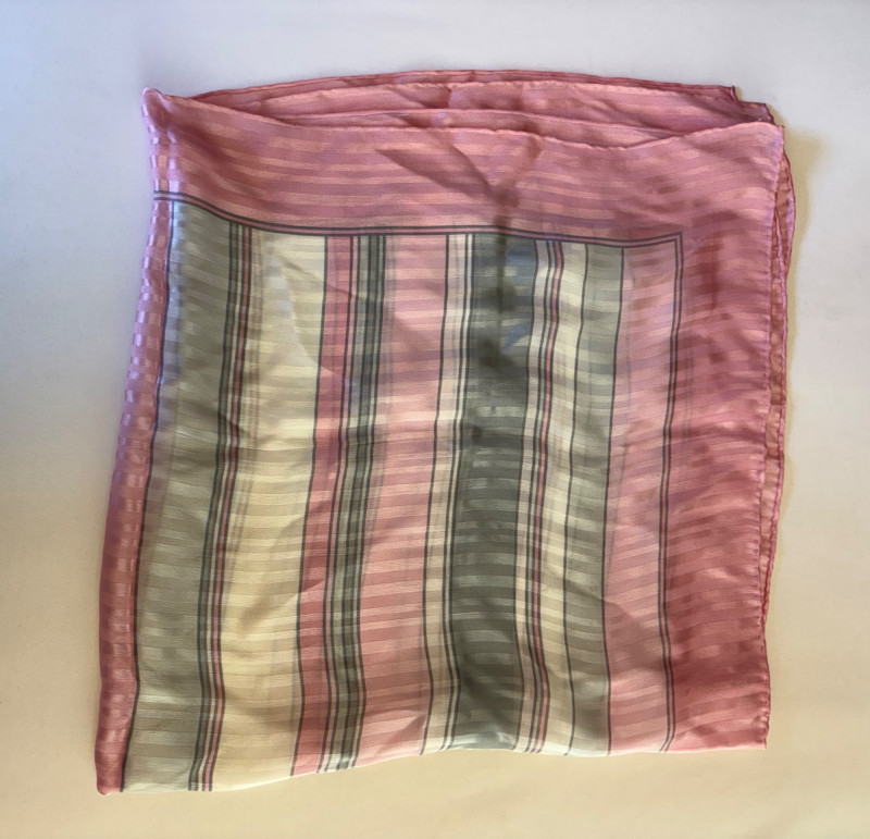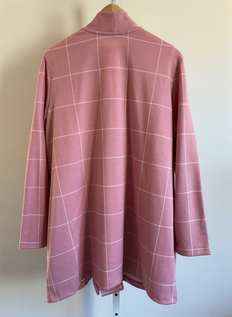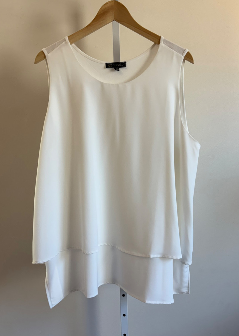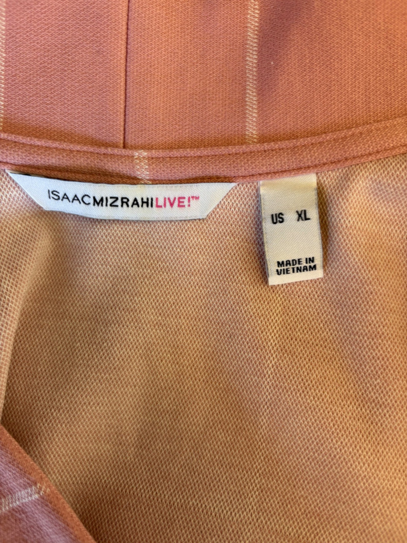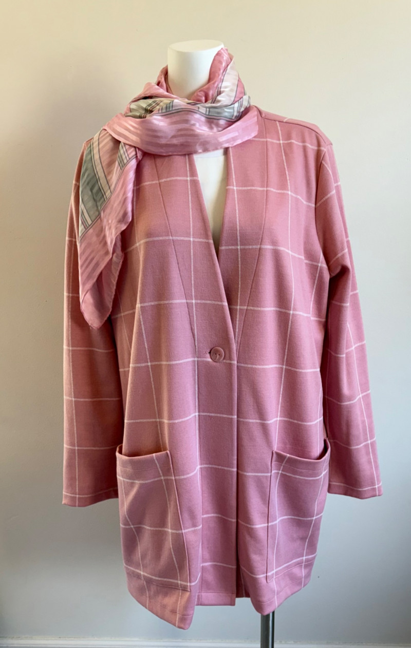 Pink & white plaid collarless jacket in heavy knit from Isaac Mizrahi. Front patch pockets with single button closure. Soft to the touch and heavy enough to hold its shape. In good condition. 74% polyester with 23% cotton and 3% spandex. Measures 25.5" pit to pit and 31" from center back neck seam to back hemline. Size tag says XL. White shell from Diane Gilman. Sleeveless double-front panel to prevent see-through with stepped hem. Back section is stretch for more accommodating fit. Front is 100% polyester, back is polyester spandex blend. In excellent condition. Measures 24" to pit and 25.5" from center back neckline to bottom of back hemline. Size tag 1X. Scarf in pink, gray, and white matches the outfit beautifully and adds a bit of panache. No maker or fabric tag. Scarf measures approximately 32“ x 32“ and is in good used condition with one noticeable discoloration that may launder out - see last photo.