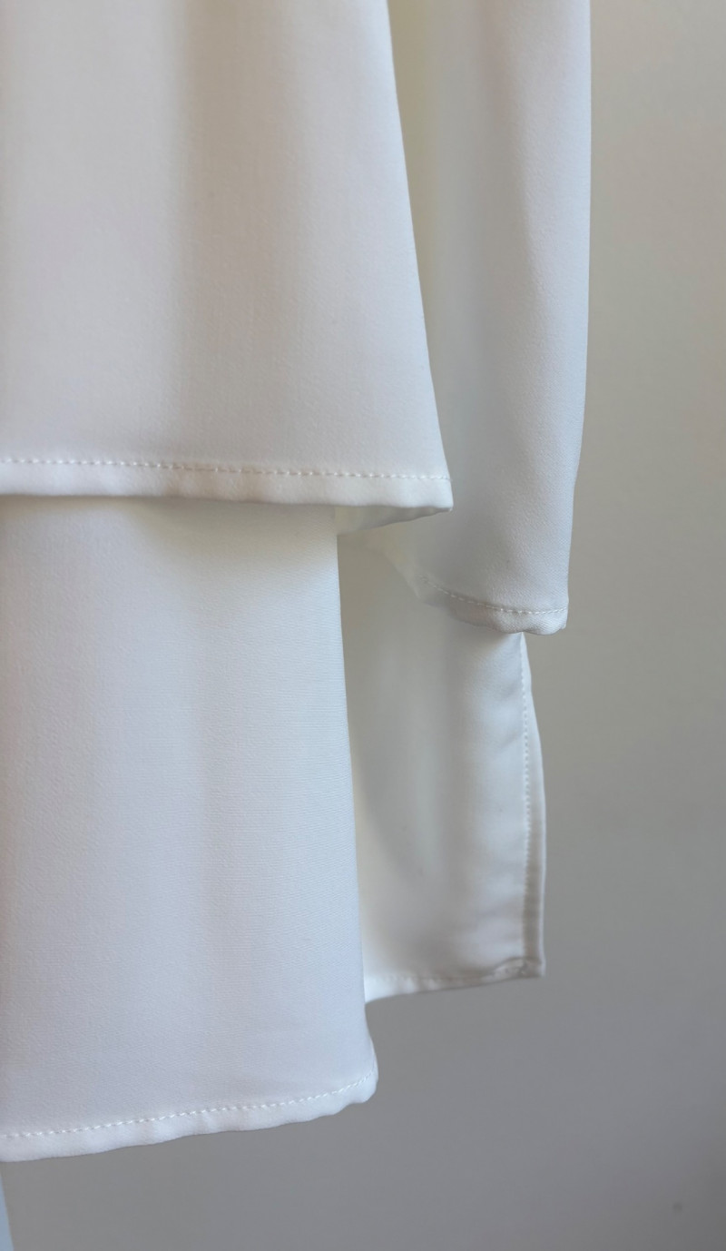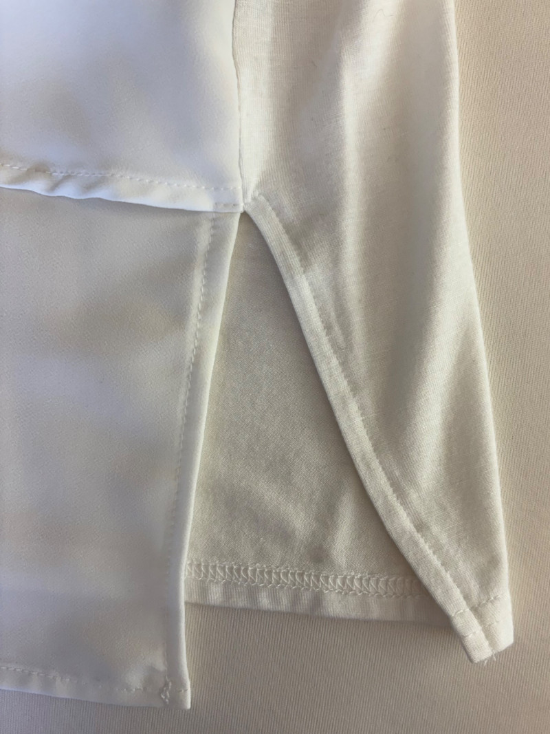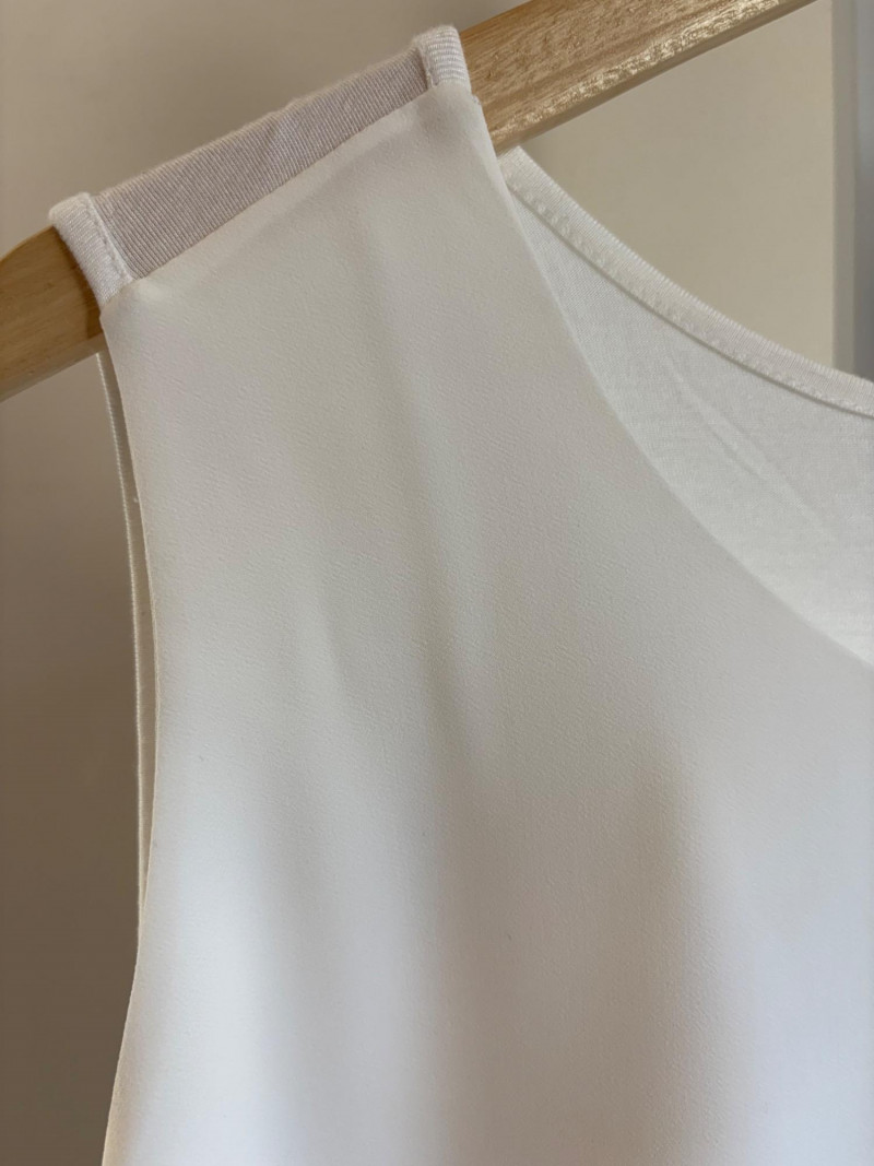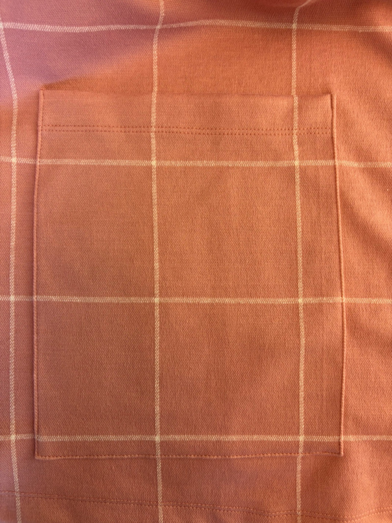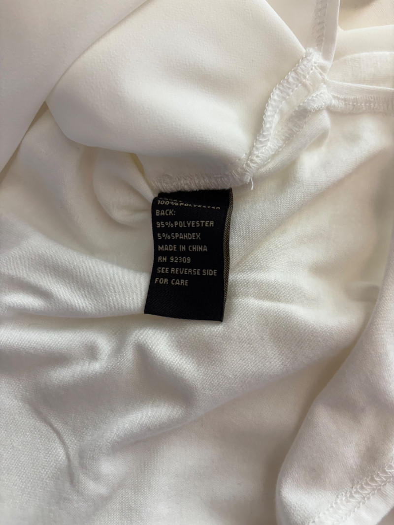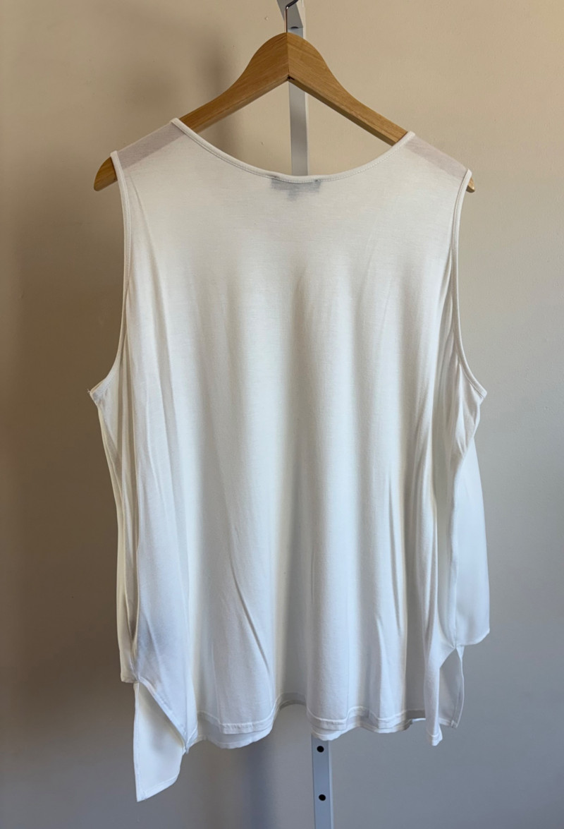 Pink & white plaid collarless jacket in heavy knit from Isaac Mizrahi. Front patch pockets with single button closure. Soft to the touch and heavy enough to hold its shape. In good condition. 74% polyester with 23% cotton and 3% spandex. Measures 25.5" pit to pit and 31" from center back neck seam to back hemline. Size tag says XL. White shell from Diane Gilman. Sleeveless double-front panel to prevent see-through with stepped hem. Back section is stretch for more accommodating fit. Front is 100% polyester, back is polyester spandex blend. In excellent condition. Measures 24" to pit and 25.5" from center back neckline to bottom of back hemline. Size tag 1X. Scarf in pink, gray, and white matches the outfit beautifully and adds a bit of panache. No maker or fabric tag. Scarf measures approximately 32“ x 32“ and is in good used condition with one noticeable discoloration that may launder out - see last photo.