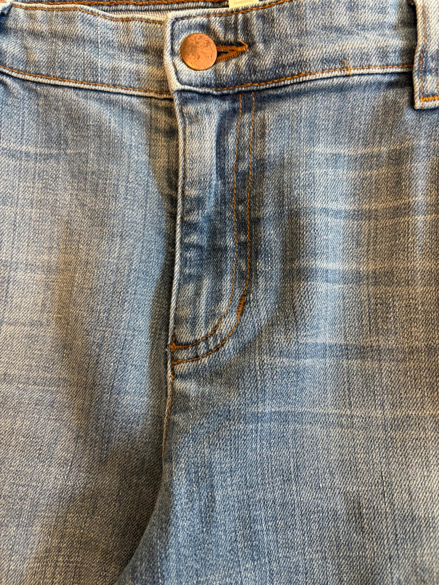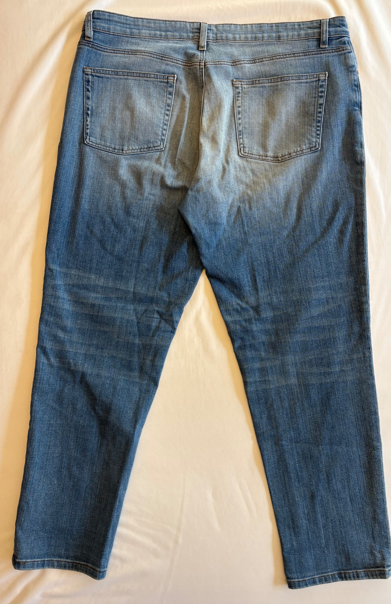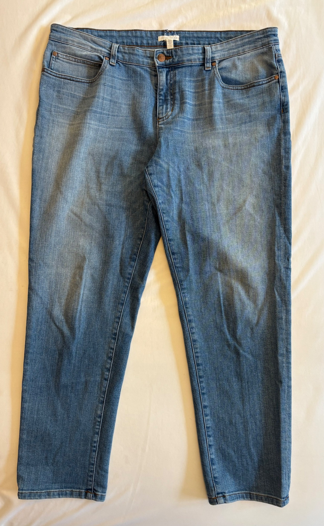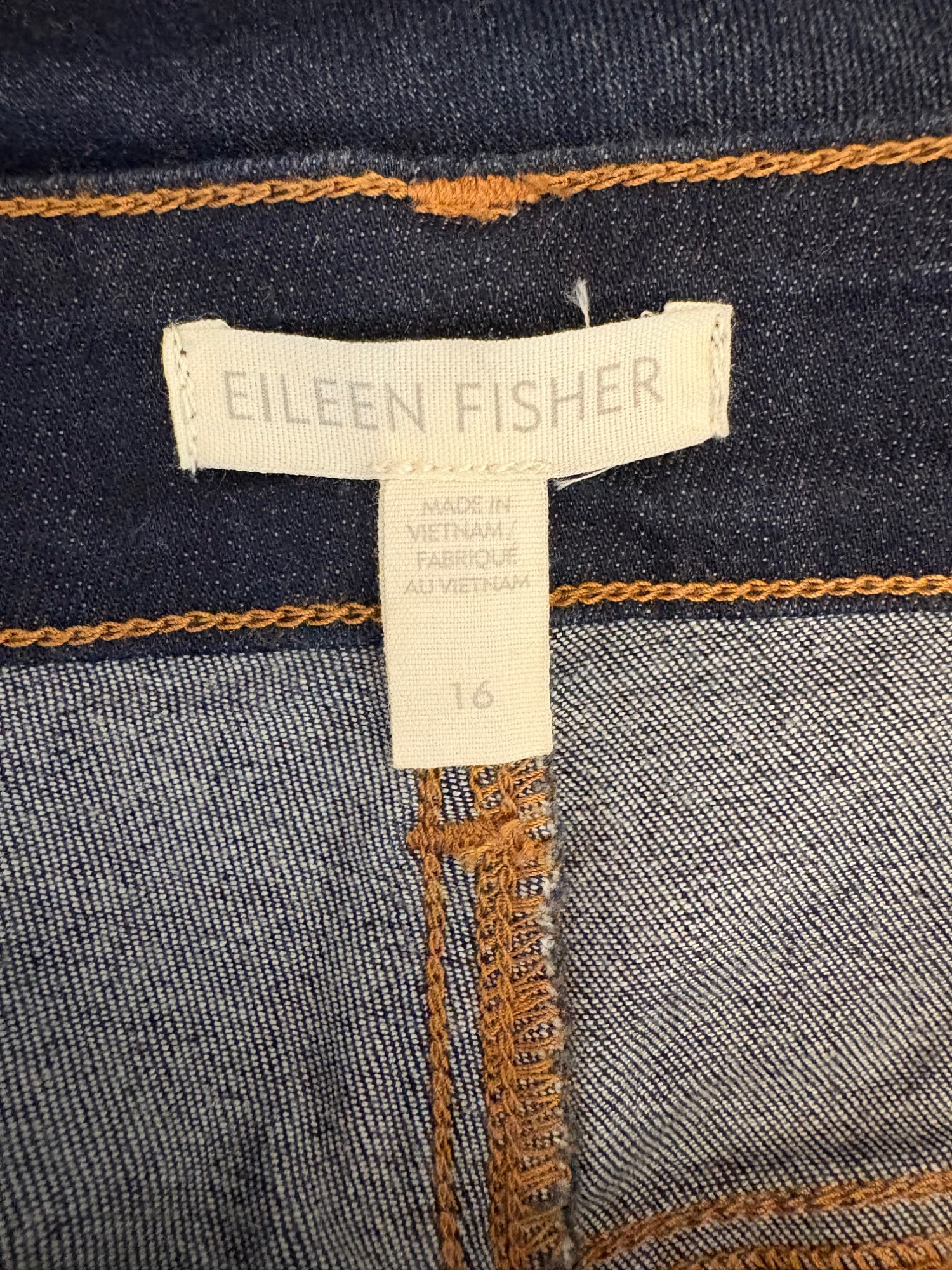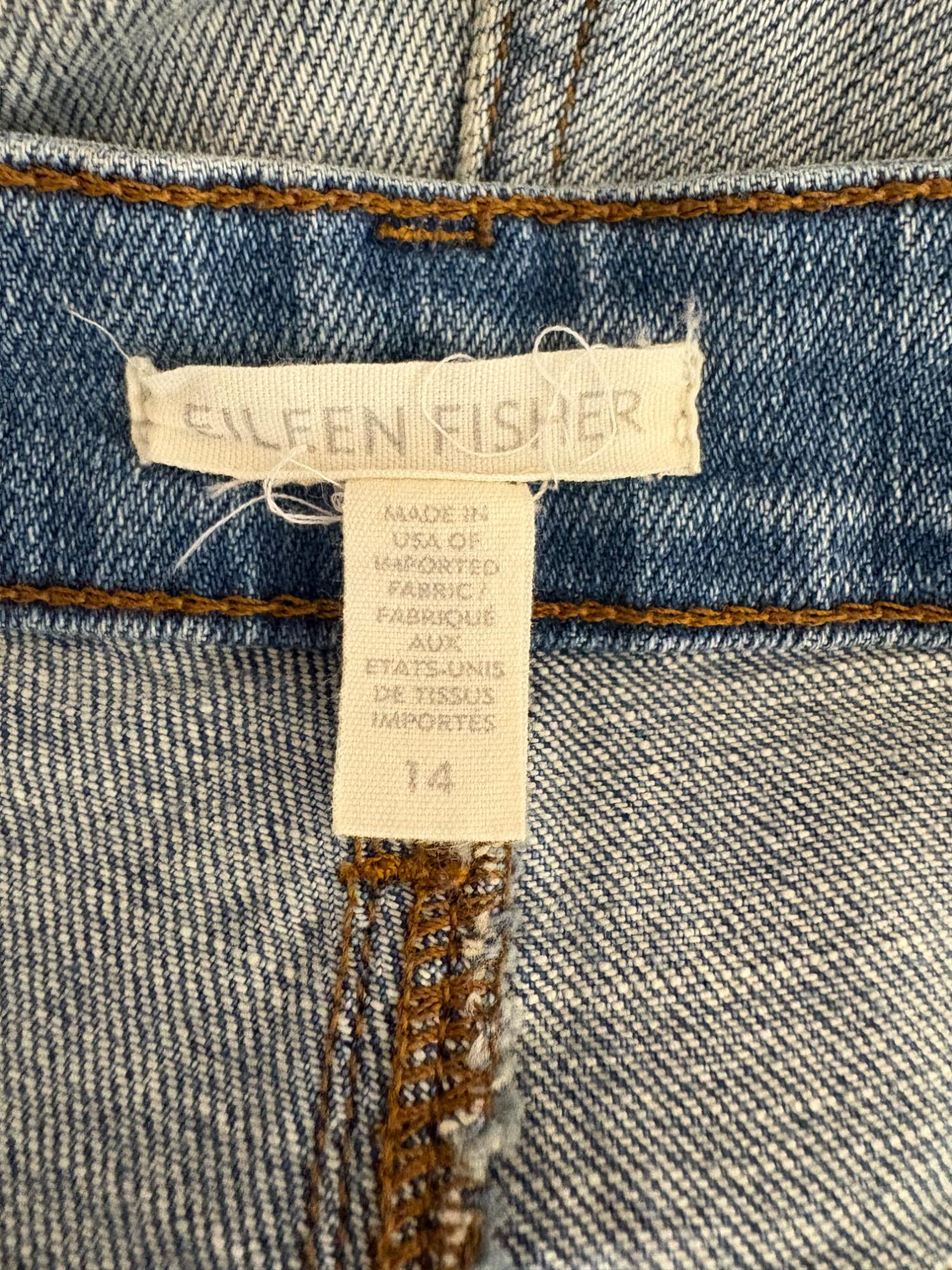 Two pairs of Eileen Fisher blue denim jeans. Darker pair appears to be somewhat cropped with slightly tapered legs, gold top-stitching, zip fly front, and classic 5-pocket design. 84% cotton with 14% polyester and 2 % spandex. In good used condition. Measures 19" side to side at waist with 25" inseam. Size tag says 16. Lighter pair has tapered legs, gold top-stitching, zip fly front, and classic 5-pocket design. 98% cotton with 2% spandex. In good used condition. Measures 20" side to side at waist with 29" inseam. Size tag says 14.