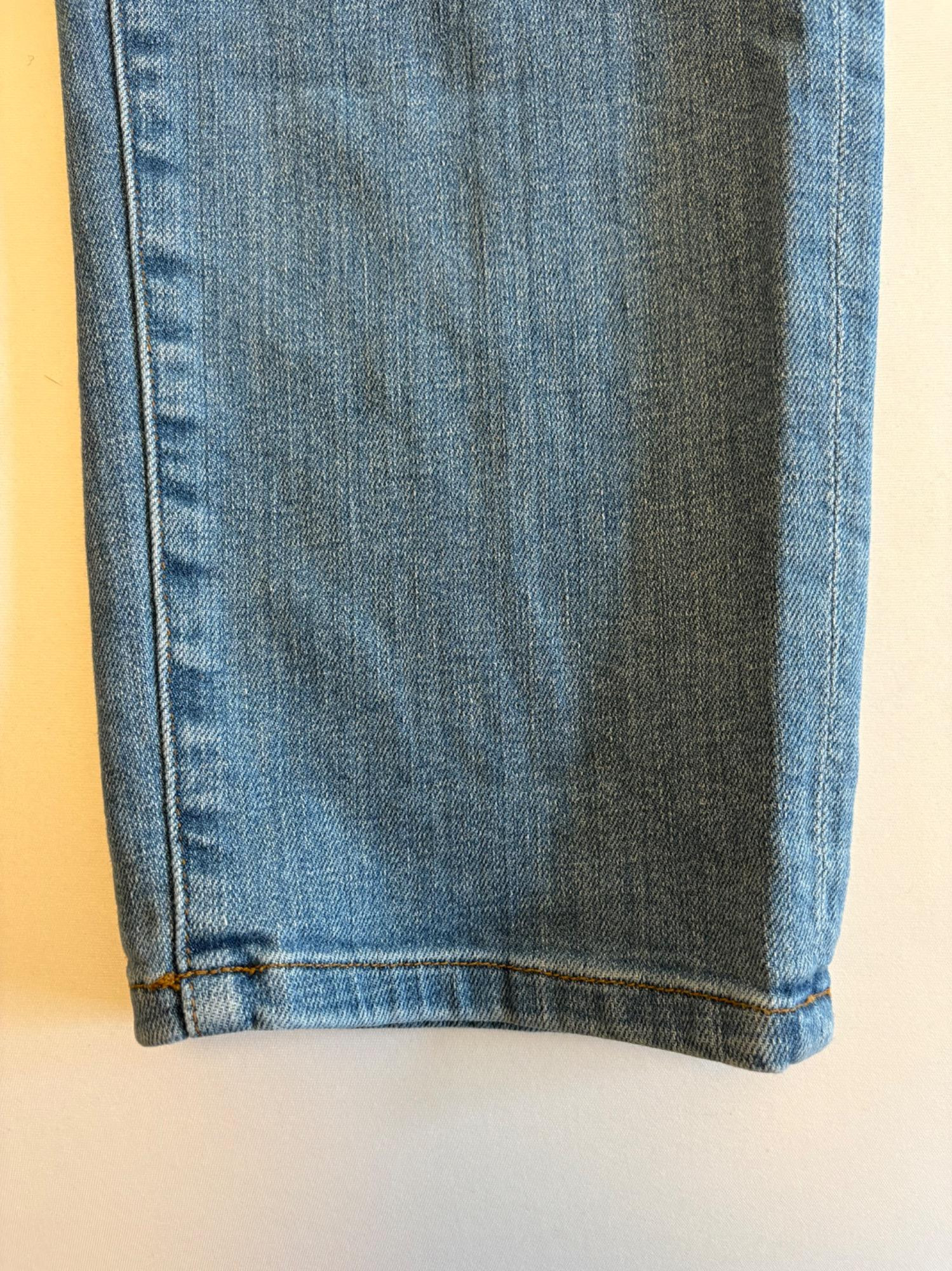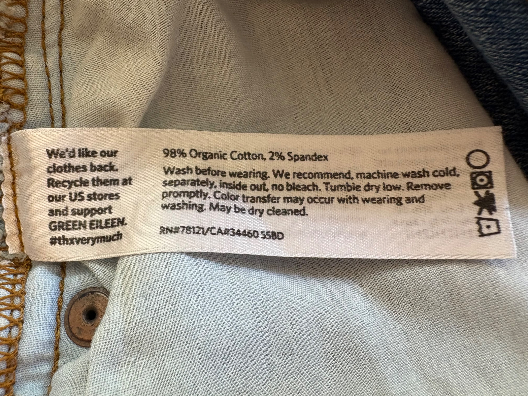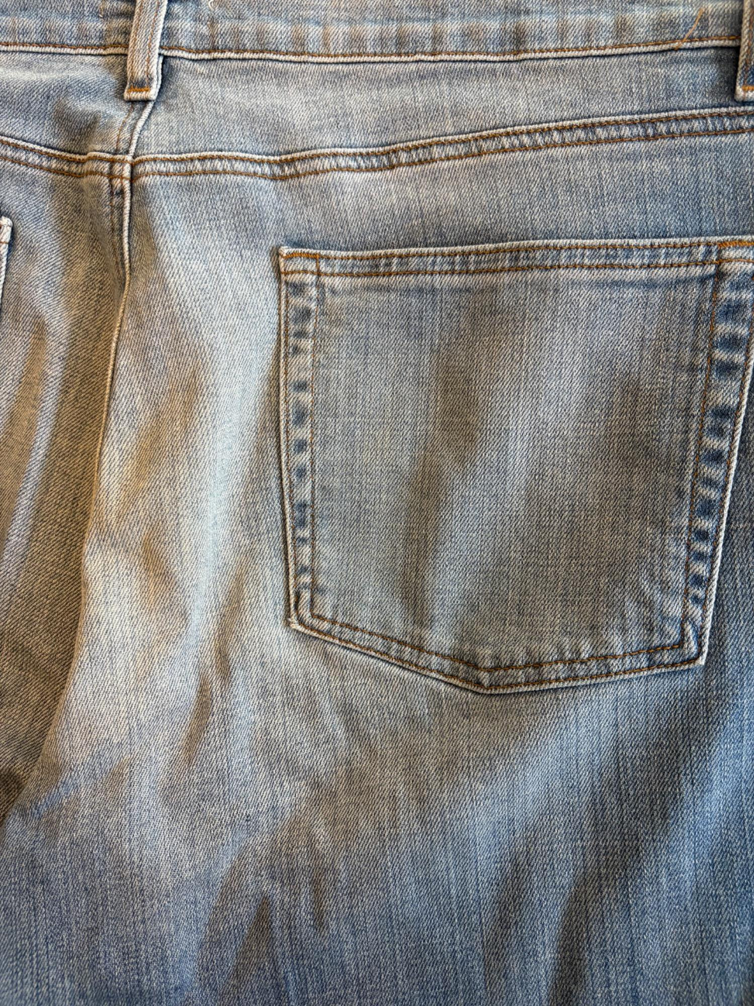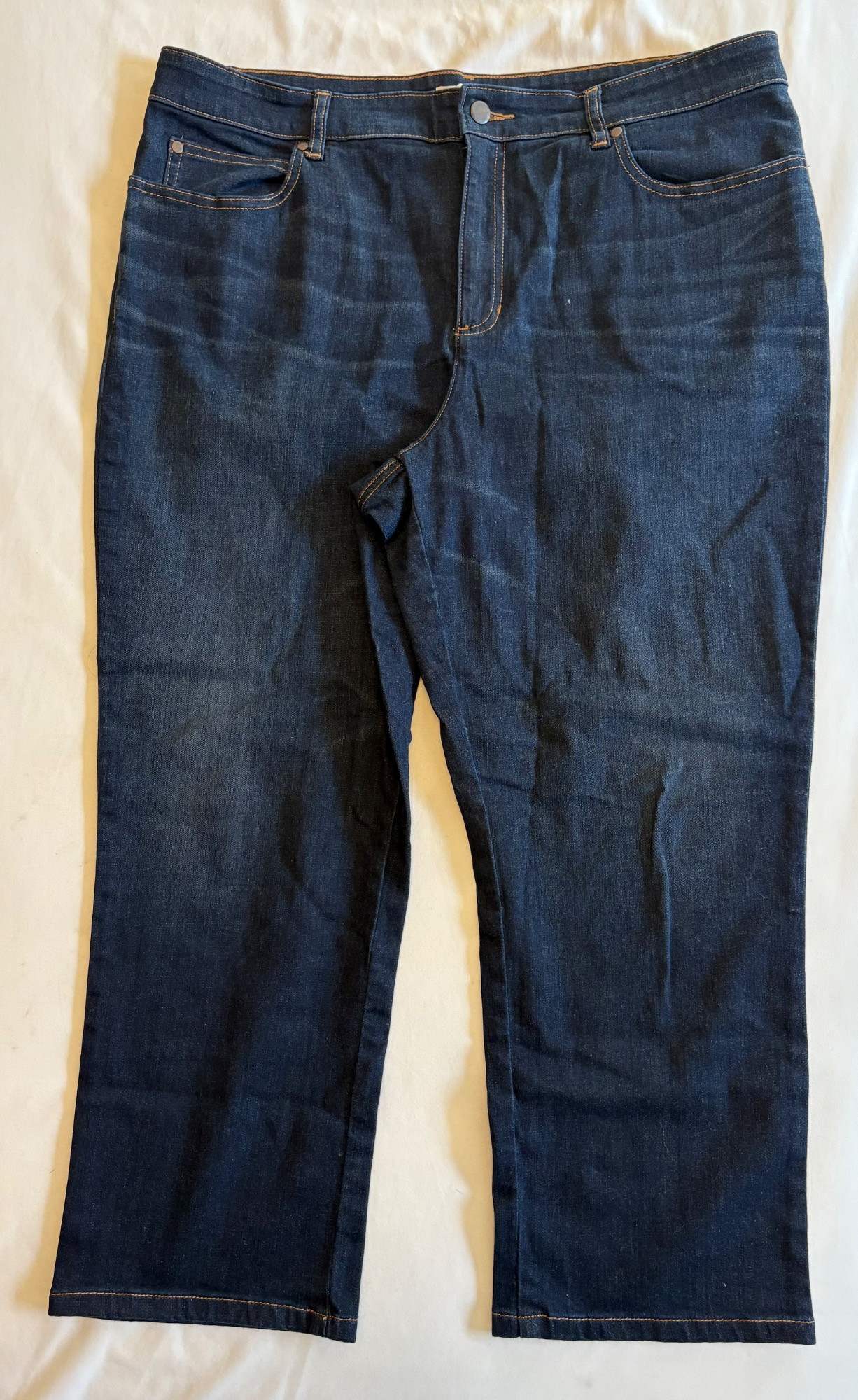 Two pairs of Eileen Fisher blue denim jeans. Darker pair appears to be somewhat cropped with slightly tapered legs, gold top-stitching, zip fly front, and classic 5-pocket design. 84% cotton with 14% polyester and 2 % spandex. In good used condition. Measures 19" side to side at waist with 25" inseam. Size tag says 16. Lighter pair has tapered legs, gold top-stitching, zip fly front, and classic 5-pocket design. 98% cotton with 2% spandex. In good used condition. Measures 20" side to side at waist with 29" inseam. Size tag says 14.