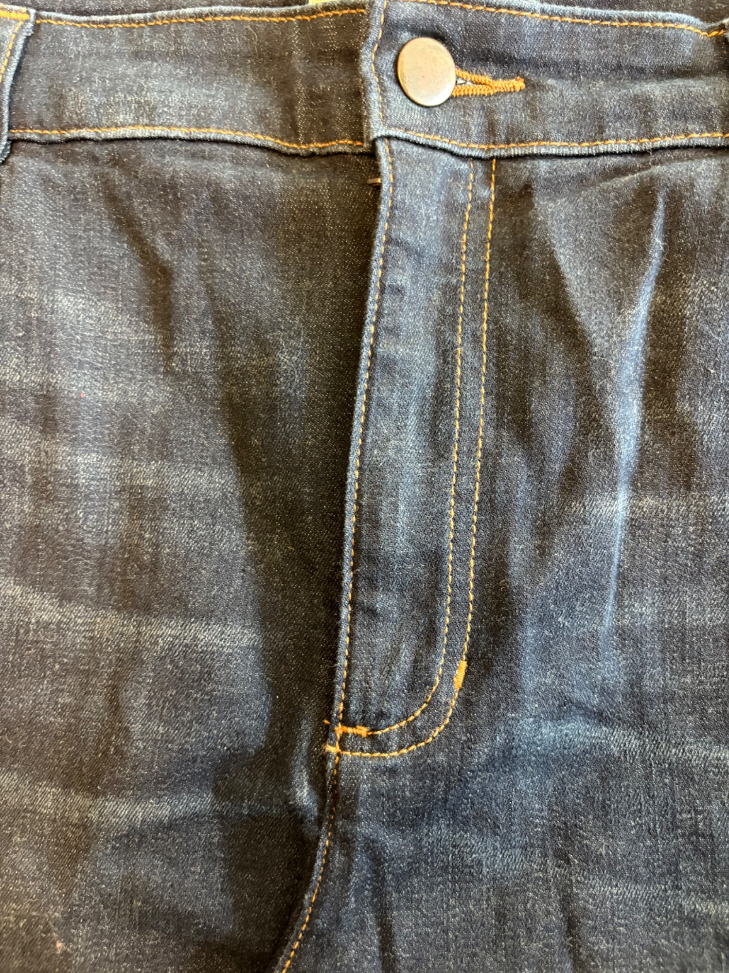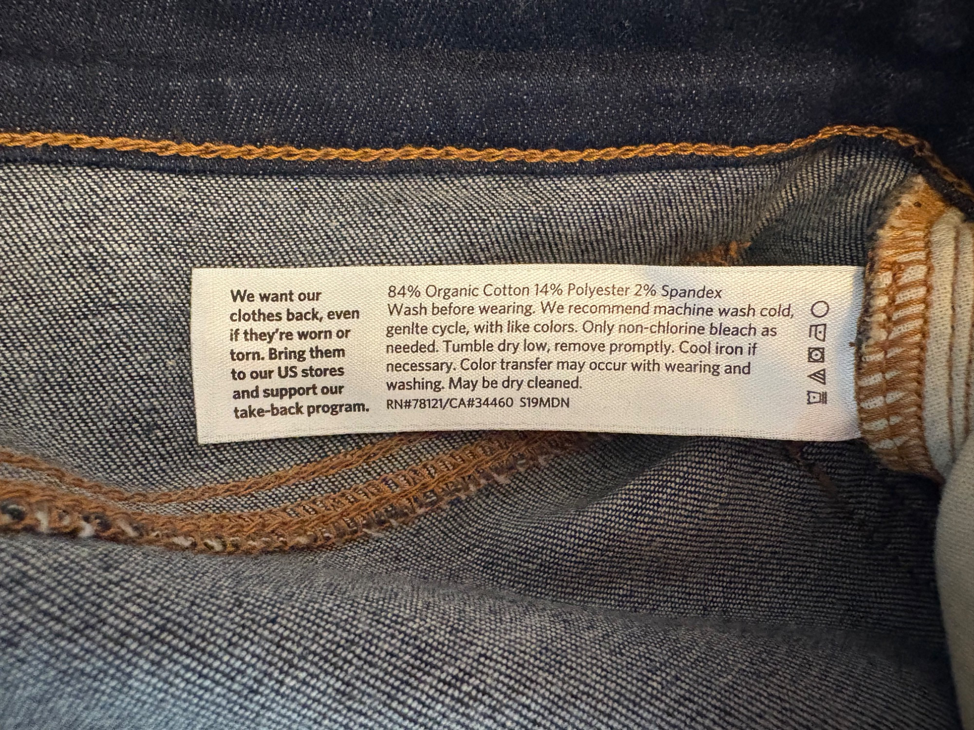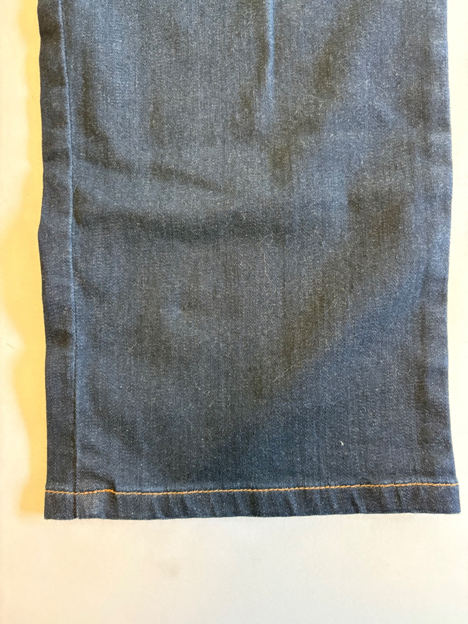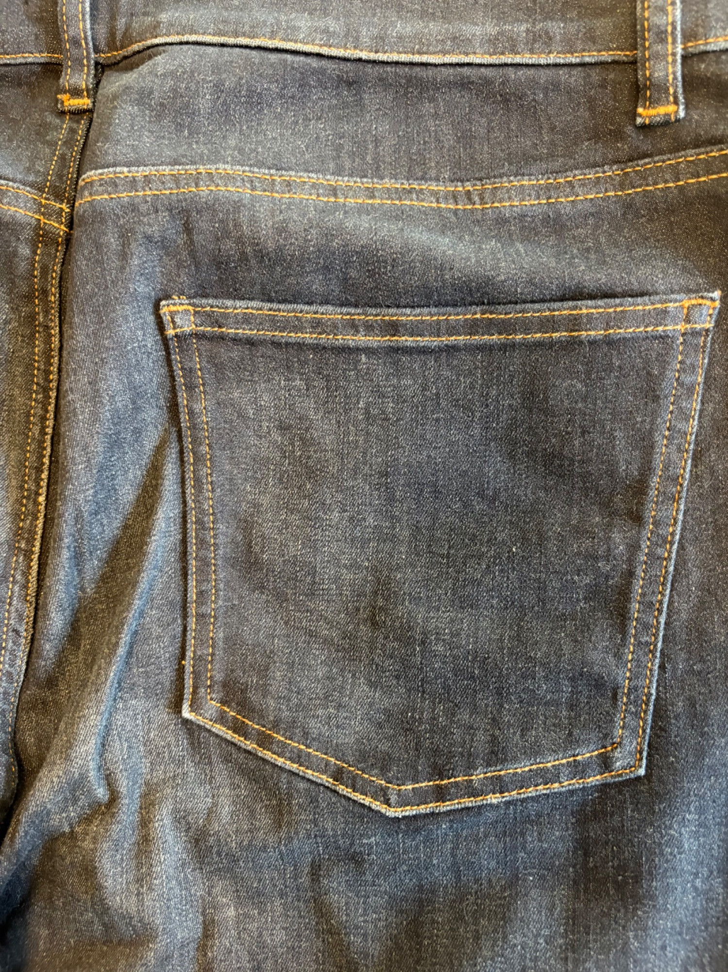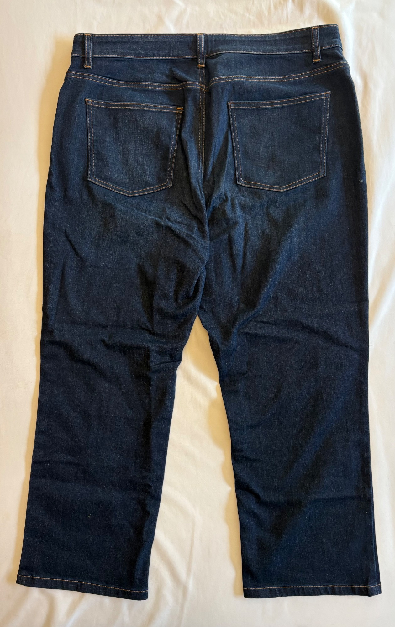 Two pairs of Eileen Fisher blue denim jeans. Darker pair appears to be somewhat cropped with slightly tapered legs, gold top-stitching, zip fly front, and classic 5-pocket design. 84% cotton with 14% polyester and 2 % spandex. In good used condition. Measures 19" side to side at waist with 25" inseam. Size tag says 16. Lighter pair has tapered legs, gold top-stitching, zip fly front, and classic 5-pocket design. 98% cotton with 2% spandex. In good used condition. Measures 20" side to side at waist with 29" inseam. Size tag says 14.