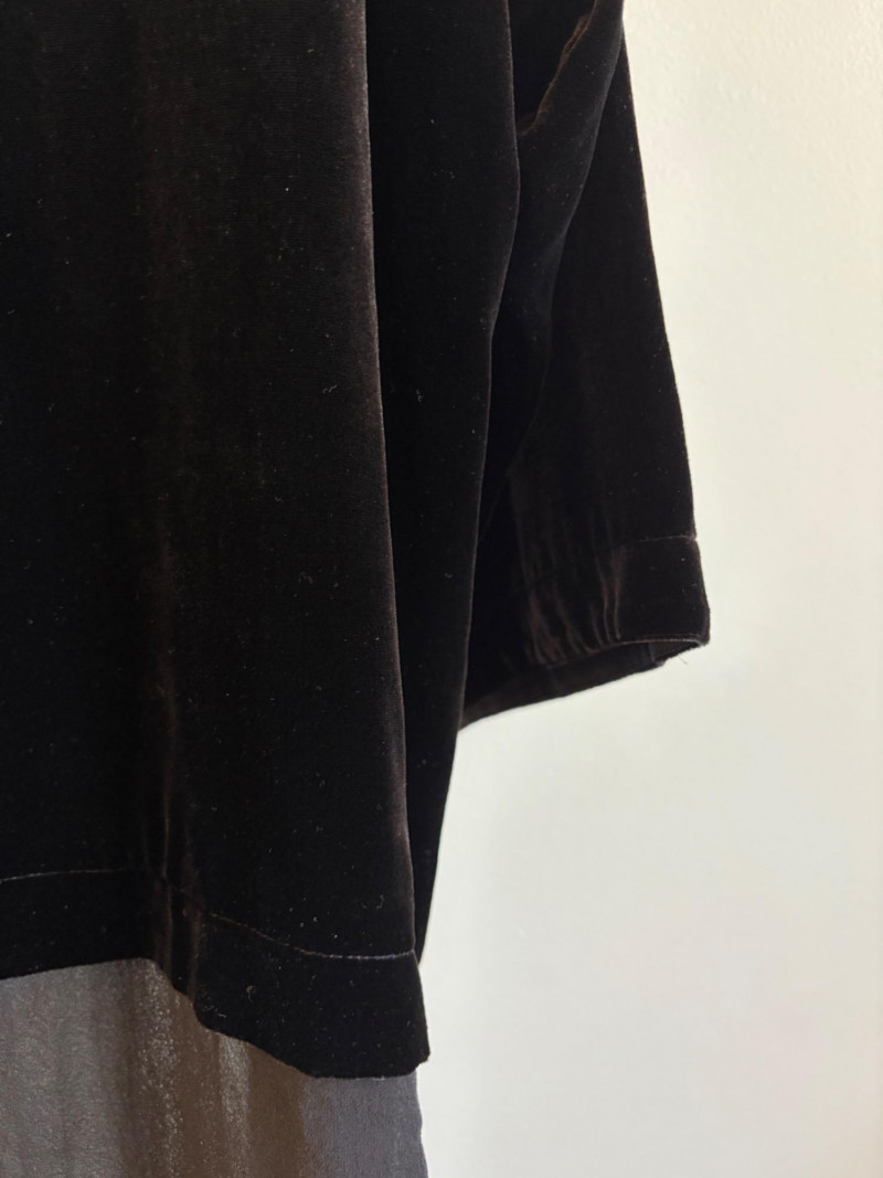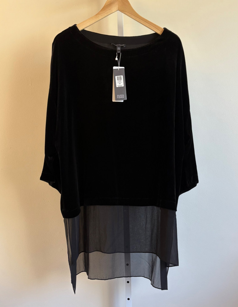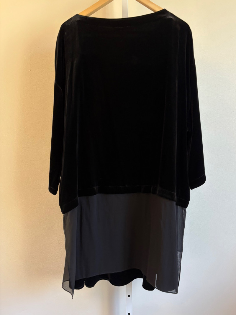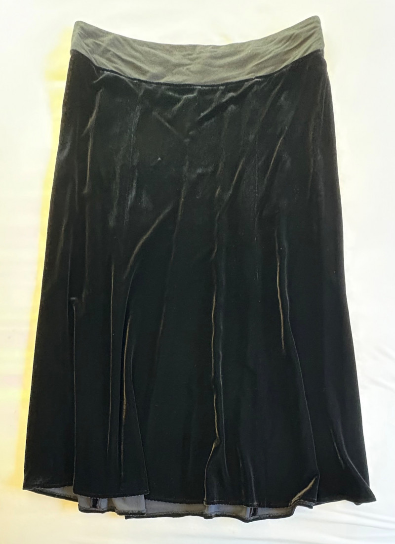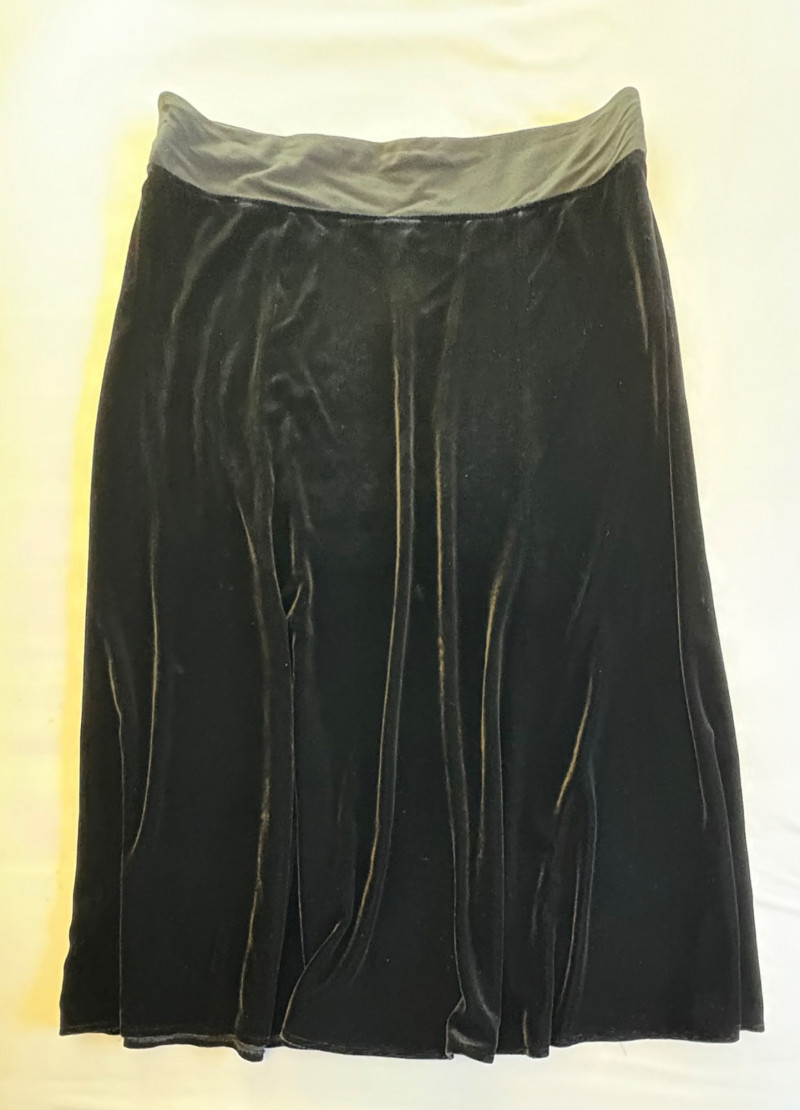 Lovely black velvet tunic and skirt from Eileen Fisher. Can be worn separately or together. Super soft velvet tunic top has rounded neck, dropped shoulders, and 3/4 length sleeves. Attached to the hem of the overshirt is a silk section with a matte surface for great contrast to the shiny velvet nap. The silk insert is split at the hem with the rear hem approximately 4" longer than the front hem. New with tag. Velvet portion is 82% rayon with 18% silk while the lower section is 100% silk. Measures 25.5" pit to pit and 34" from back neckline to bottom of back hem. Size tag says L/G. Skirt has wide stretchy spandex waistband for comfort and side panels for more swing; falls mid-calf length or lower on most women. In excellent condition. 80% rayon and 18% silk with 2% spandex. Measures 18.5" side to side at waist and 34" from back waist to bottom of hem. Size tag says XL.