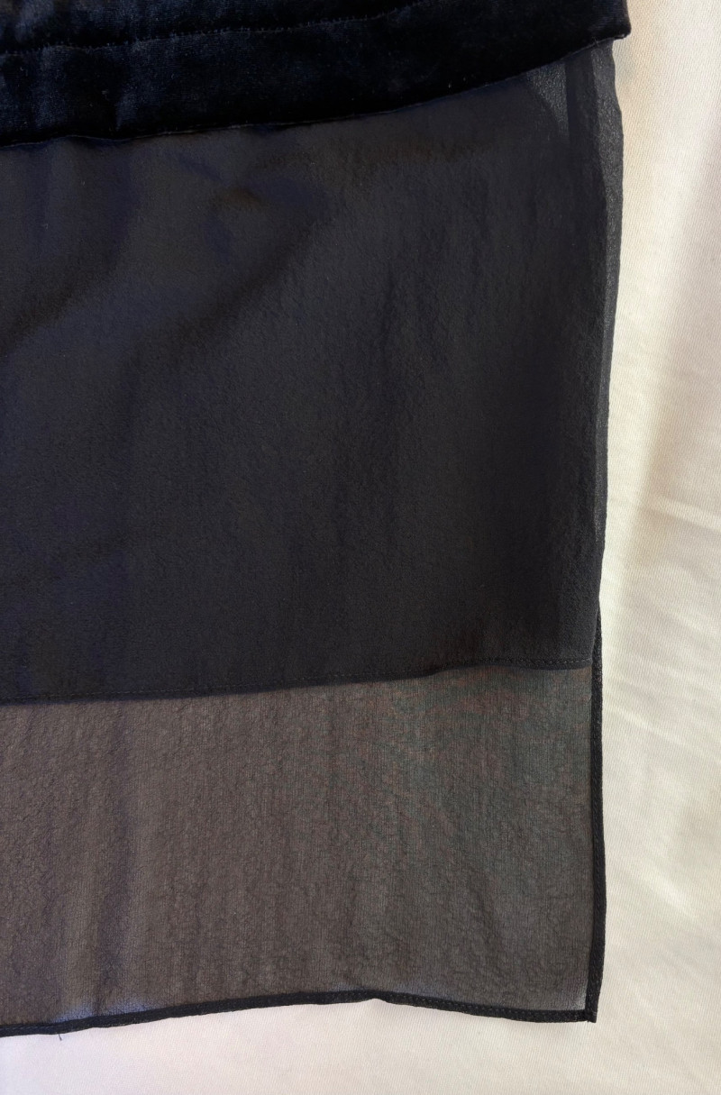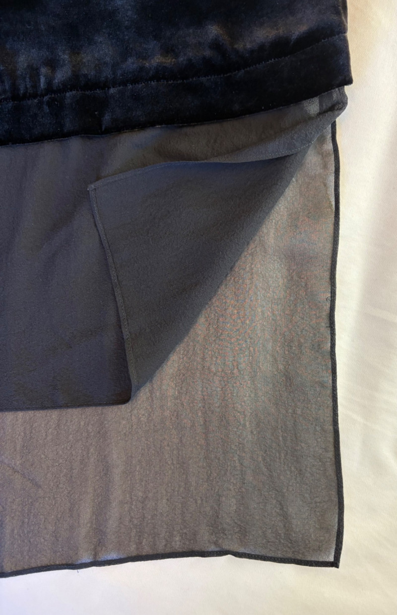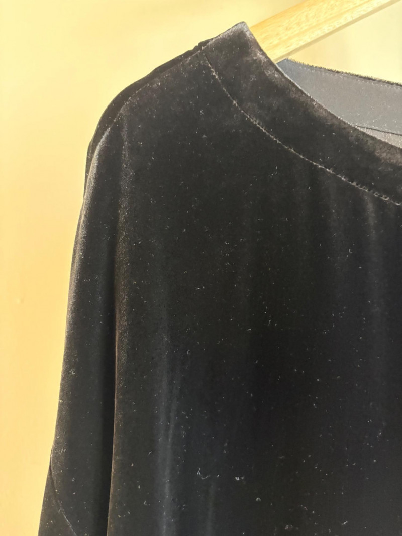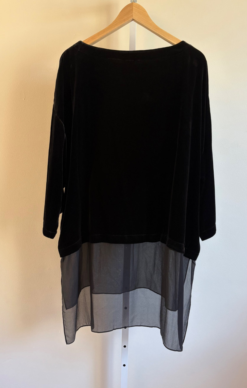 Lovely black velvet tunic and skirt from Eileen Fisher. Can be worn separately or together. Super soft velvet tunic top has rounded neck, dropped shoulders, and 3/4 length sleeves. Attached to the hem of the overshirt is a silk section with a matte surface for great contrast to the shiny velvet nap. The silk insert is split at the hem with the rear hem approximately 4" longer than the front hem. New with tag. Velvet portion is 82% rayon with 18% silk while the lower section is 100% silk. Measures 25.5" pit to pit and 34" from back neckline to bottom of back hem. Size tag says L/G. Skirt has wide stretchy spandex waistband for comfort and side panels for more swing; falls mid-calf length or lower on most women. In excellent condition. 80% rayon and 18% silk with 2% spandex. Measures 18.5" side to side at waist and 34" from back waist to bottom of hem. Size tag says XL.