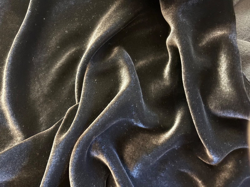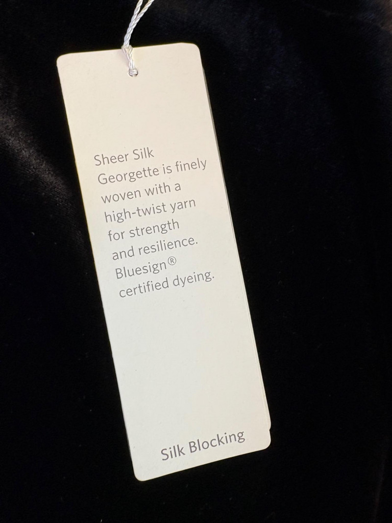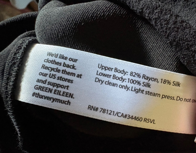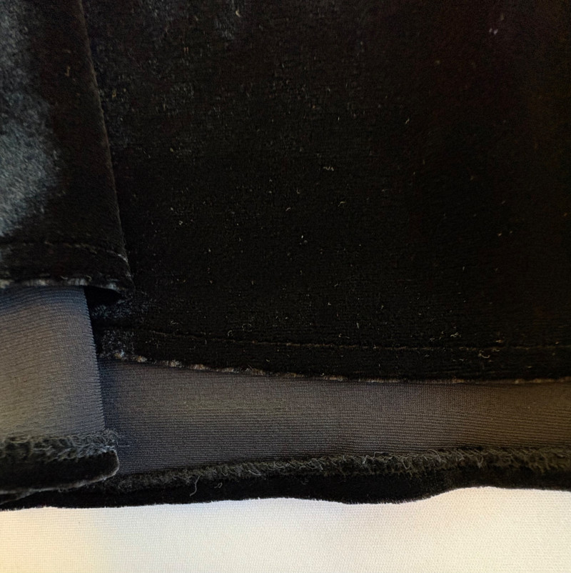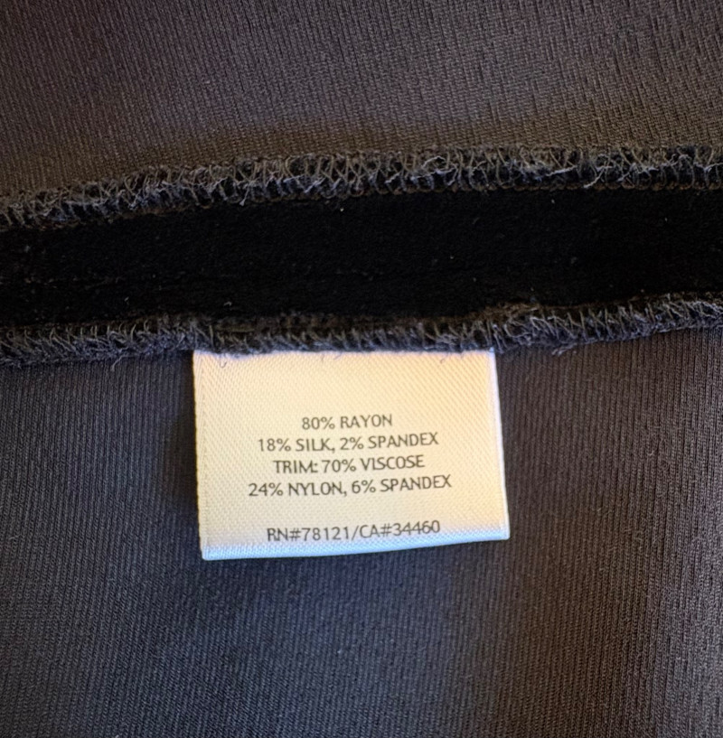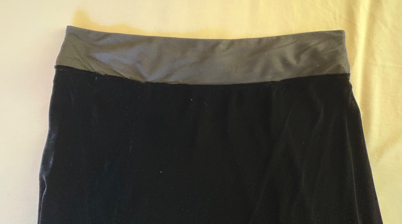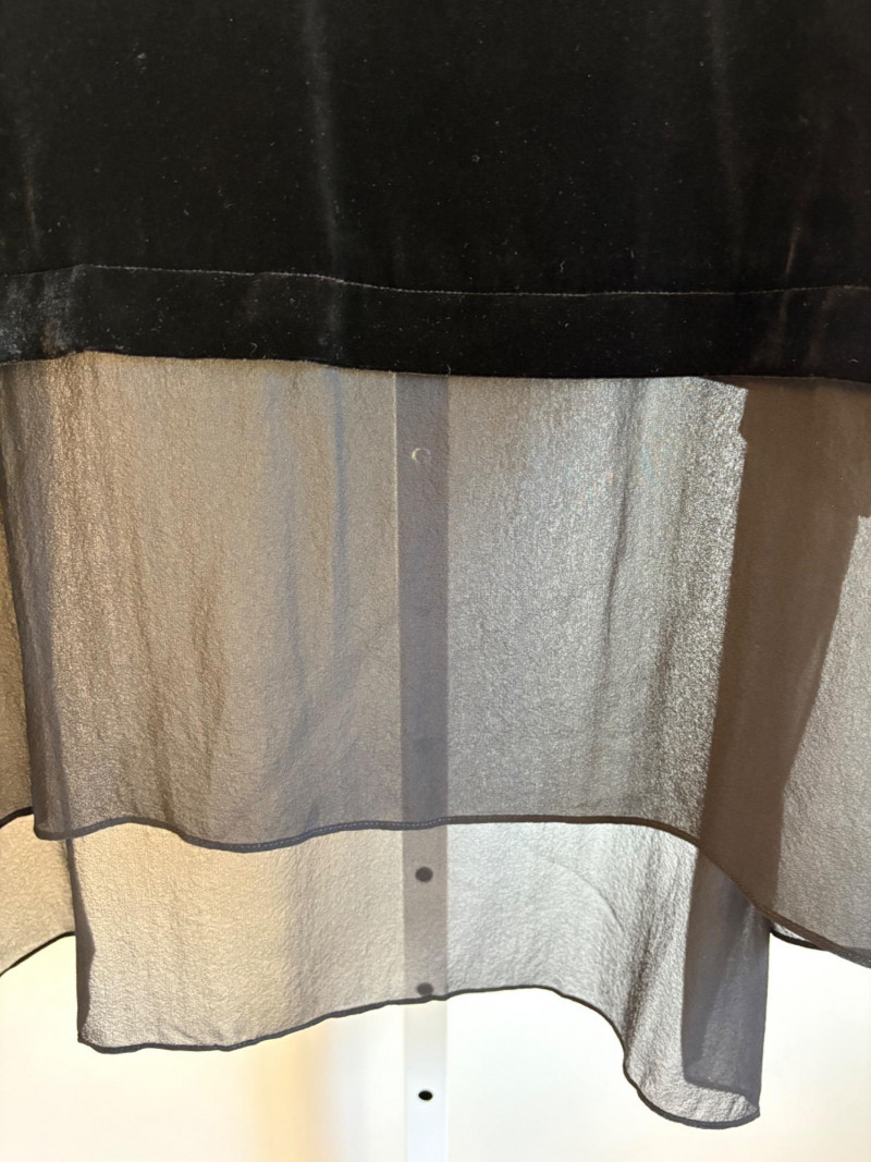 Lovely black velvet tunic and skirt from Eileen Fisher. Can be worn separately or together. Super soft velvet tunic top has rounded neck, dropped shoulders, and 3/4 length sleeves. Attached to the hem of the overshirt is a silk section with a matte surface for great contrast to the shiny velvet nap. The silk insert is split at the hem with the rear hem approximately 4" longer than the front hem. New with tag. Velvet portion is 82% rayon with 18% silk while the lower section is 100% silk. Measures 25.5" pit to pit and 34" from back neckline to bottom of back hem. Size tag says L/G. Skirt has wide stretchy spandex waistband for comfort and side panels for more swing; falls mid-calf length or lower on most women. In excellent condition. 80% rayon and 18% silk with 2% spandex. Measures 18.5" side to side at waist and 34" from back waist to bottom of hem. Size tag says XL.