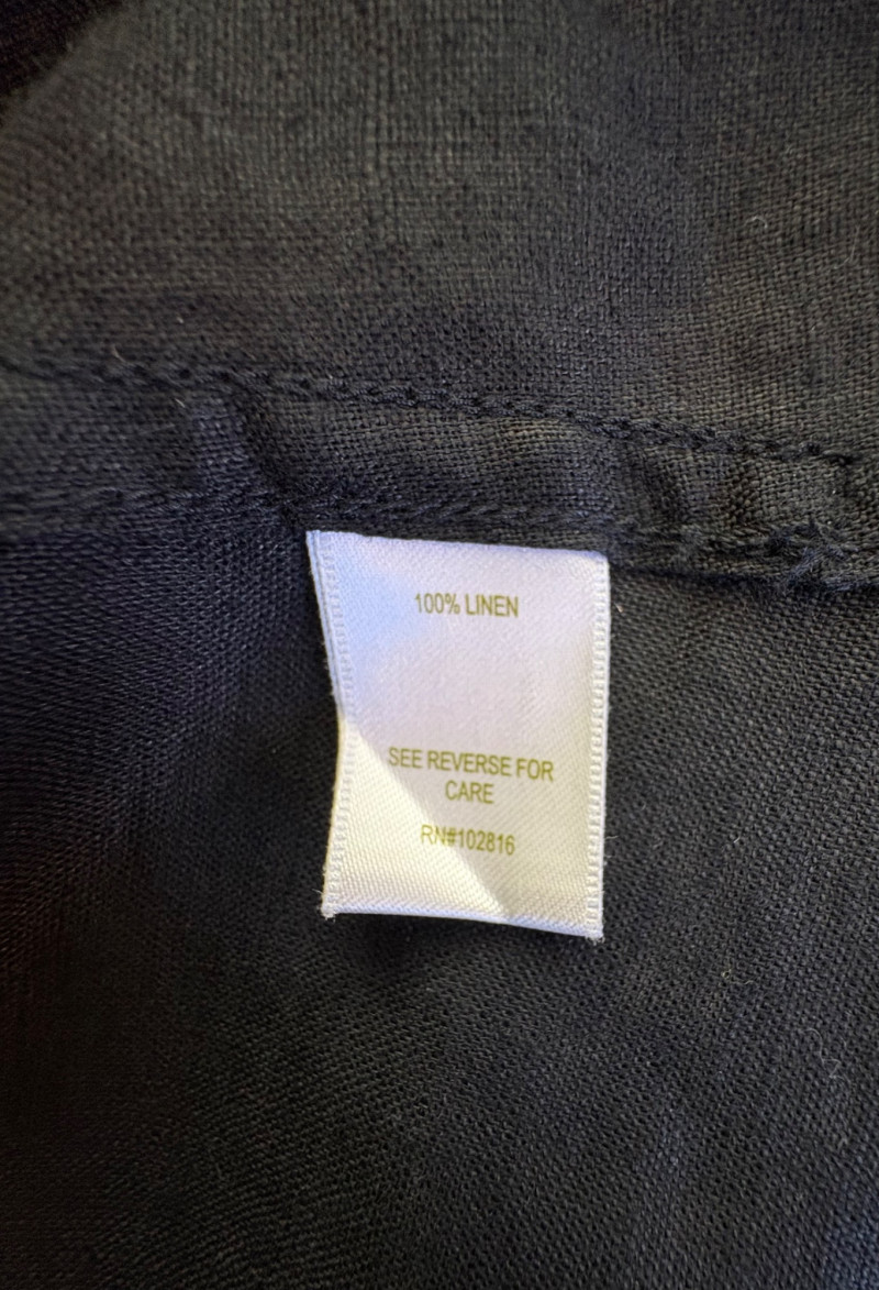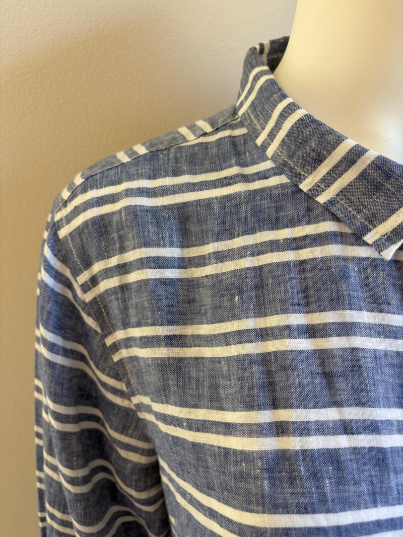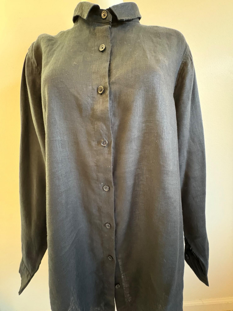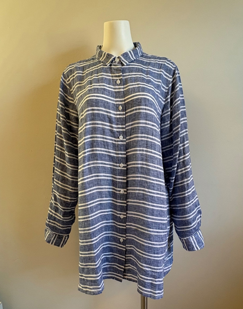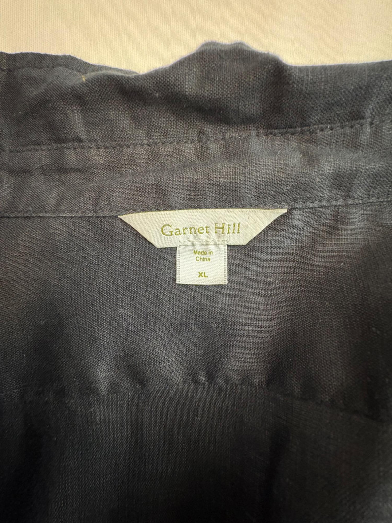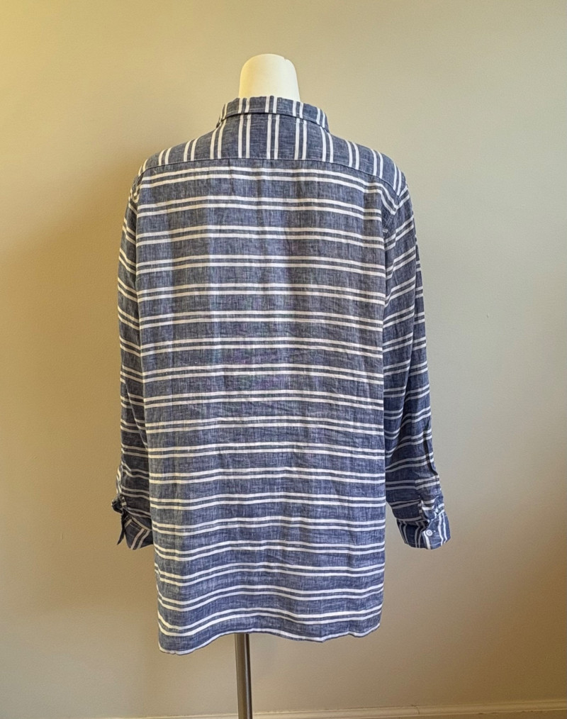 Versatile trio of shirts from Garnet Hill and Eileen Fisher. Lightweight summer shirt from Eileen Fisher has button front closure, drop shoulders, no sleeve seams and a split hem with the front hem approximately 4" shorter than the back hem. In excellent condition. 100% linen. Measures 28" pit to pit and 30" from neckline to bottom of hem. This would be a perfect swim cover-up. Size tag says XL. Black shirt from Garnet Hill has button front closure, narrow back yoke, single button cuff closure, and split hem with squared off back/curved front. In excellent condition. 100% linen. Measures 24" pit to pit and 33" from back neckline seam to bottom of back hem. Size tag says XL Blue and white striped shirt from Garnet Hill has button front closure, small back yoke, single button cuff closure, and split hem with squared off back/curved front. In very good condition, but we noticed a discoloration on the lower left front that would probably launder out - see last photo.. 100% linen. Measures 23.5" pit to pit and 32" from back neckline seam to bottom back hem. Size tag says XL.