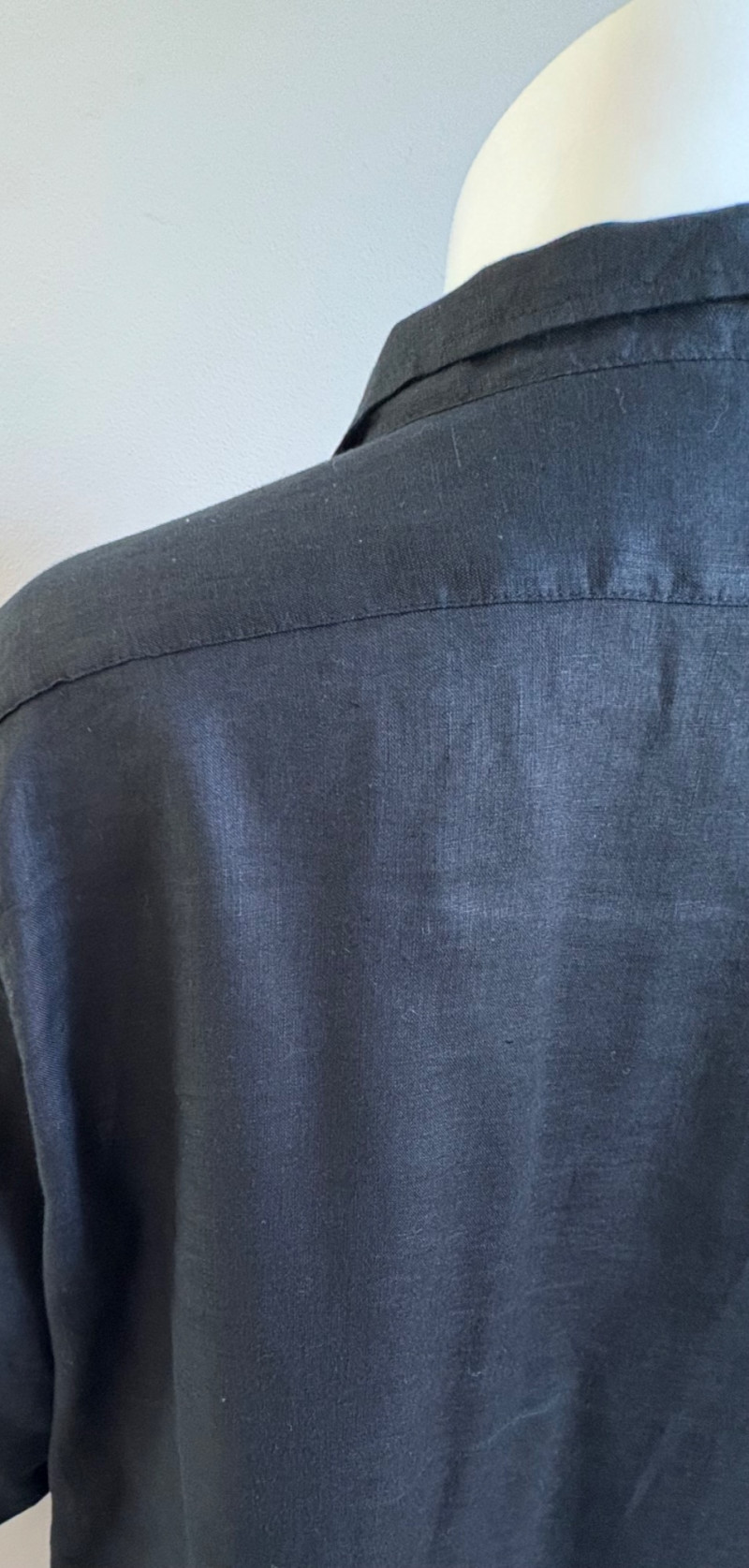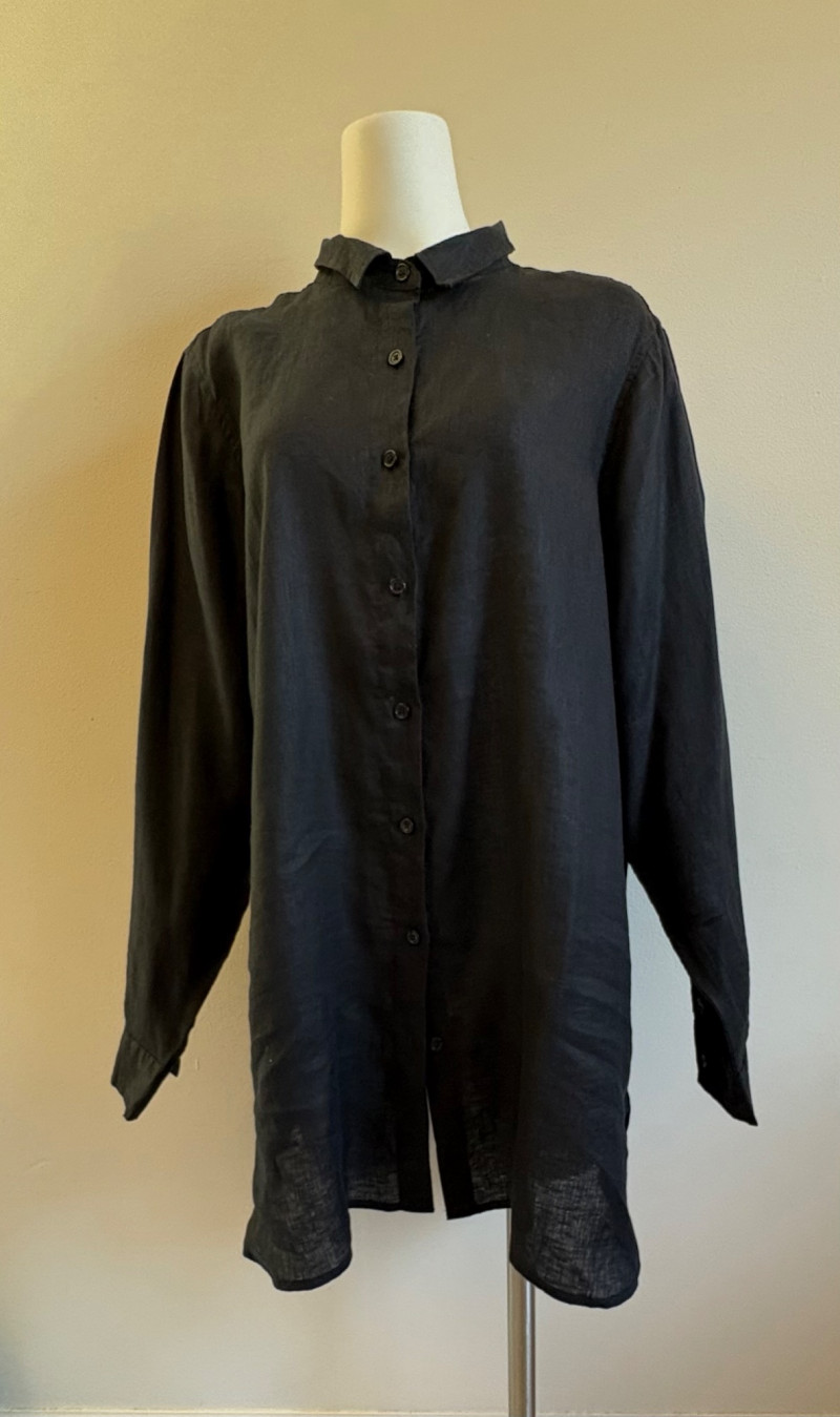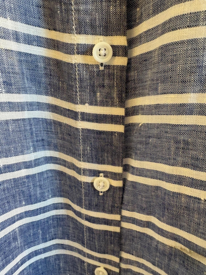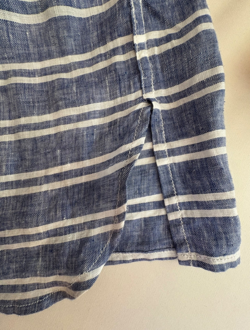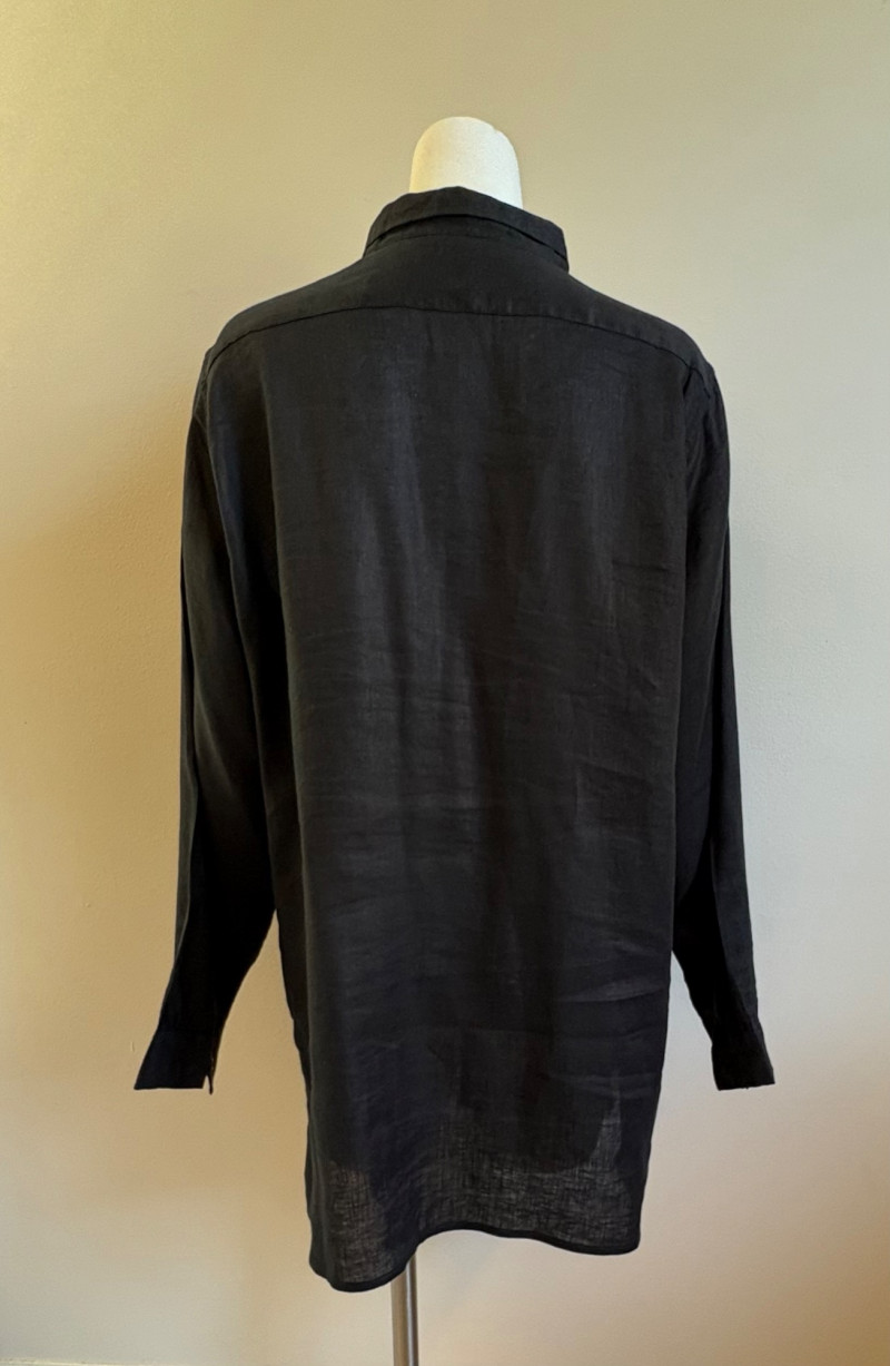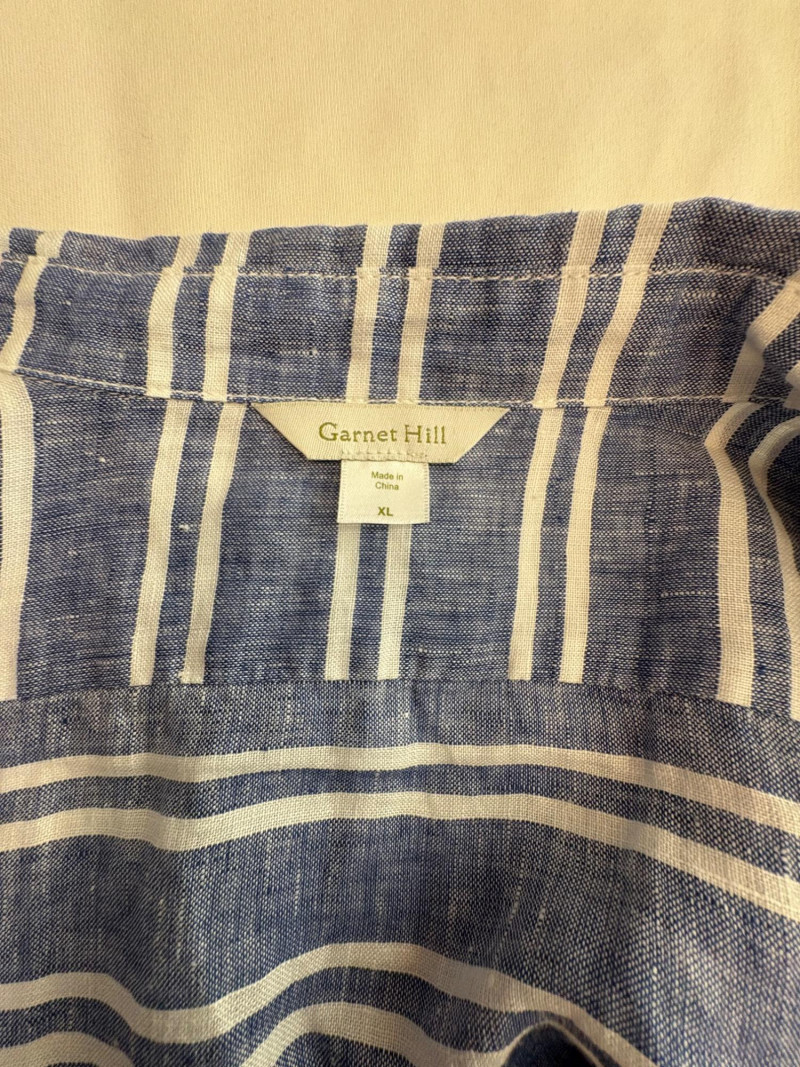 Versatile trio of shirts from Garnet Hill and Eileen Fisher. Lightweight summer shirt from Eileen Fisher has button front closure, drop shoulders, no sleeve seams and a split hem with the front hem approximately 4" shorter than the back hem. In excellent condition. 100% linen. Measures 28" pit to pit and 30" from neckline to bottom of hem. This would be a perfect swim cover-up. Size tag says XL. Black shirt from Garnet Hill has button front closure, narrow back yoke, single button cuff closure, and split hem with squared off back/curved front. In excellent condition. 100% linen. Measures 24" pit to pit and 33" from back neckline seam to bottom of back hem. Size tag says XL Blue and white striped shirt from Garnet Hill has button front closure, small back yoke, single button cuff closure, and split hem with squared off back/curved front. In very good condition, but we noticed a discoloration on the lower left front that would probably launder out - see last photo.. 100% linen. Measures 23.5" pit to pit and 32" from back neckline seam to bottom back hem. Size tag says XL.