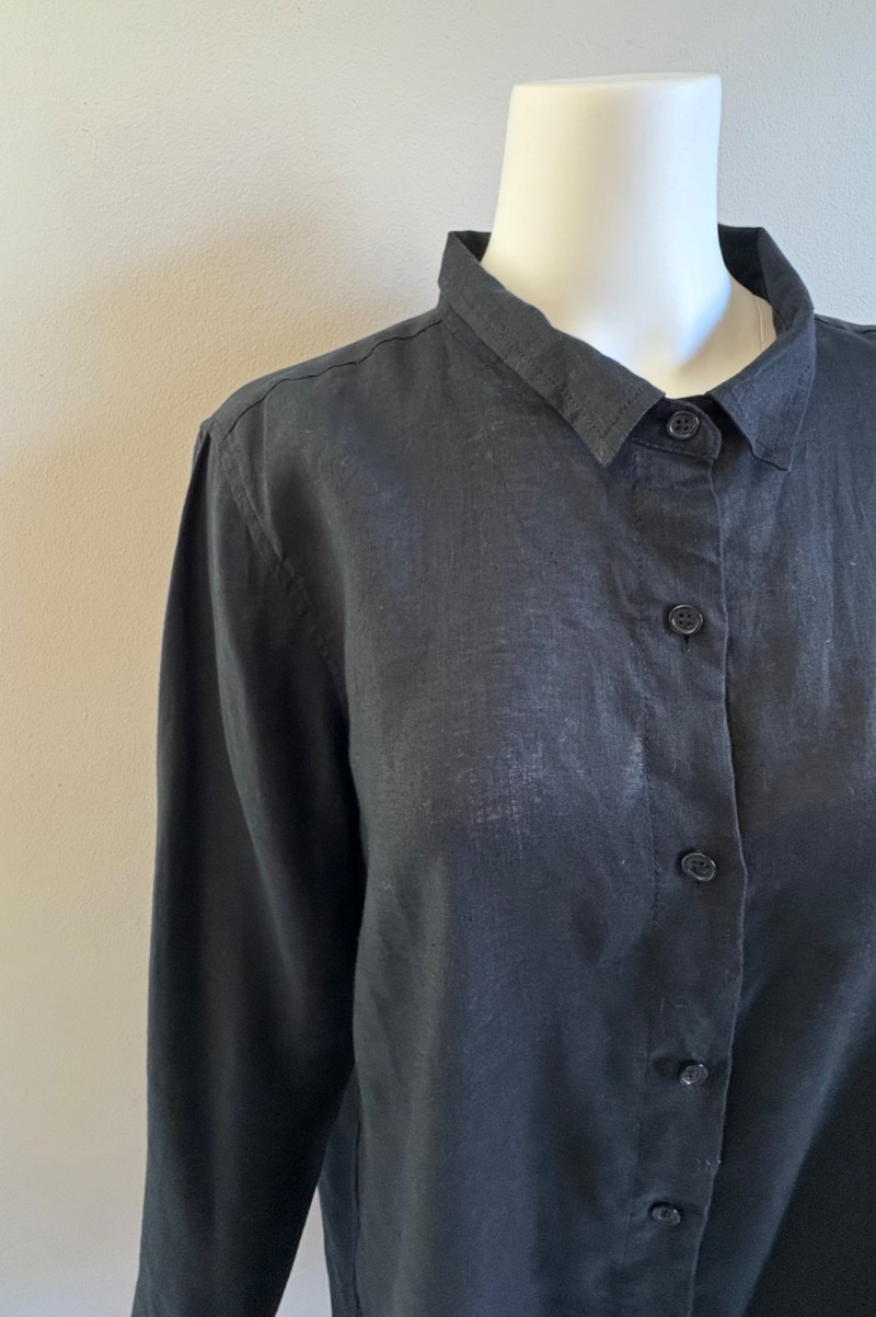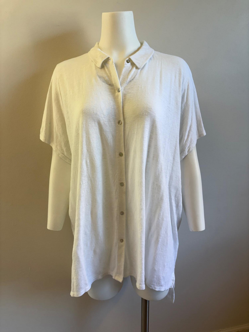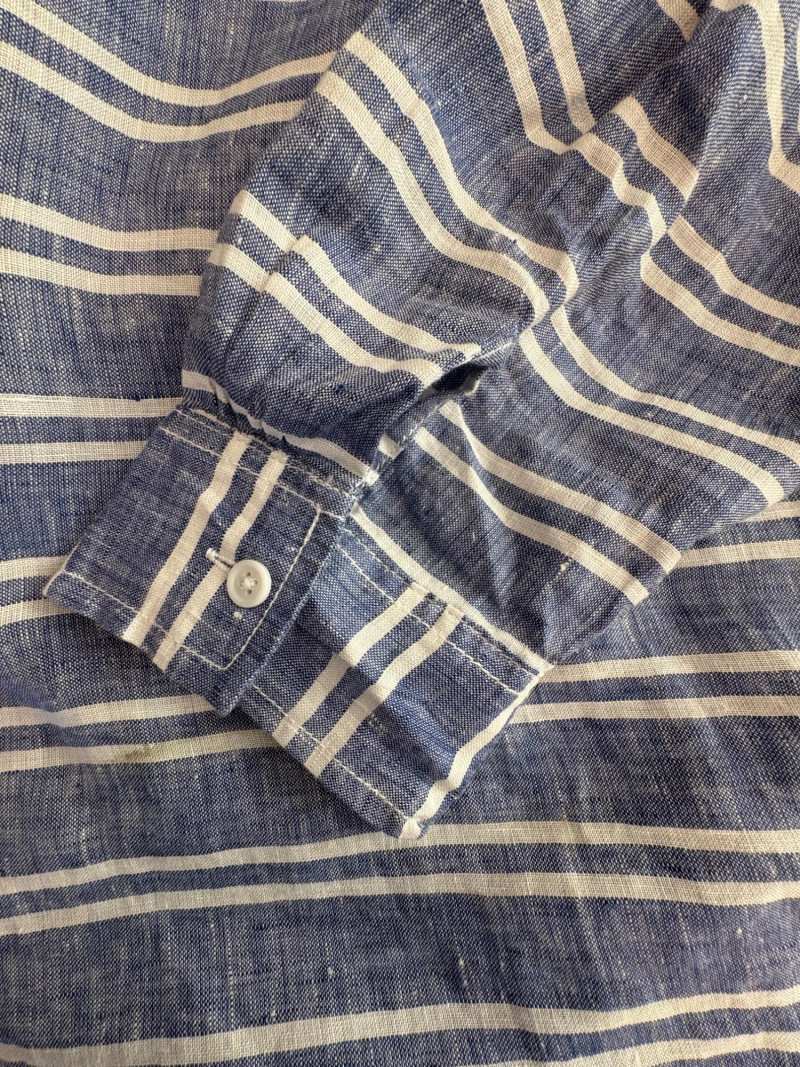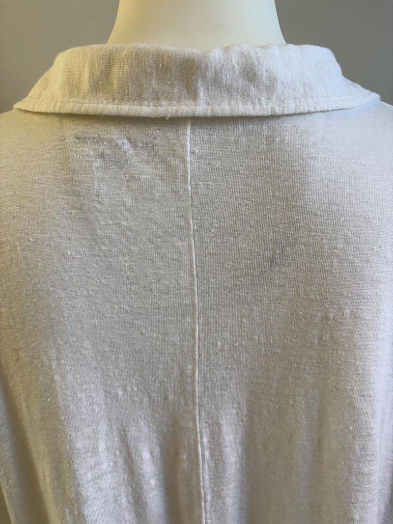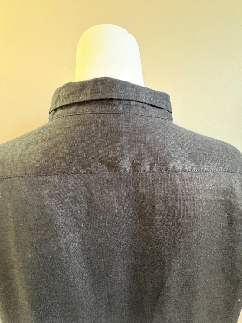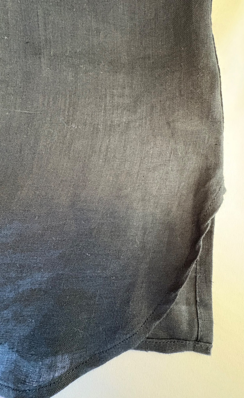 Versatile trio of shirts from Garnet Hill and Eileen Fisher. Lightweight summer shirt from Eileen Fisher has button front closure, drop shoulders, no sleeve seams and a split hem with the front hem approximately 4" shorter than the back hem. In excellent condition. 100% linen. Measures 28" pit to pit and 30" from neckline to bottom of hem. This would be a perfect swim cover-up. Size tag says XL. Black shirt from Garnet Hill has button front closure, narrow back yoke, single button cuff closure, and split hem with squared off back/curved front. In excellent condition. 100% linen. Measures 24" pit to pit and 33" from back neckline seam to bottom of back hem. Size tag says XL Blue and white striped shirt from Garnet Hill has button front closure, small back yoke, single button cuff closure, and split hem with squared off back/curved front. In very good condition, but we noticed a discoloration on the lower left front that would probably launder out - see last photo.. 100% linen. Measures 23.5" pit to pit and 32" from back neckline seam to bottom back hem. Size tag says XL.