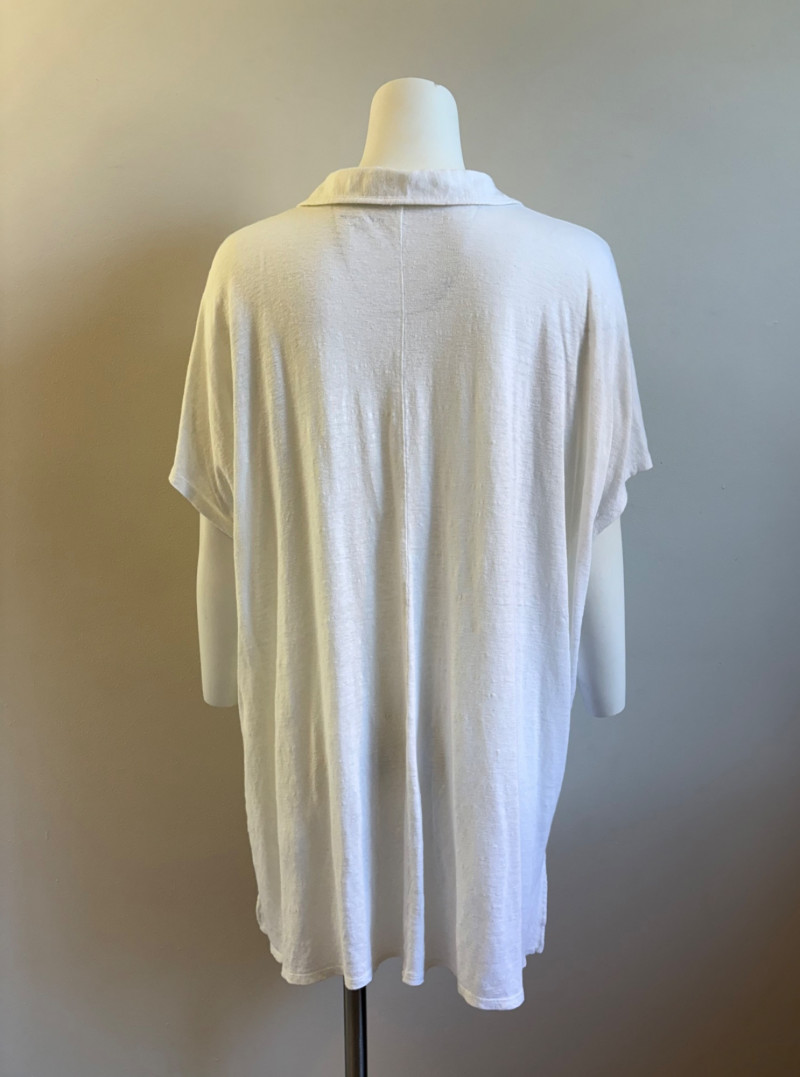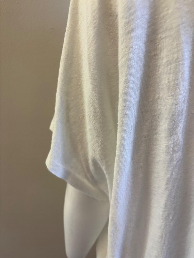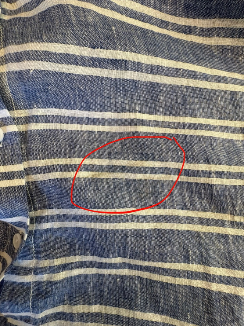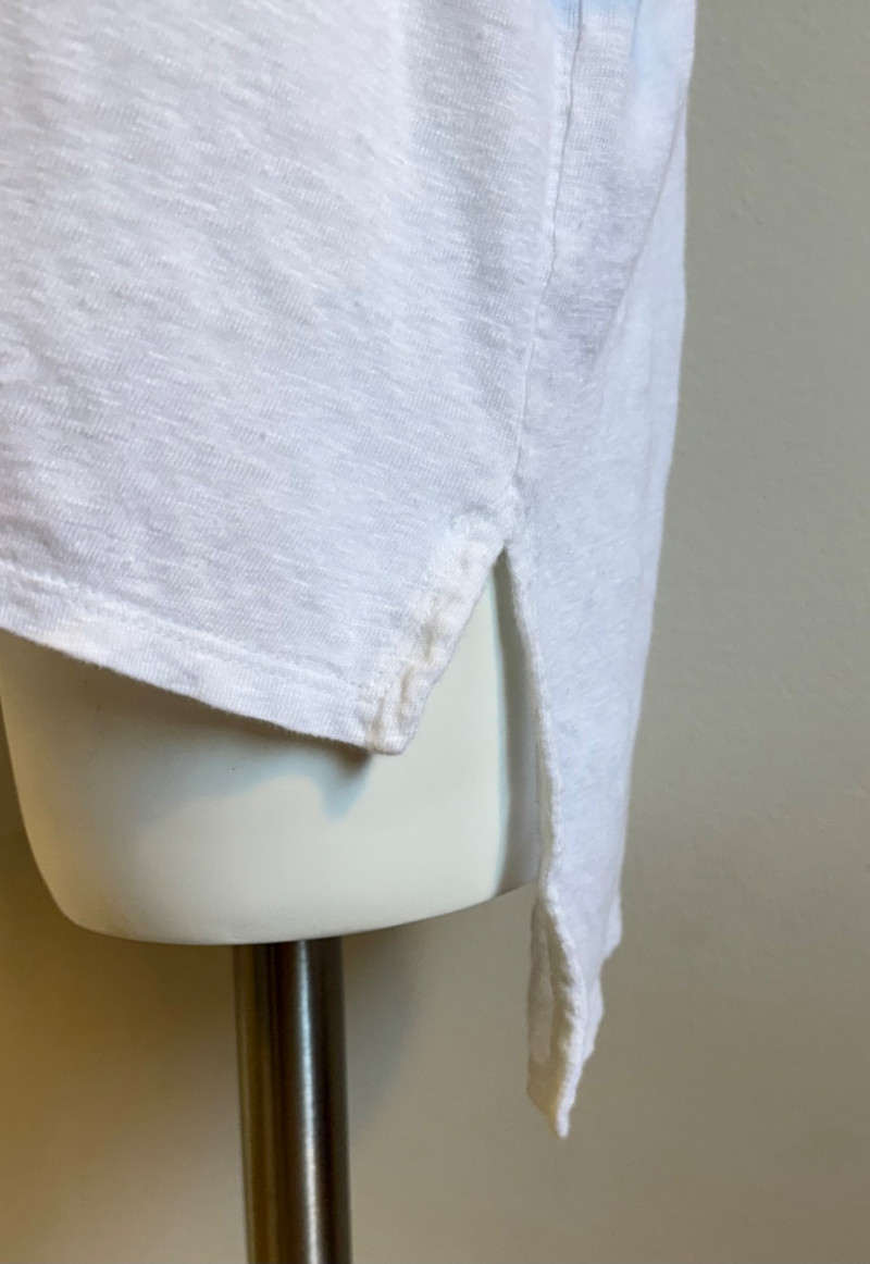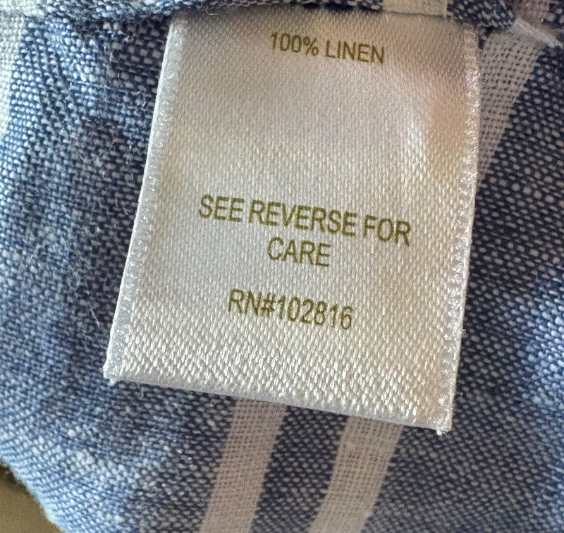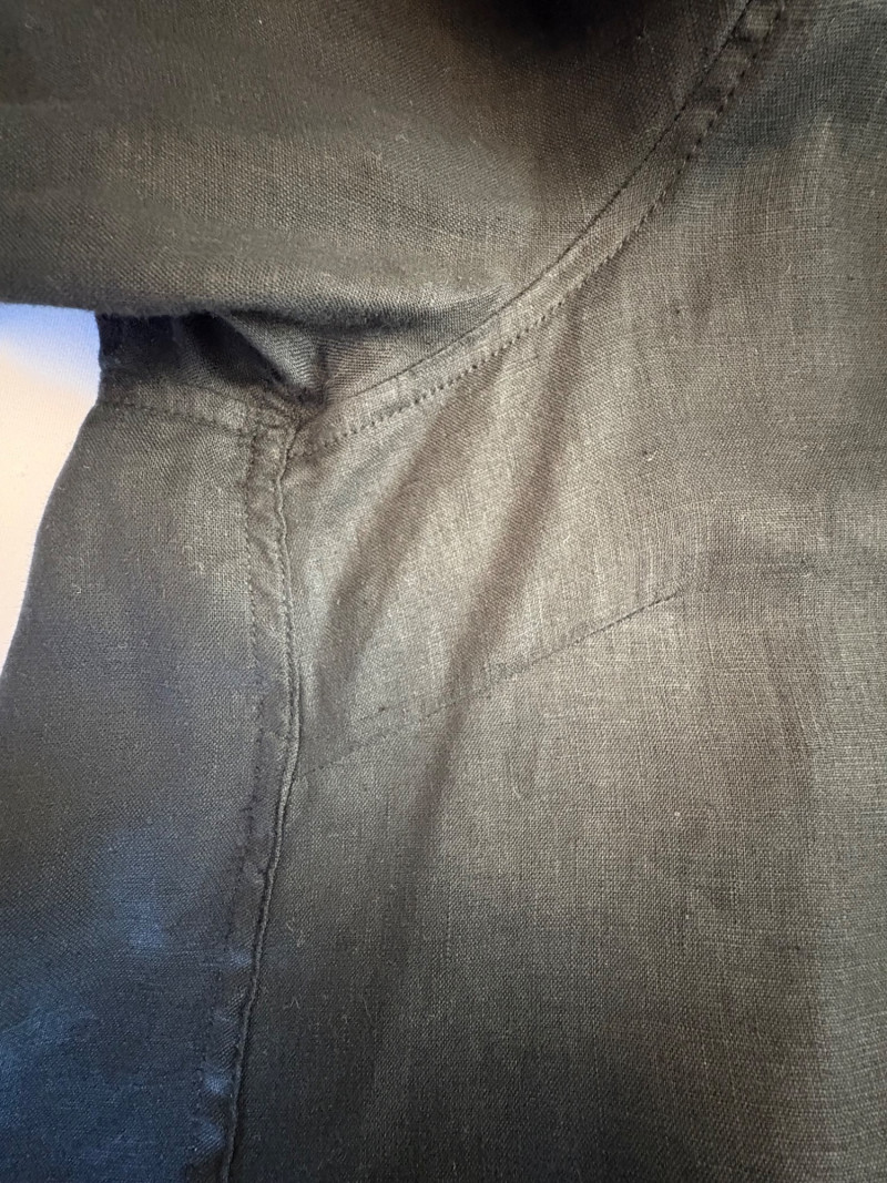 Versatile trio of shirts from Garnet Hill and Eileen Fisher. Lightweight summer shirt from Eileen Fisher has button front closure, drop shoulders, no sleeve seams and a split hem with the front hem approximately 4" shorter than the back hem. In excellent condition. 100% linen. Measures 28" pit to pit and 30" from neckline to bottom of hem. This would be a perfect swim cover-up. Size tag says XL. Black shirt from Garnet Hill has button front closure, narrow back yoke, single button cuff closure, and split hem with squared off back/curved front. In excellent condition. 100% linen. Measures 24" pit to pit and 33" from back neckline seam to bottom of back hem. Size tag says XL Blue and white striped shirt from Garnet Hill has button front closure, small back yoke, single button cuff closure, and split hem with squared off back/curved front. In very good condition, but we noticed a discoloration on the lower left front that would probably launder out - see last photo.. 100% linen. Measures 23.5" pit to pit and 32" from back neckline seam to bottom back hem. Size tag says XL.