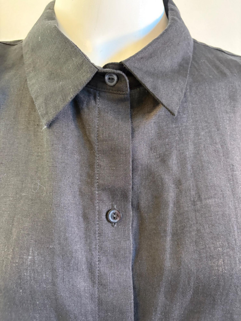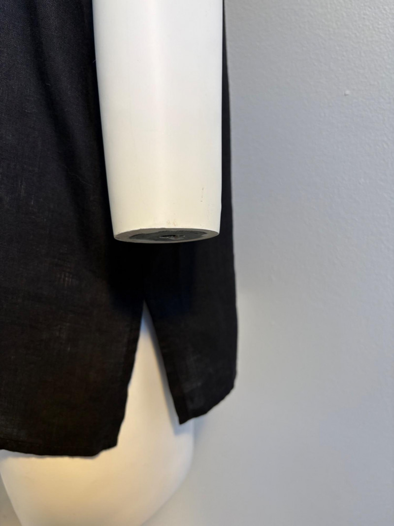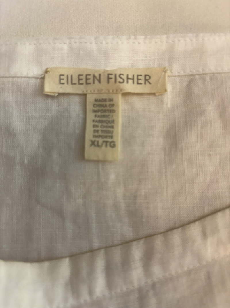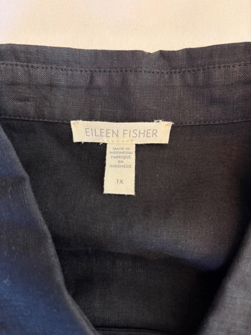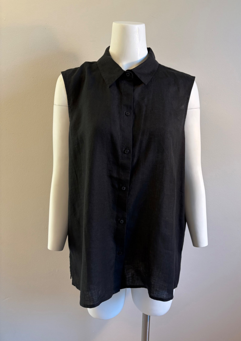Black & white summertime tops from Eileen Fisher. Simple white scoop neck top with tied cuffs, dropped shoulders, and curved hem. In excellent condition but has very slight discoloration along collar (very very slight; doesn't show in photos - needs to be laundered). 100% linen. Measures 26" pit to pit and 28" from back neckline to back bottom hemline. Size tag says XL. Black sleeveless top with collar, button front closure, and split hem. In excellent condition. 100% linen. Measures 25" pit to pit and 26" from back neckline seam to bottom back hem. Size tag says 1X.