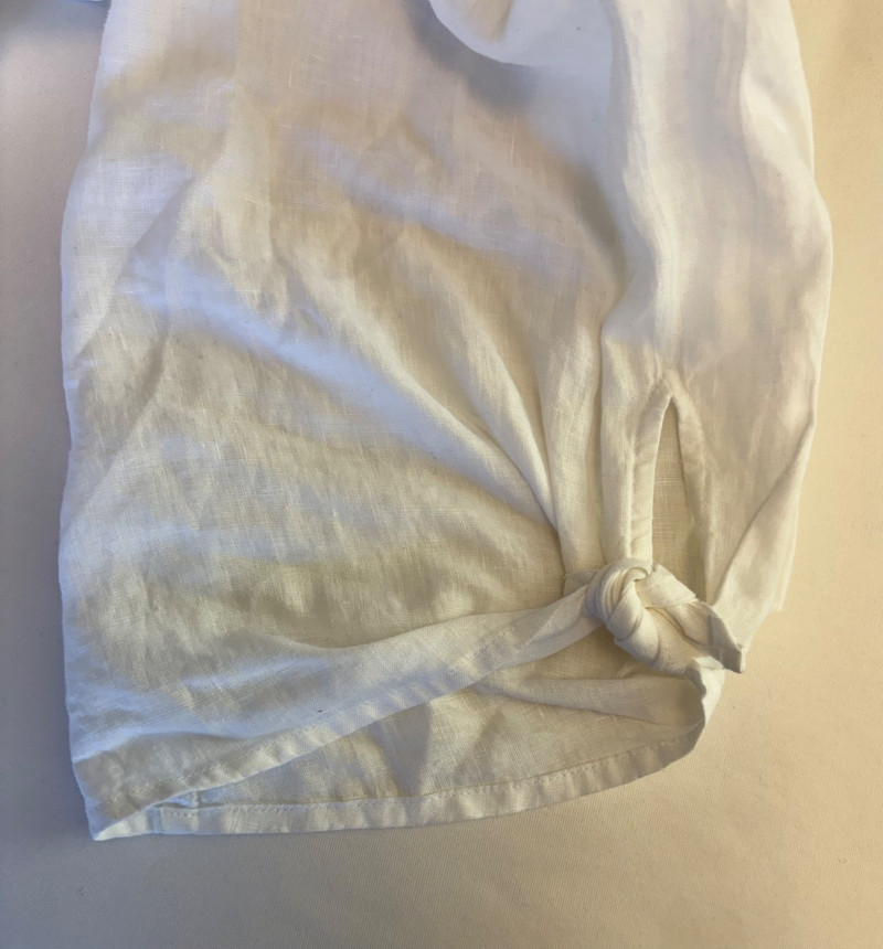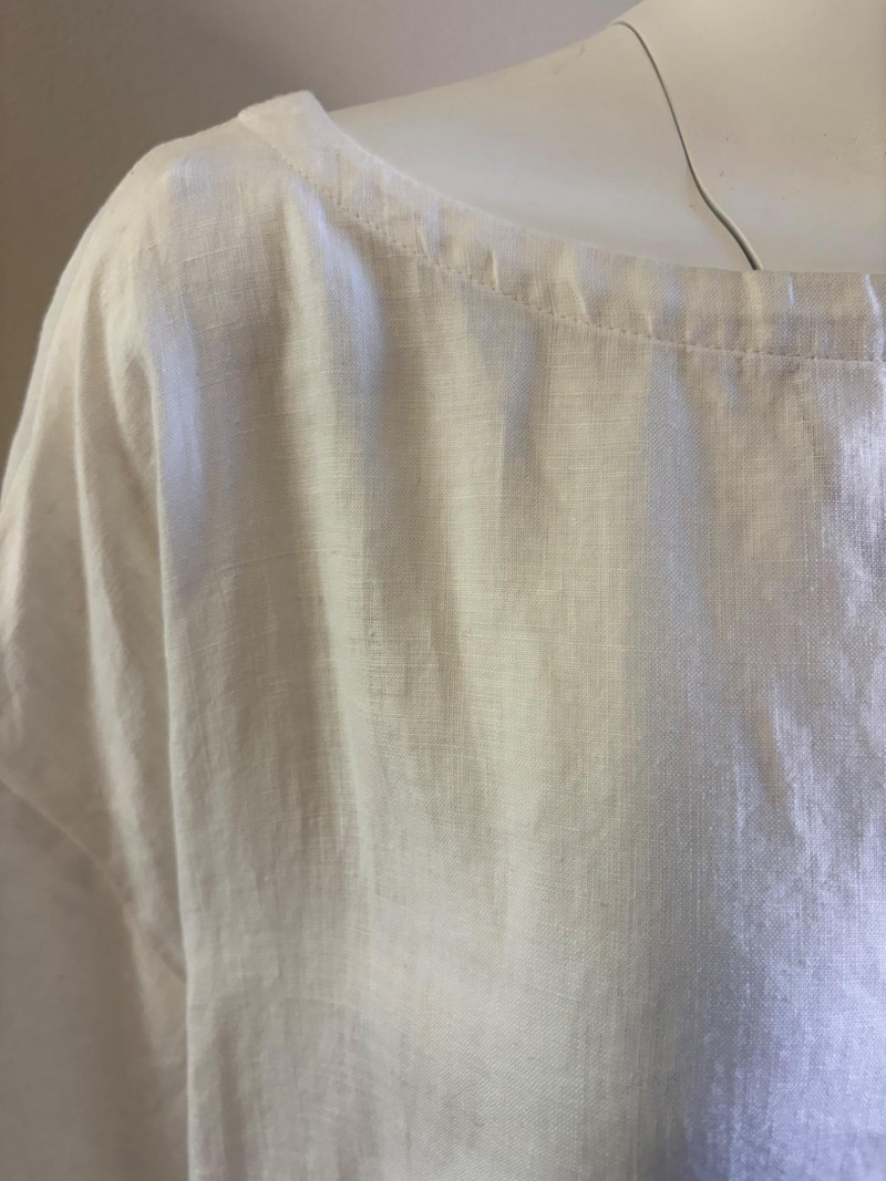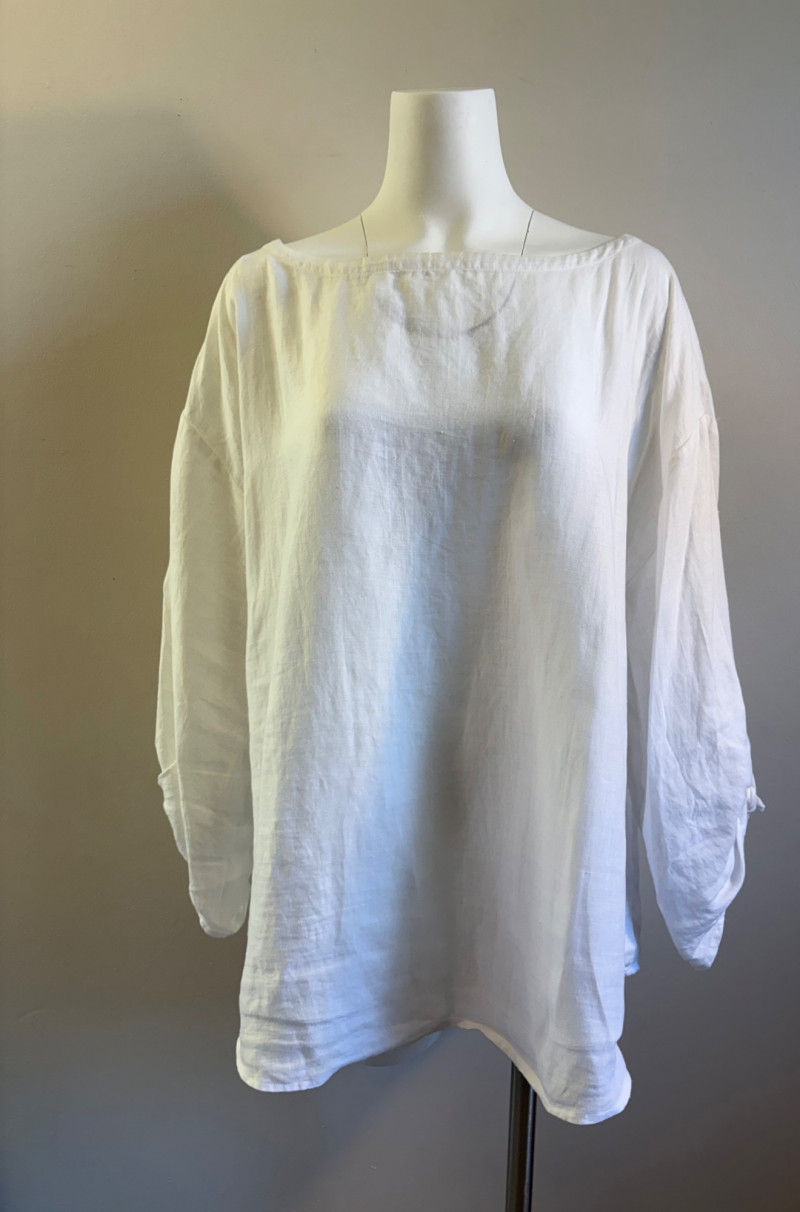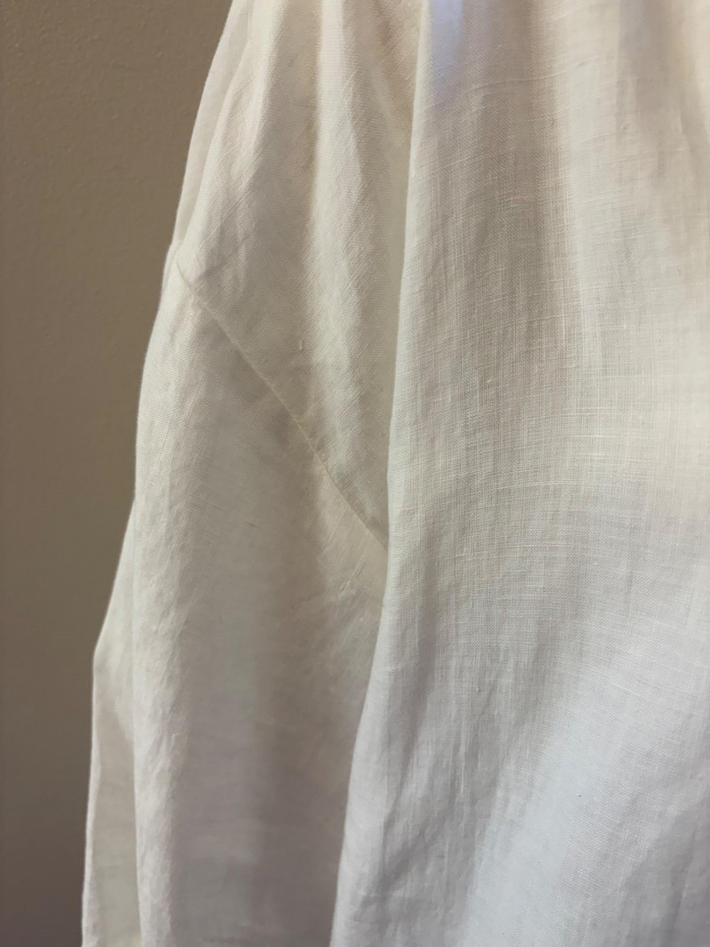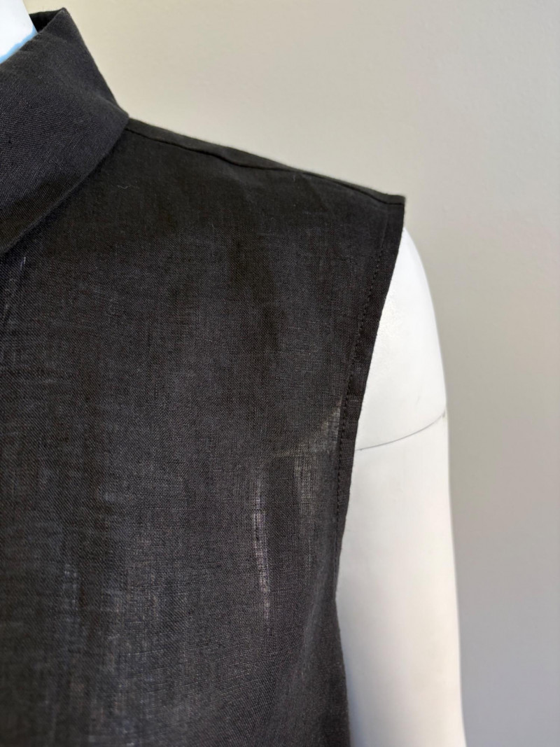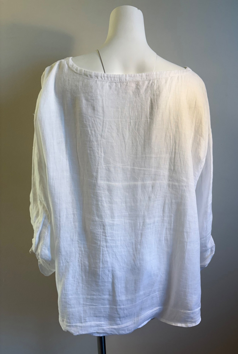 Black & white summertime tops from Eileen Fisher. Simple white scoop neck top with tied cuffs, dropped shoulders, and curved hem. In excellent condition but has very slight discoloration along collar (very very slight; doesn't show in photos - needs to be laundered). 100% linen. Measures 26" pit to pit and 28" from back neckline to back bottom hemline. Size tag says XL. Black sleeveless top with collar, button front closure, and split hem. In excellent condition. 100% linen. Measures 25" pit to pit and 26" from back neckline seam to bottom back hem. Size tag says 1X.