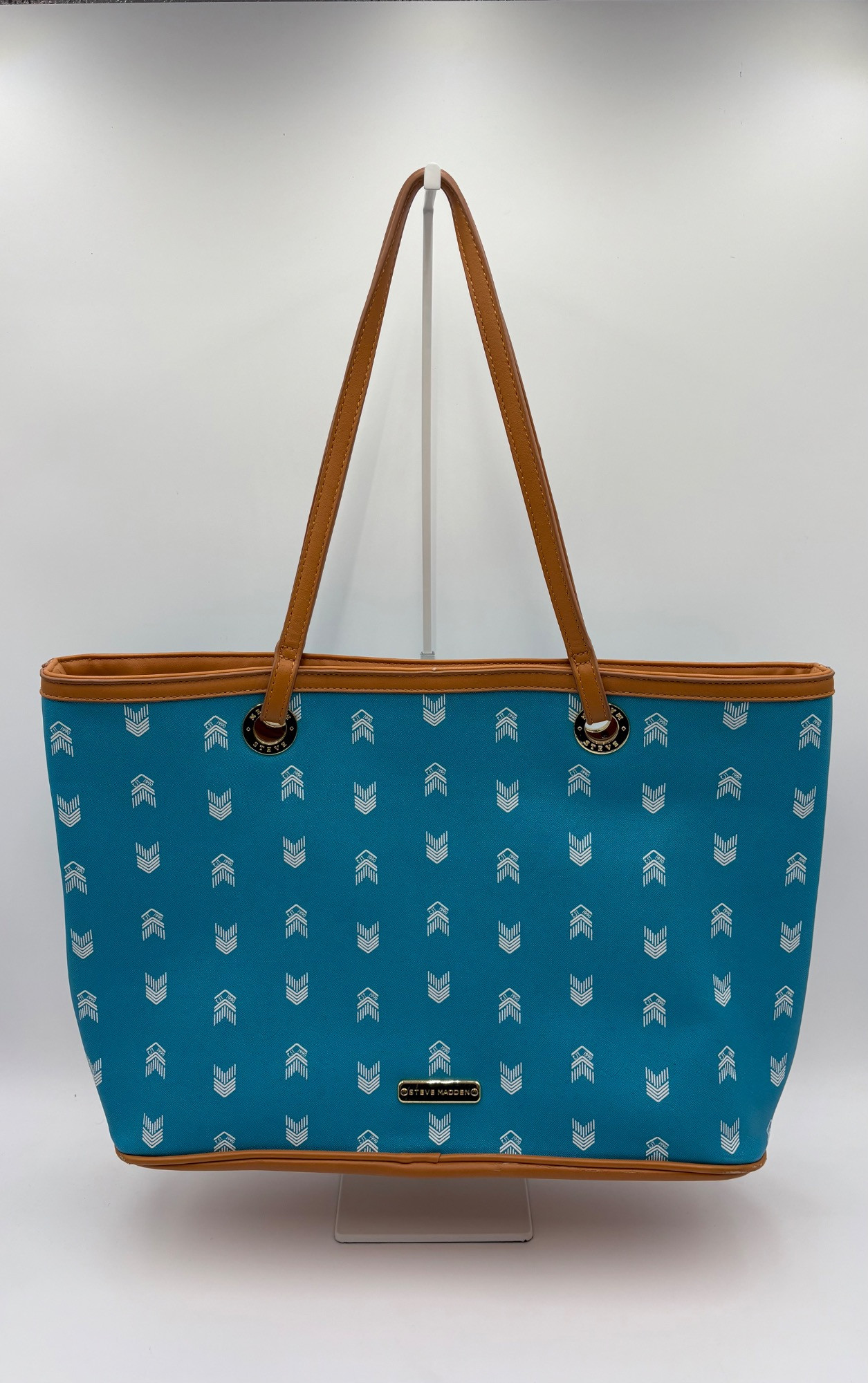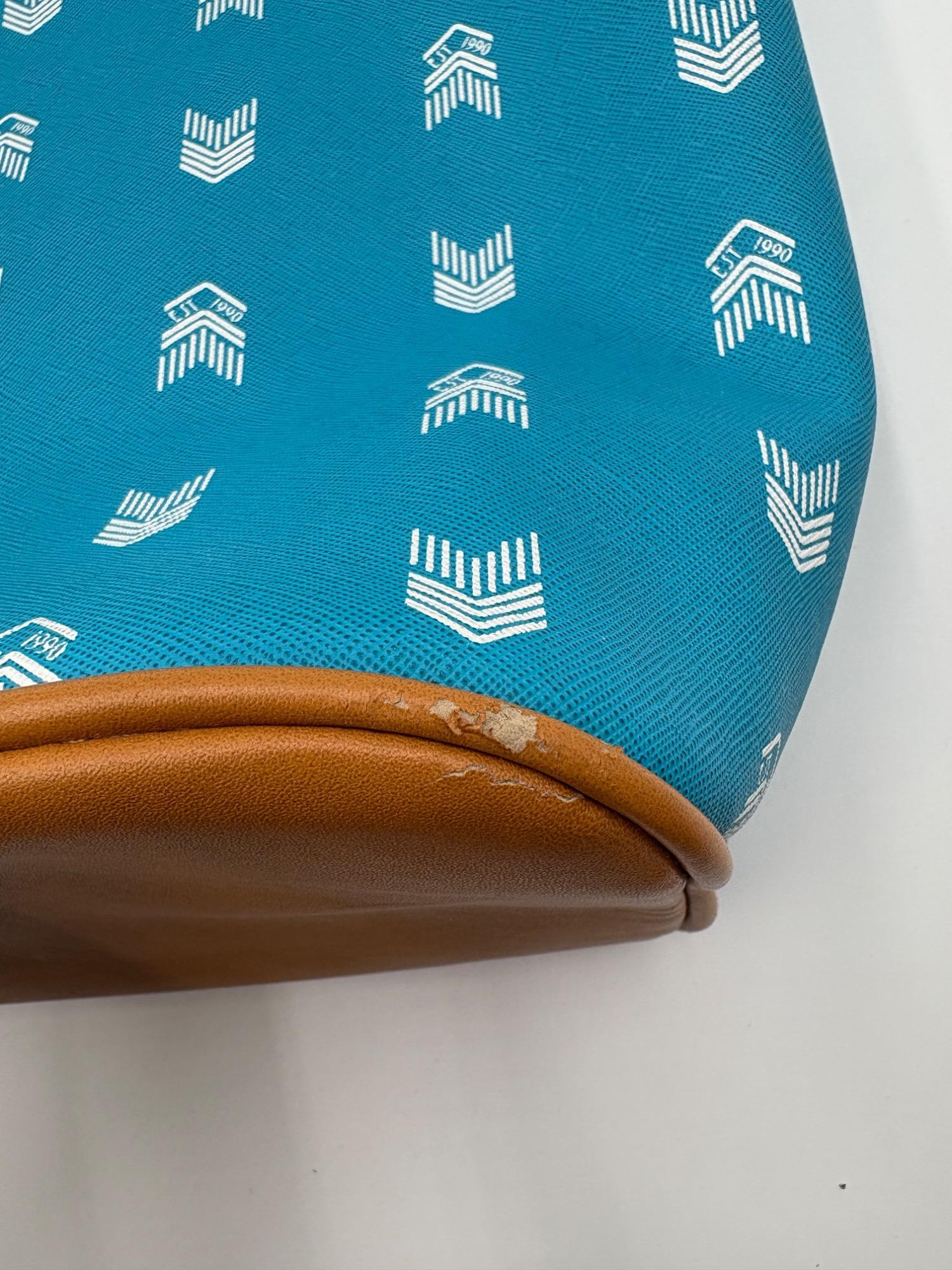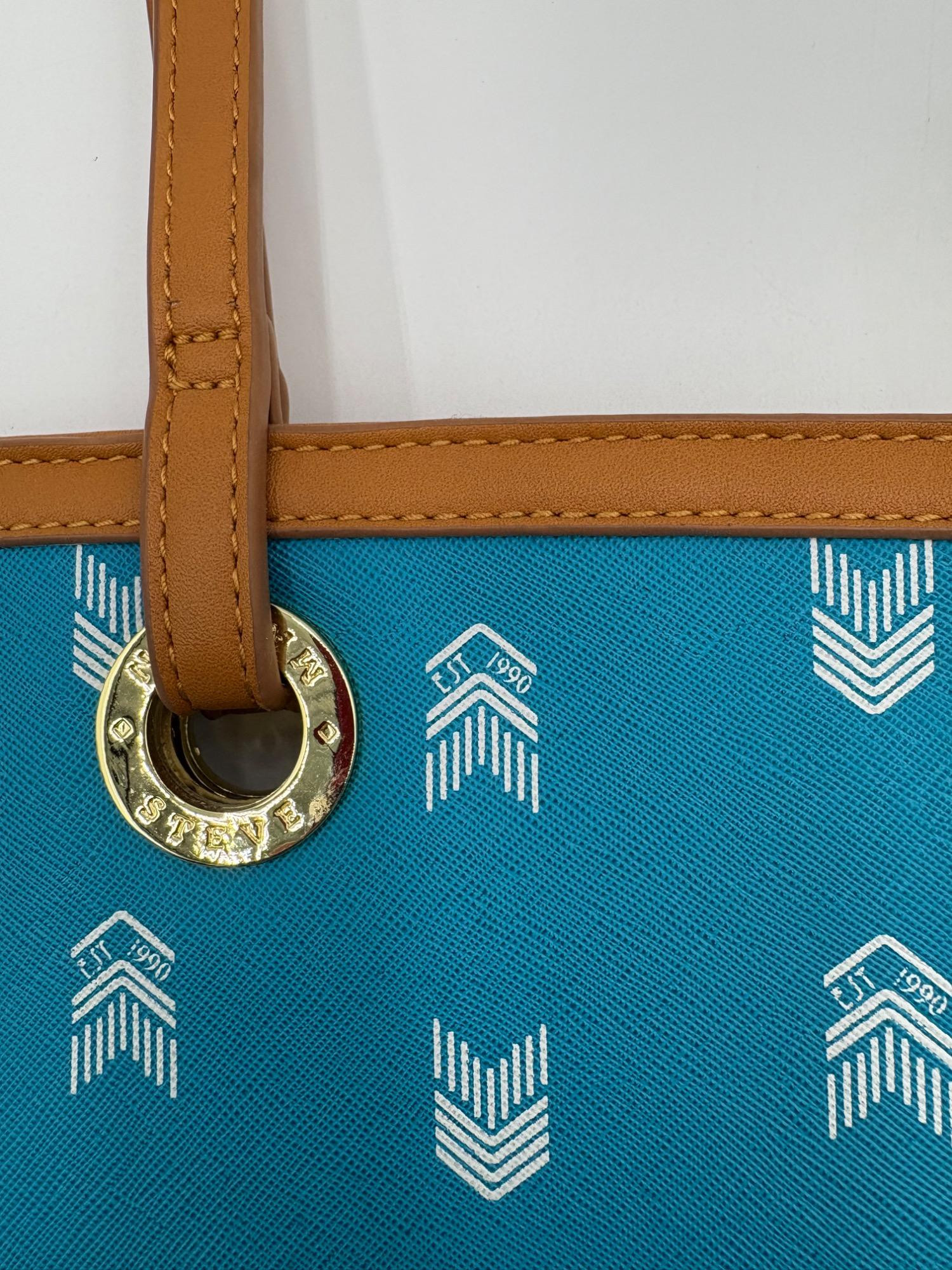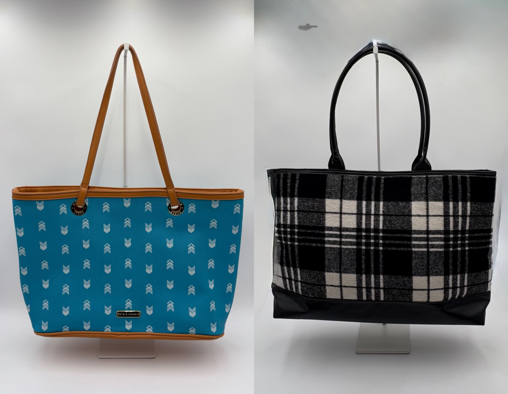 Pair of totes in good condition from Steve Madden & DSW. Madden tote in turquoise & white vinyl with viny brown trim/bottom, gold hardware, magnetic top closure, herringbone fabric lining, interior zip/slide pockets, and metal logo plate on exterior. Bag is used, but shows little wear except for 2 spots on lower edge - see last 2 photos of this bag. DSW black & white flannel tote with vinyl straps/bottom, magnetic top closure, and single zip pocket in black fabric interior lining. In good used condition with some wear flaws at lower corners & straps. See last 3 photos of this bag. Madden bag measures 12" H x 16" W with 9" drop from top of straps to top center of bag. DSW bag measures 13" H x 17.5" W with 11" drop from top of straps to top center of bag.