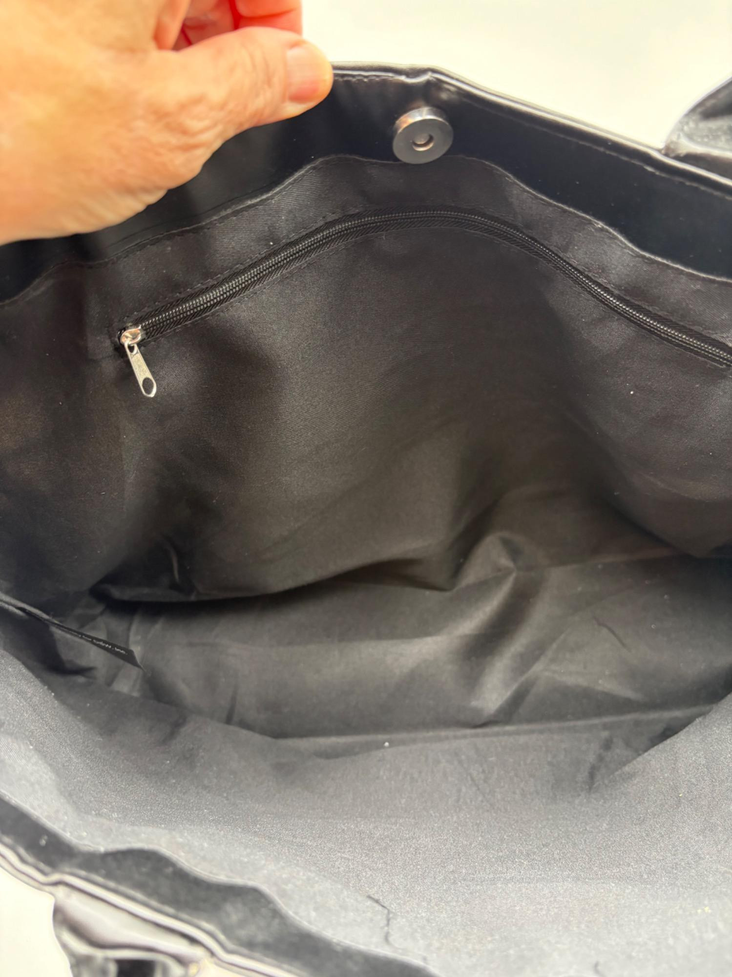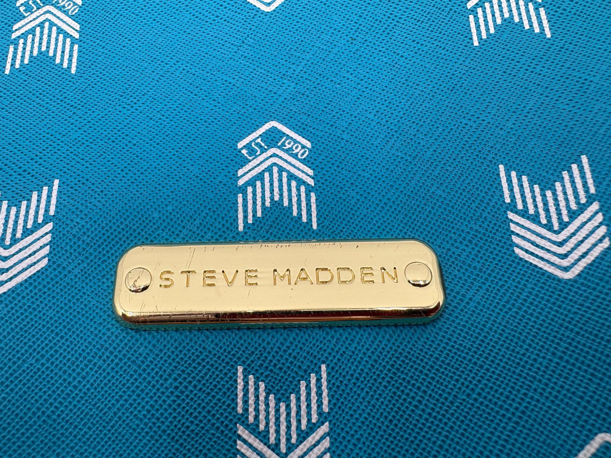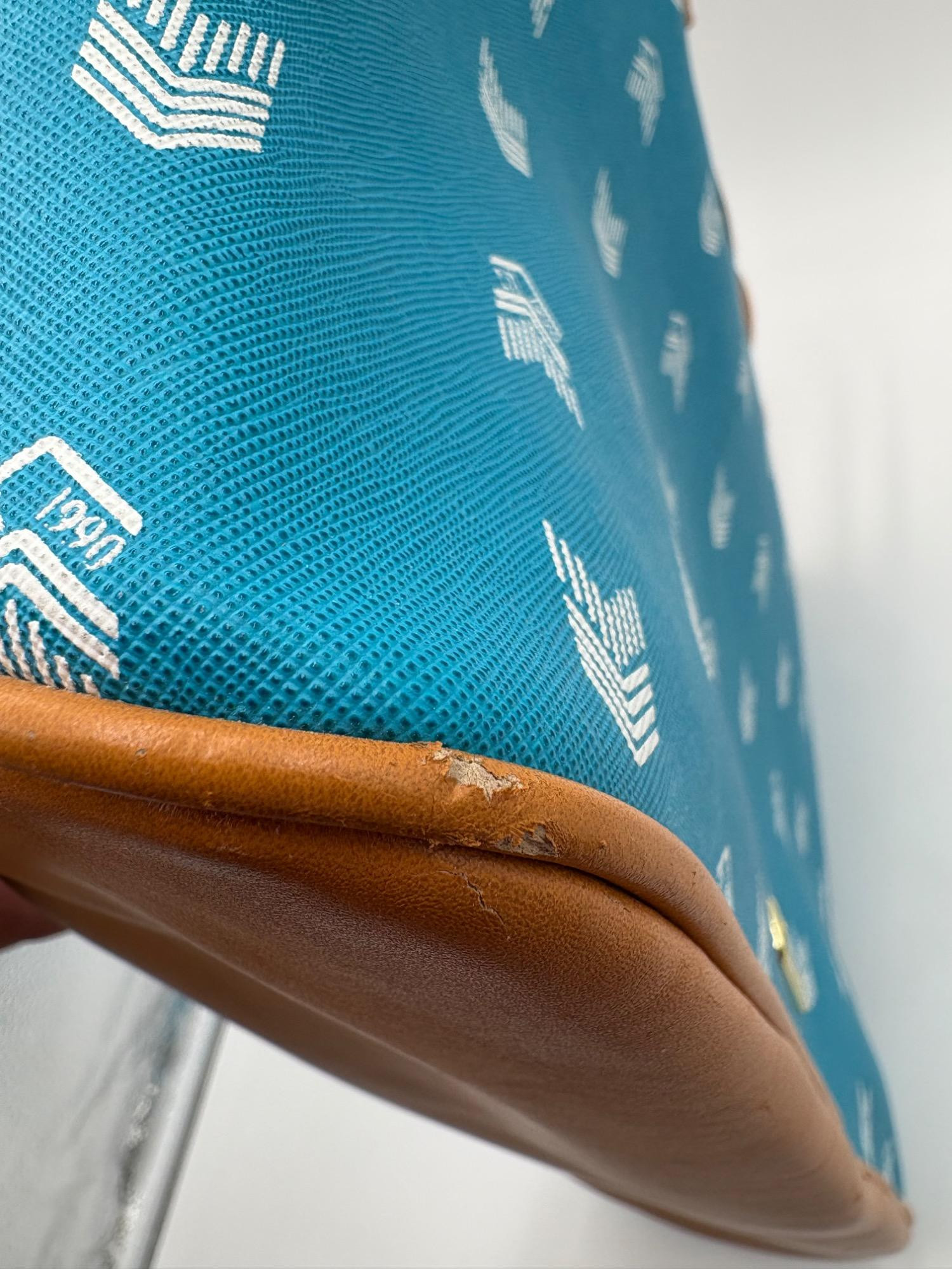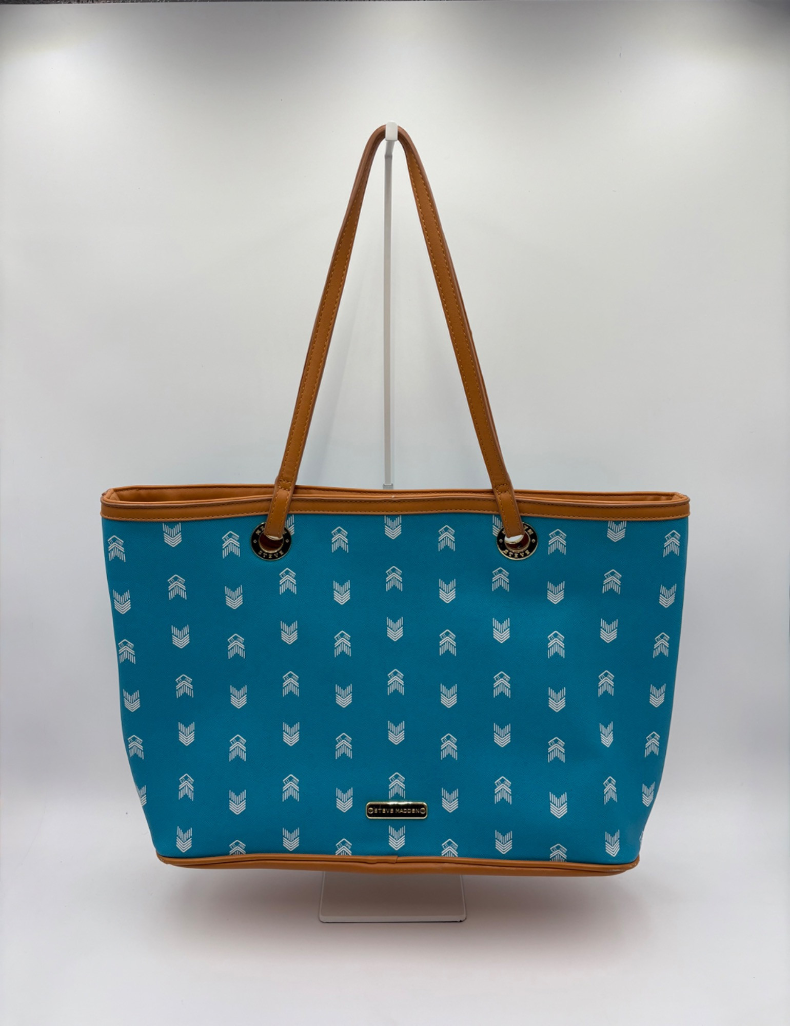 Pair of totes in good condition from Steve Madden & DSW. Madden tote in turquoise & white vinyl with viny brown trim/bottom, gold hardware, magnetic top closure, herringbone fabric lining, interior zip/slide pockets, and metal logo plate on exterior. Bag is used, but shows little wear except for 2 spots on lower edge - see last 2 photos of this bag. DSW black & white flannel tote with vinyl straps/bottom, magnetic top closure, and single zip pocket in black fabric interior lining. In good used condition with some wear flaws at lower corners & straps. See last 3 photos of this bag. Madden bag measures 12" H x 16" W with 9" drop from top of straps to top center of bag. DSW bag measures 13" H x 17.5" W with 11" drop from top of straps to top center of bag.
